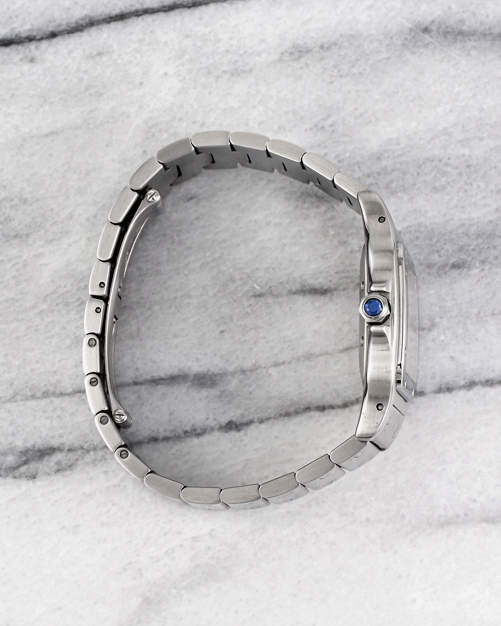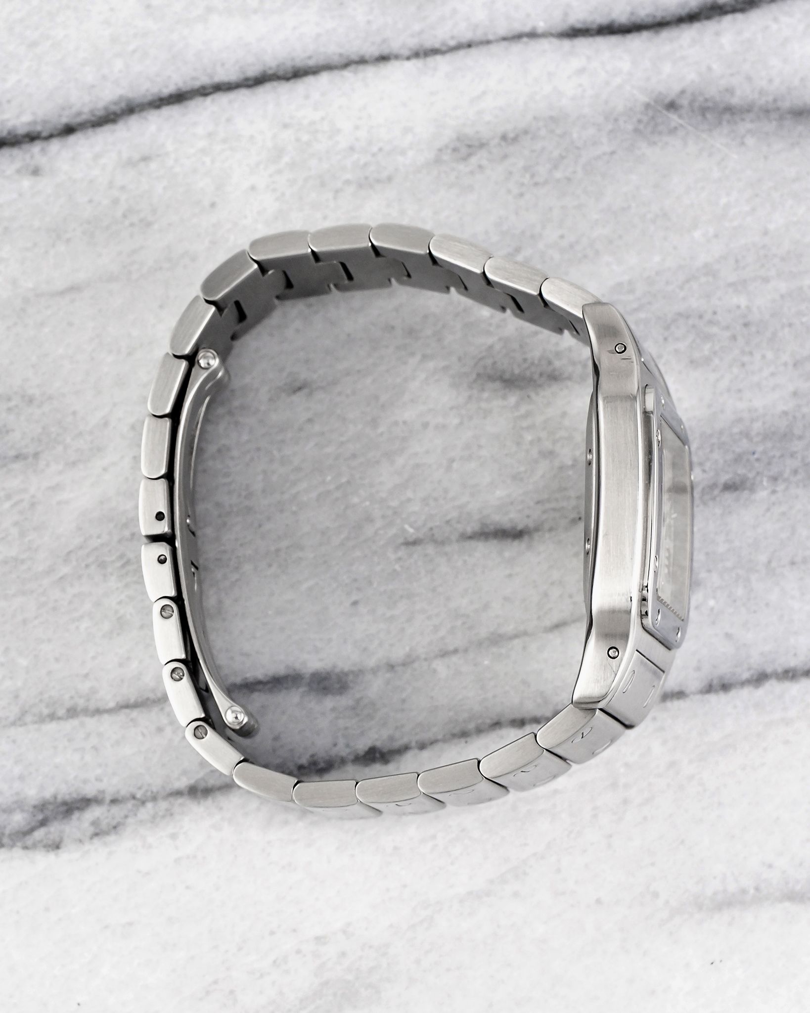 Here's a vintage Cartier Santos reference 2319 automatic with a guilloché dial on a steel bracelet from the 1990s. Keeps great time and is fully functional. Measurements include a 29x41mm steel case and 18mm lug width. It's on a Cartier bracelet that fits up to a 7 inch wrist. The bracelet has a little stretch to it, due to wear. Date window at 6 o'clock. Clean guilloché dial with Roman numerals and blued hands. Steel case and caseback. All parts are original including the signed Cartier crown, dial, movement, and caseback. Both the dial and case are in great cosmetic, untouched condition.