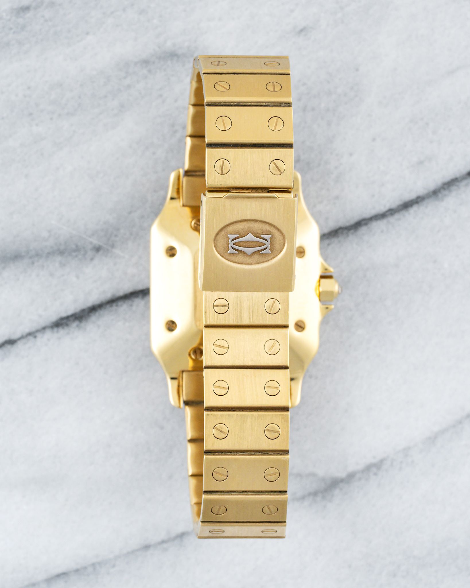 Here's a vintage Cartier Santos automatic reference number 2960 in 18k yellow gold with a factory champagne diamond dial from the 1980s. Keeps great time and is fully functional. Measurements include a 29x41mm square case size and 18mm lug width. Integrated bracelet with Gold screws that fit up to a 7 inch wrist. Yellow gold bezel. Diamond cabochon crown. Matching diamond markers, bezel, and diamond screws in the bracelet. Quickset date function at 3 a clock. The dial is clean from any marks or scratches. Stainless steel case and caseback. Great condition on both the case and bracelet. The bracelet and case shimmer, depending on the light. Matching screws on the bezel and bracelet. Drilled lug holes. Makes for a great watch for both men and women. Unusual to find a Santos like this! A nice thin profile. All the parts are original including the crown, dial, movement, and caseback. Both the dial and case are in great cosmetic, untouched condition.