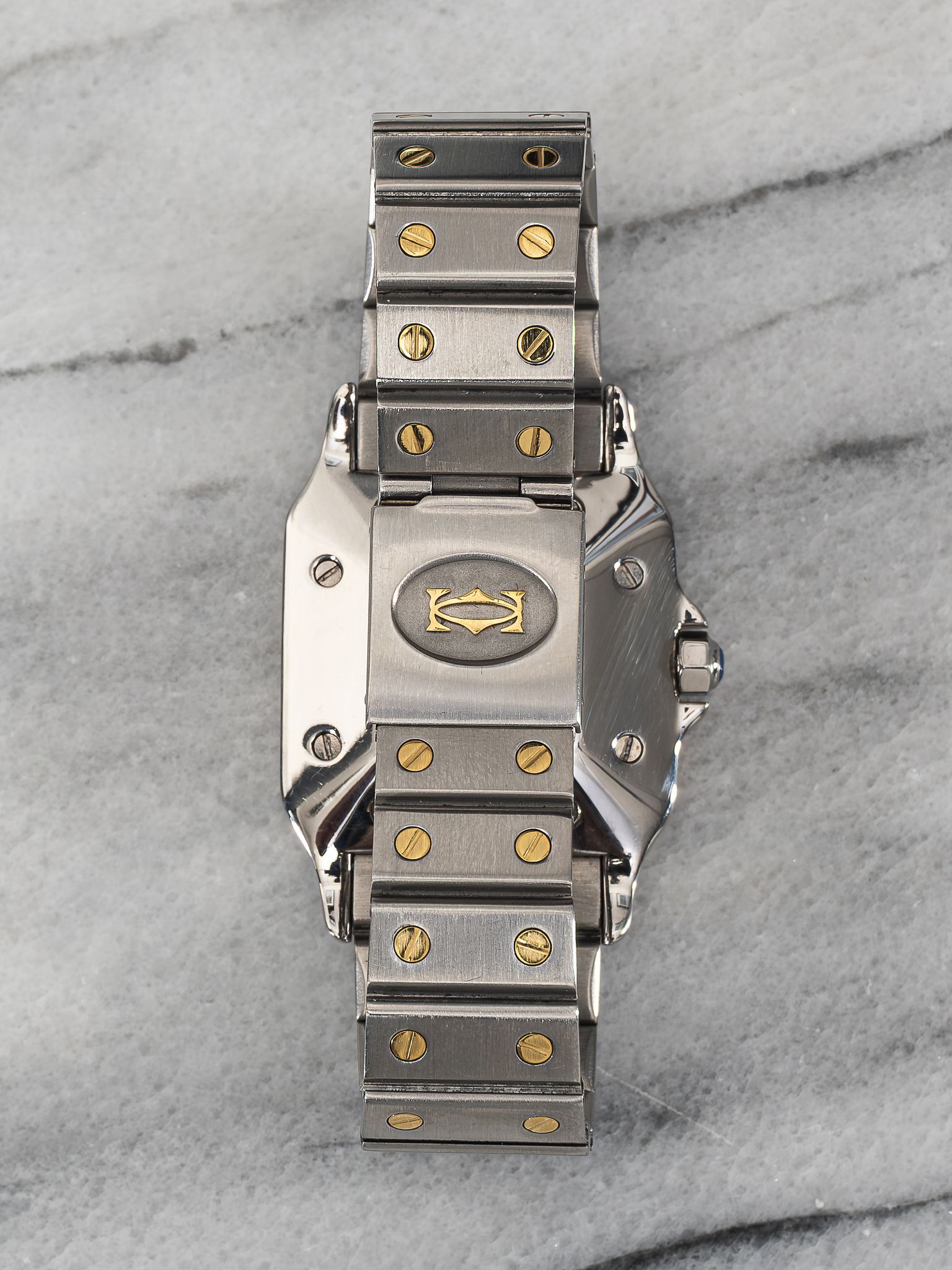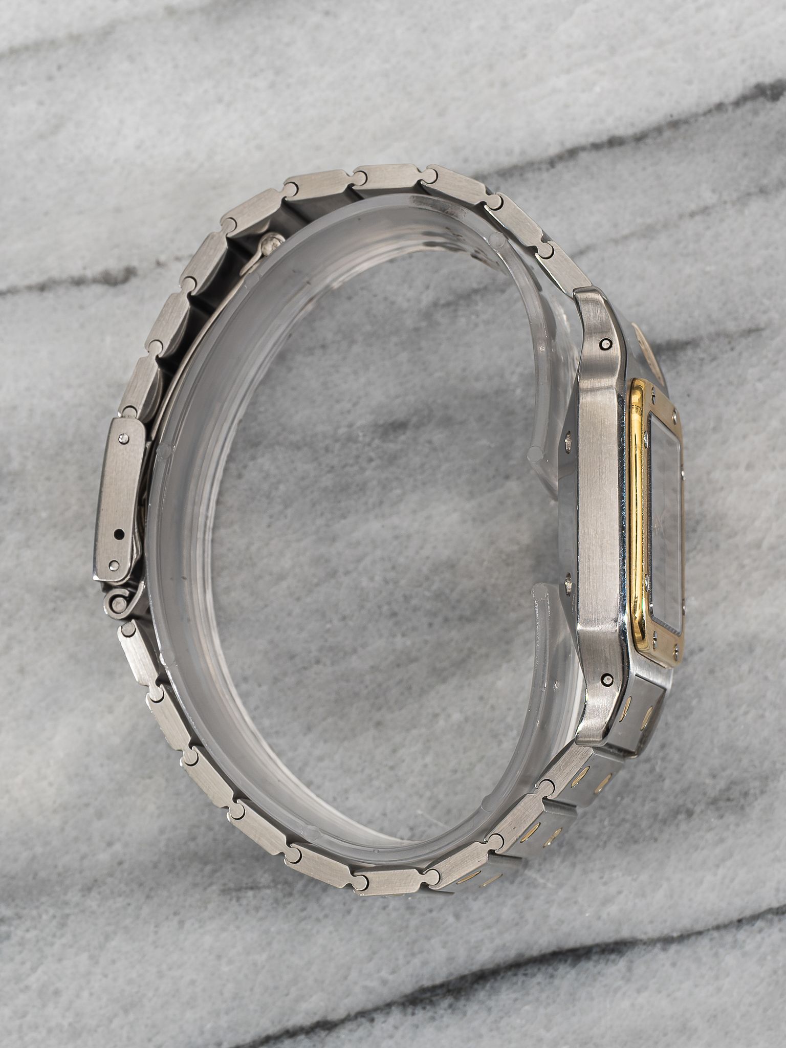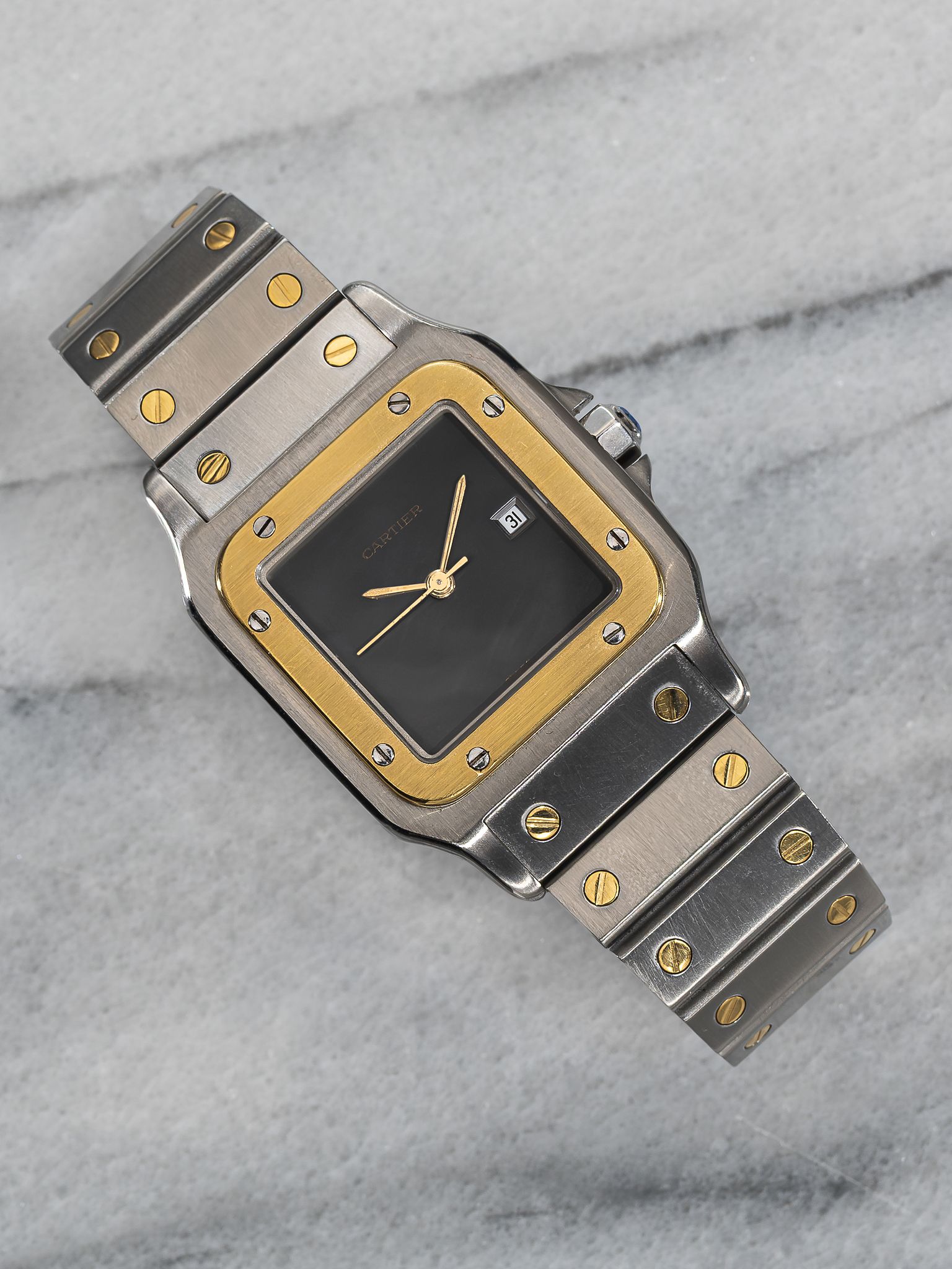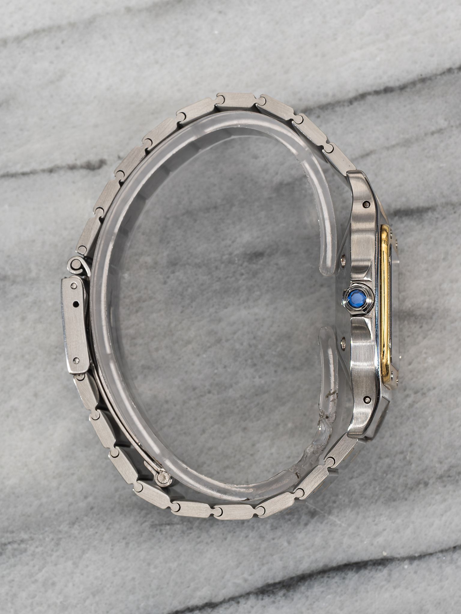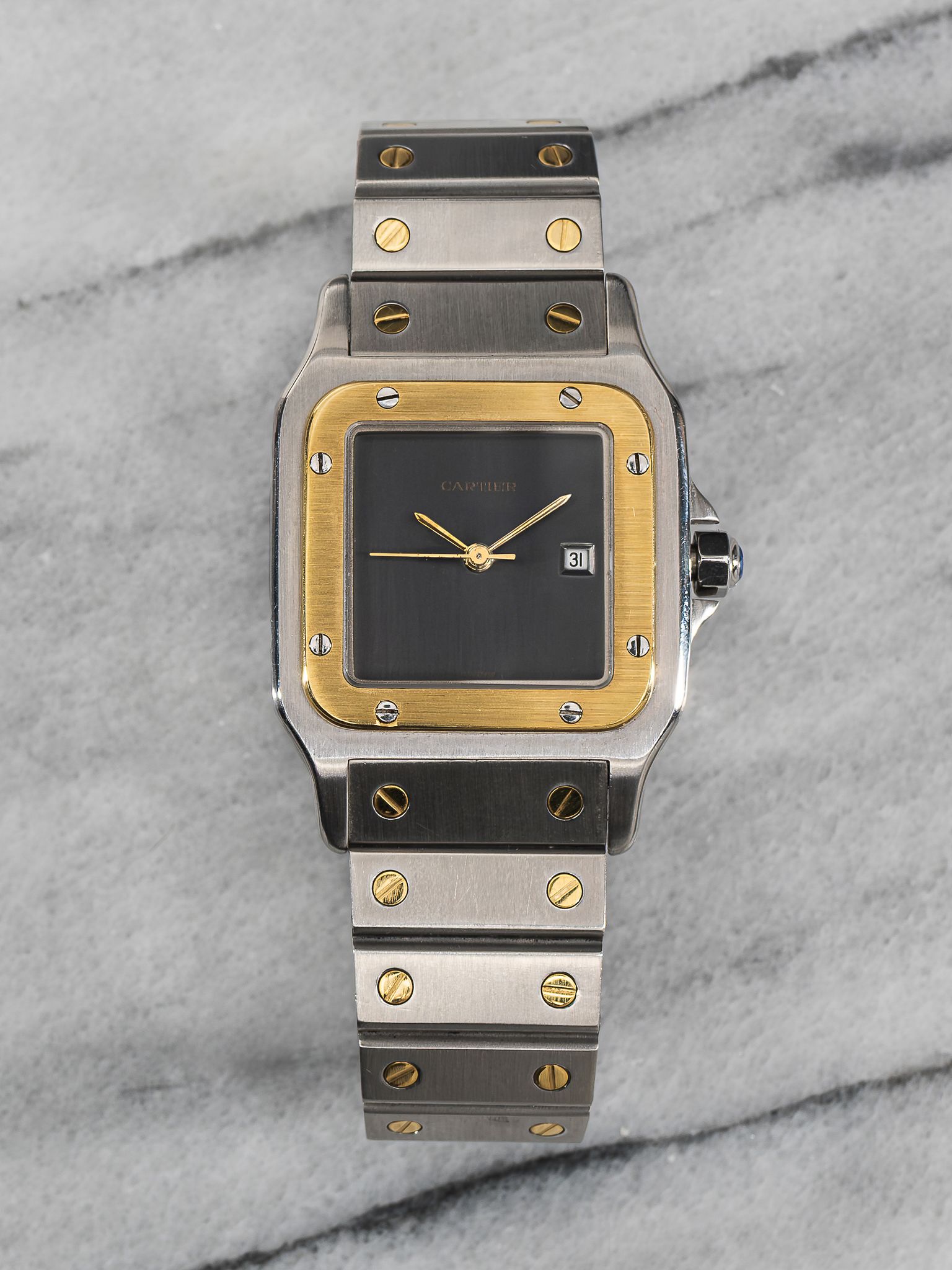 Here's a vintage Cartier Santos reference 2961in two tone automaticwith a ghost grey dial from the 1980s. Measurements include a 29x41mm case and a bracelet that fits up to a 6.75 inch wrist. All parts including the crown, dial, movement, and caseback are original.