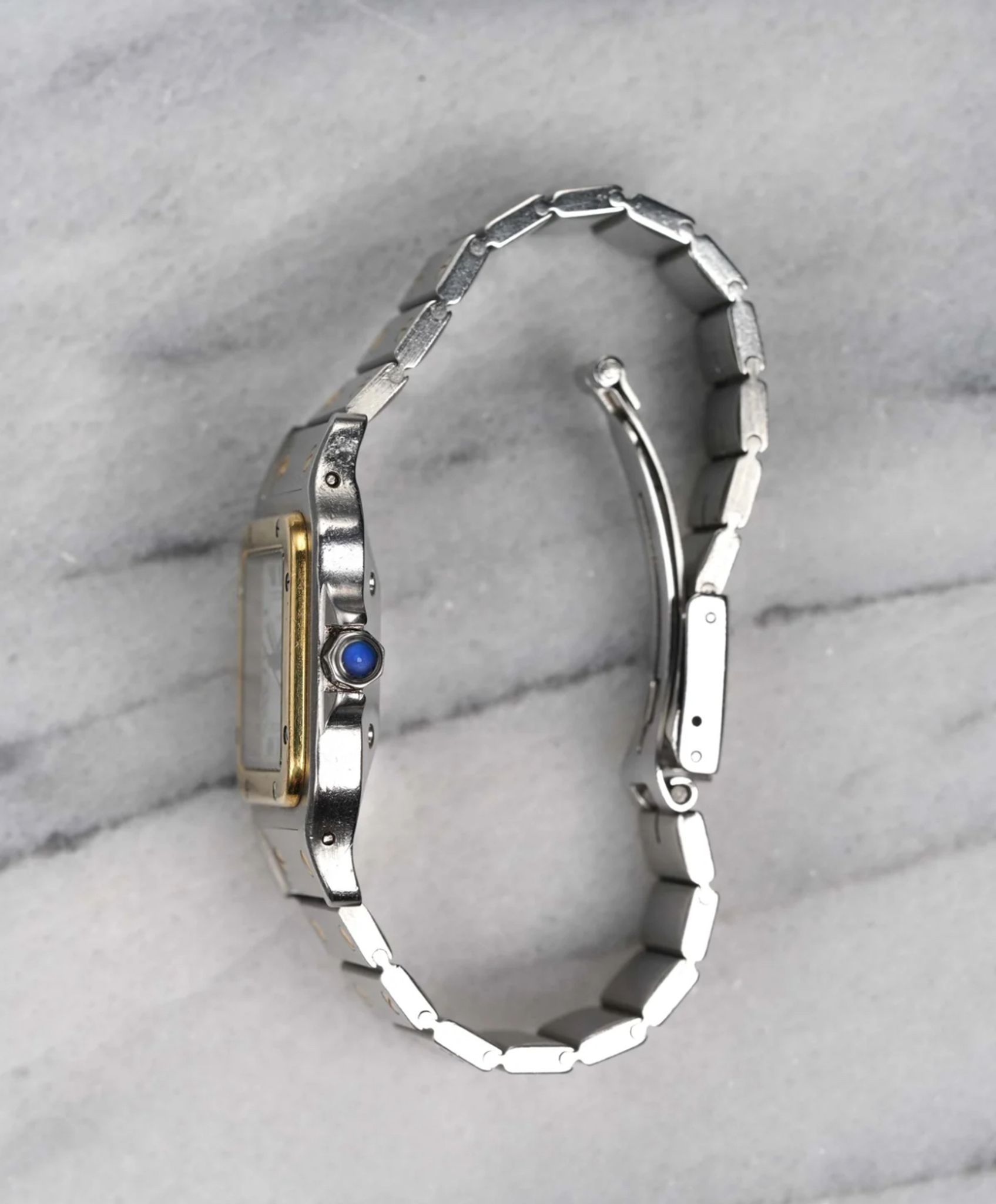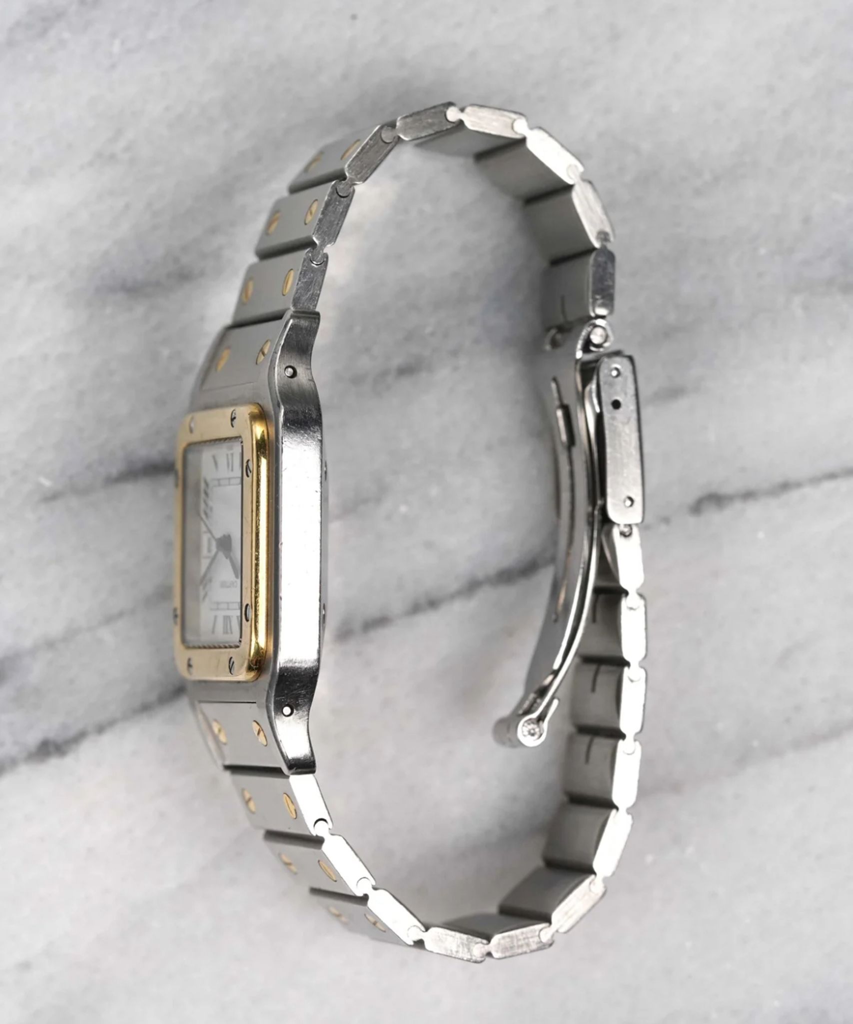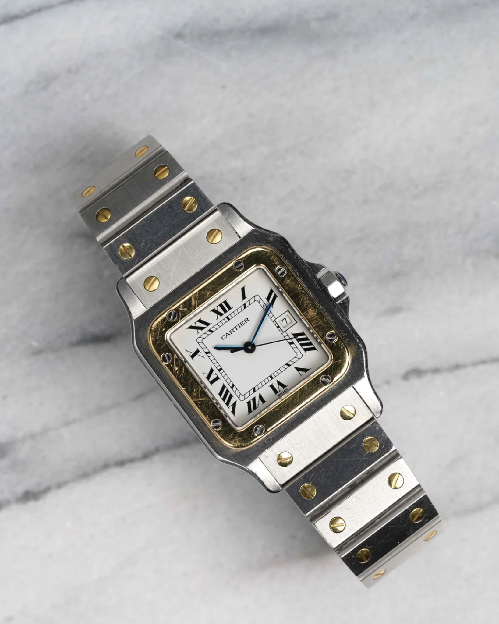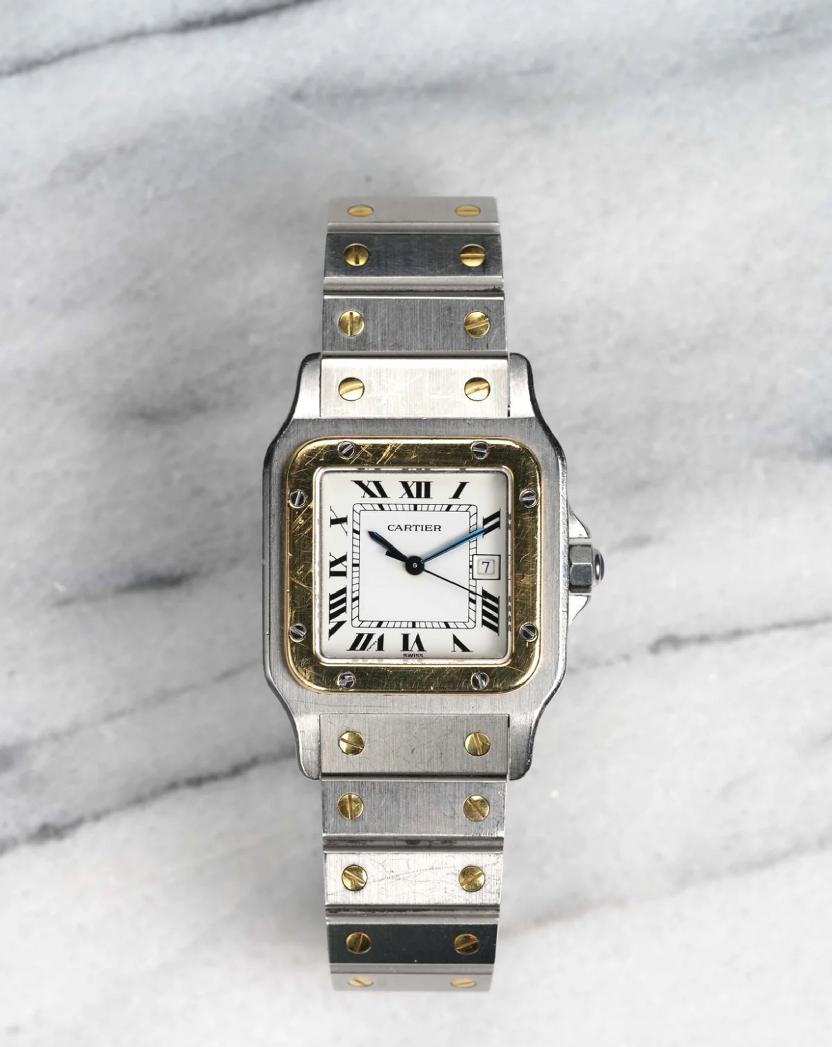 Here's a vintage Cartier Santos two tone automatic with a white roman numeral dial from the late 80s, early 90s. Comes with warranty/ guarantee papers. Keeps great time and is fully functional. Measurements include a 29x41mm square case size and 18mm lug width. Integrated bracelet with Gold screws that fit up to a 7 inch wrist. Yellow gold bezel. Blue cabochon crown. White dial with blue hands. Matching black roman numerals and minute track. Quickset date function at 3 a clock. The dial is clean from any marks or scratches. Stainless steel case and caseback. Nice unpolished finishing on the case and bracelet. The bracelet and case shimmer, depending on the light. Matching screws on the bezel and bracelet. Drilled lug holes. Makes for a great watch for both men and women. A nice thin profile. All the parts are original including the crown, dial, movement, and caseback. Both the dial and case are in great cosmetic, untouched condition.
