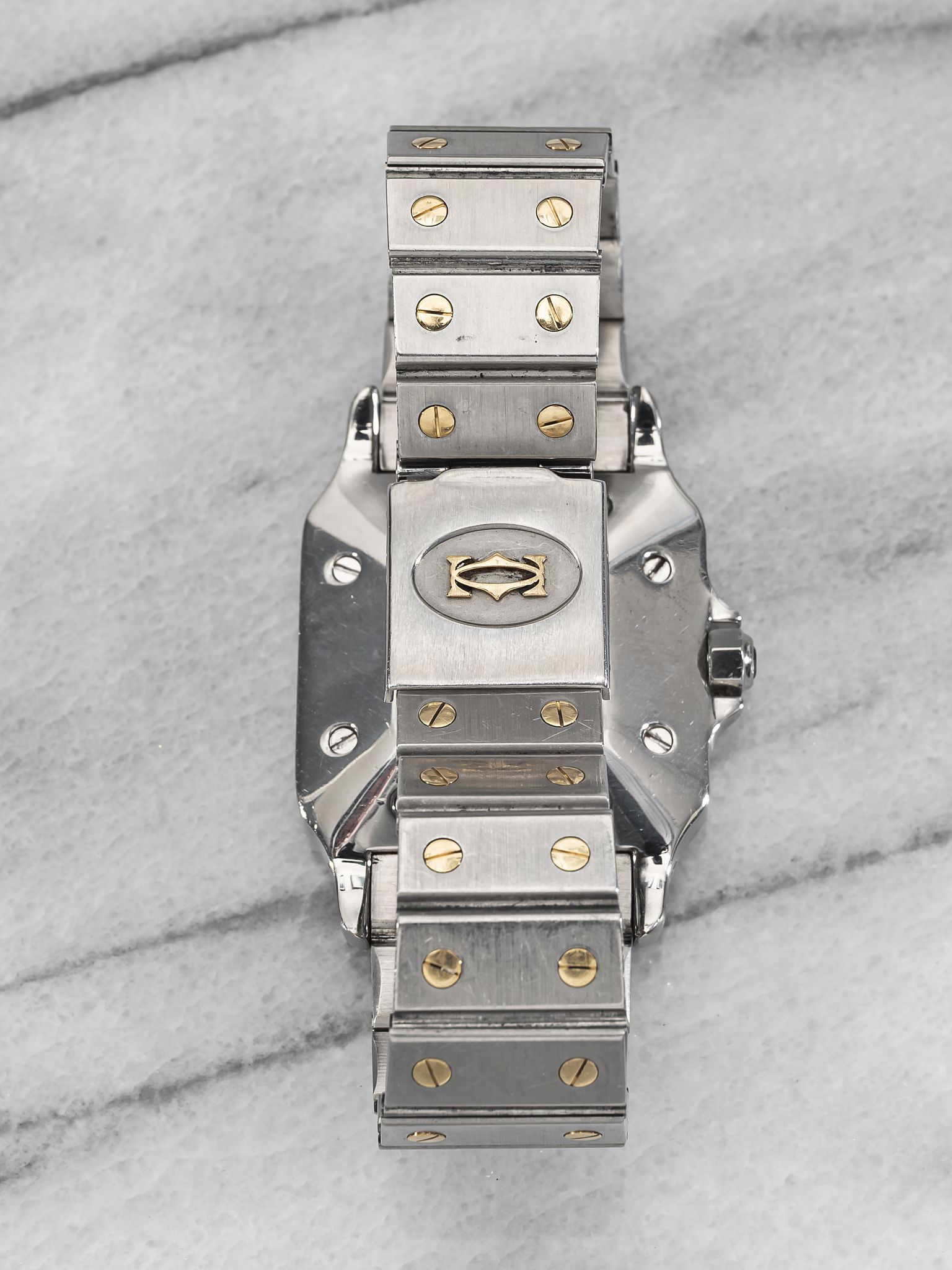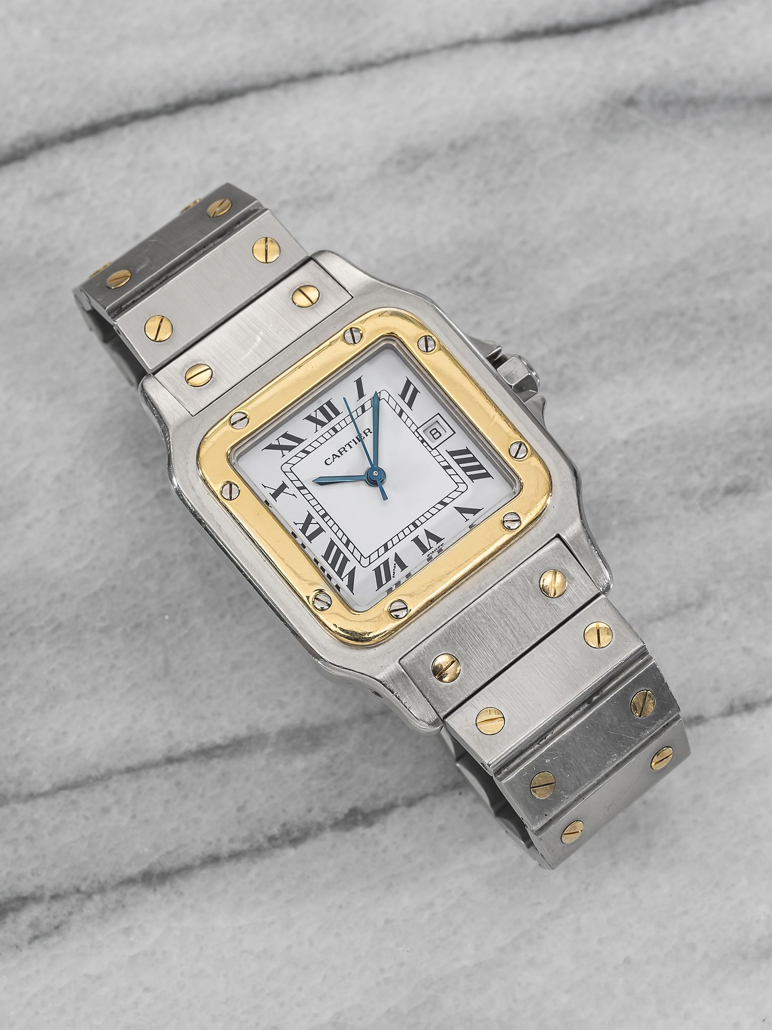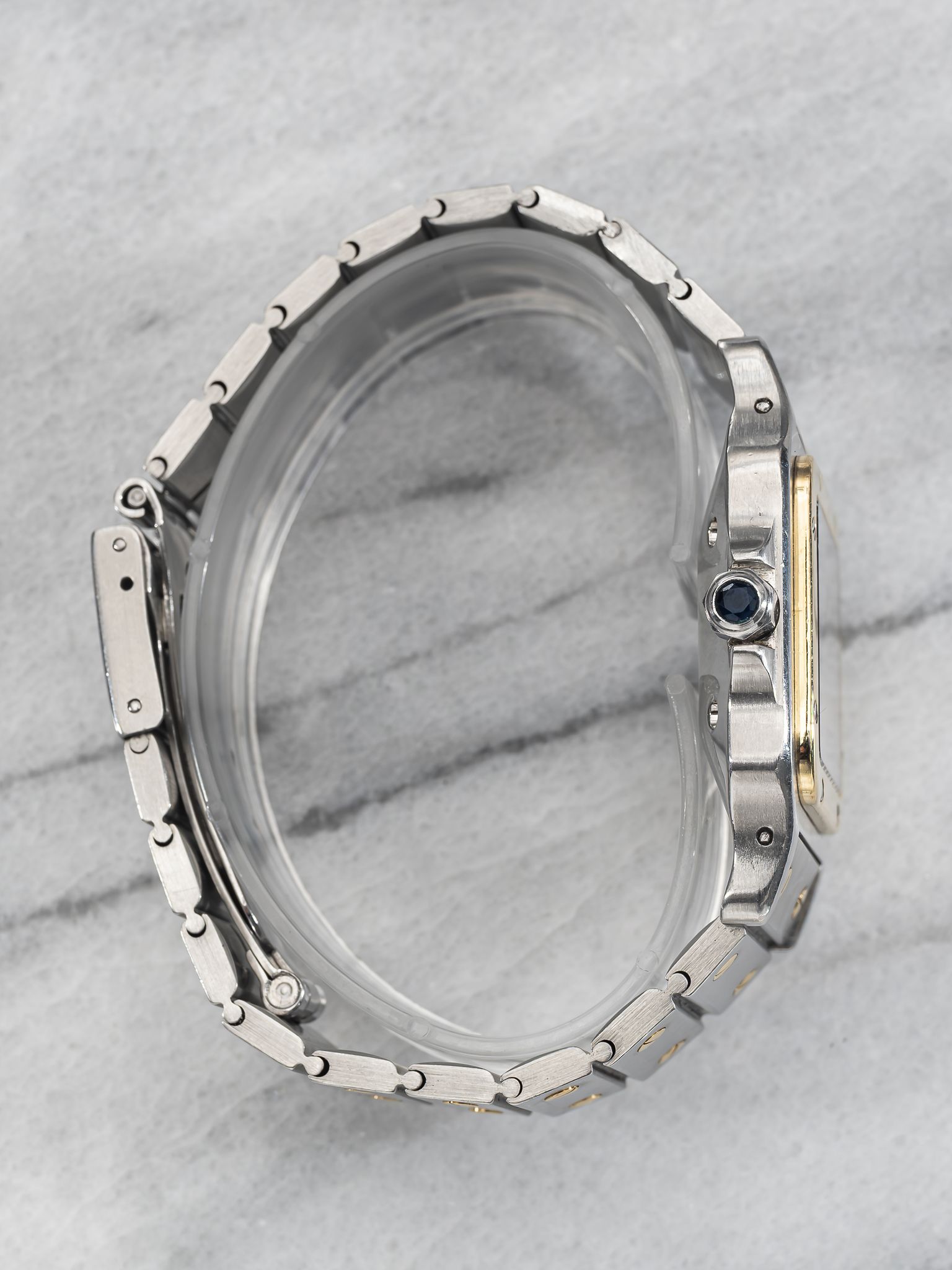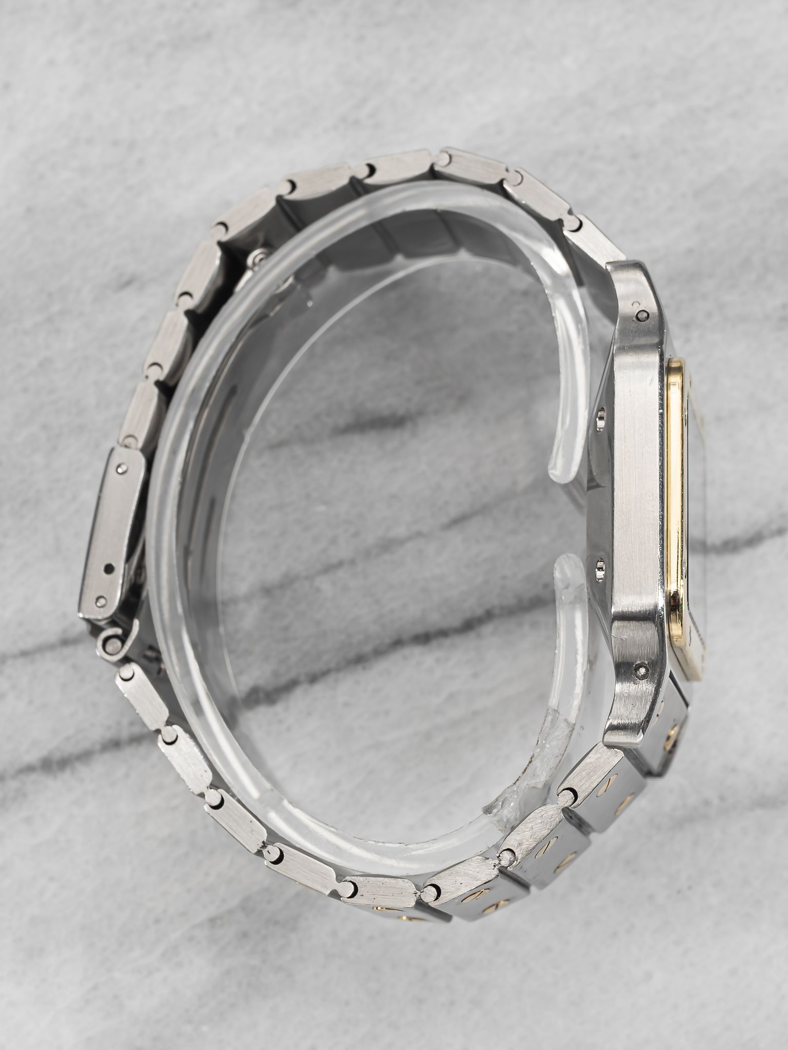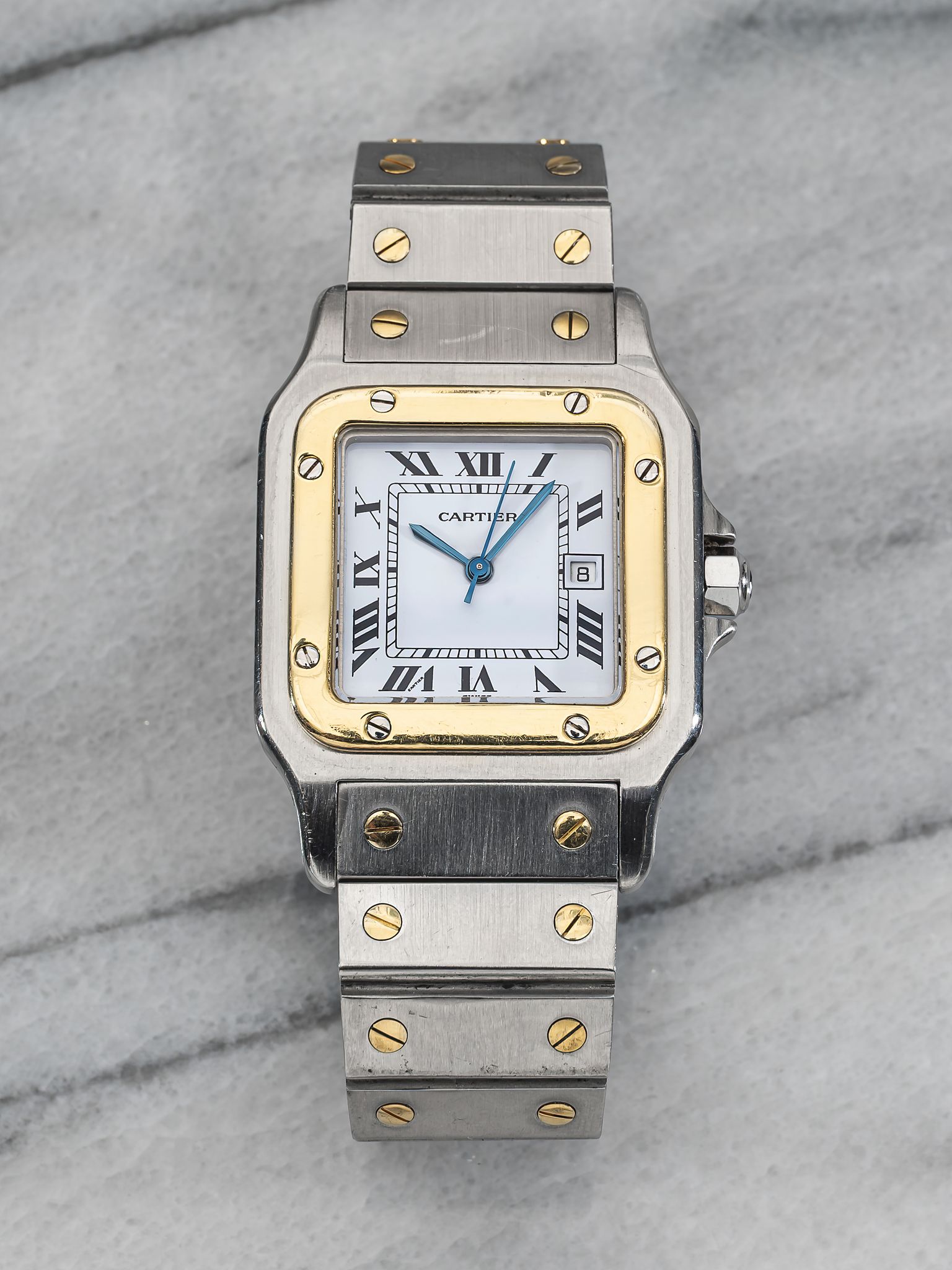 Here's a vintage Cartier Santos reference 2961 two tone automatic with a white Roman numeral dial from the 1980s. Measurements include a 29x41mm case and the bracelet fits up to a 7 inch wrist. All parts including the crown, dial, movement, and caseback are original.