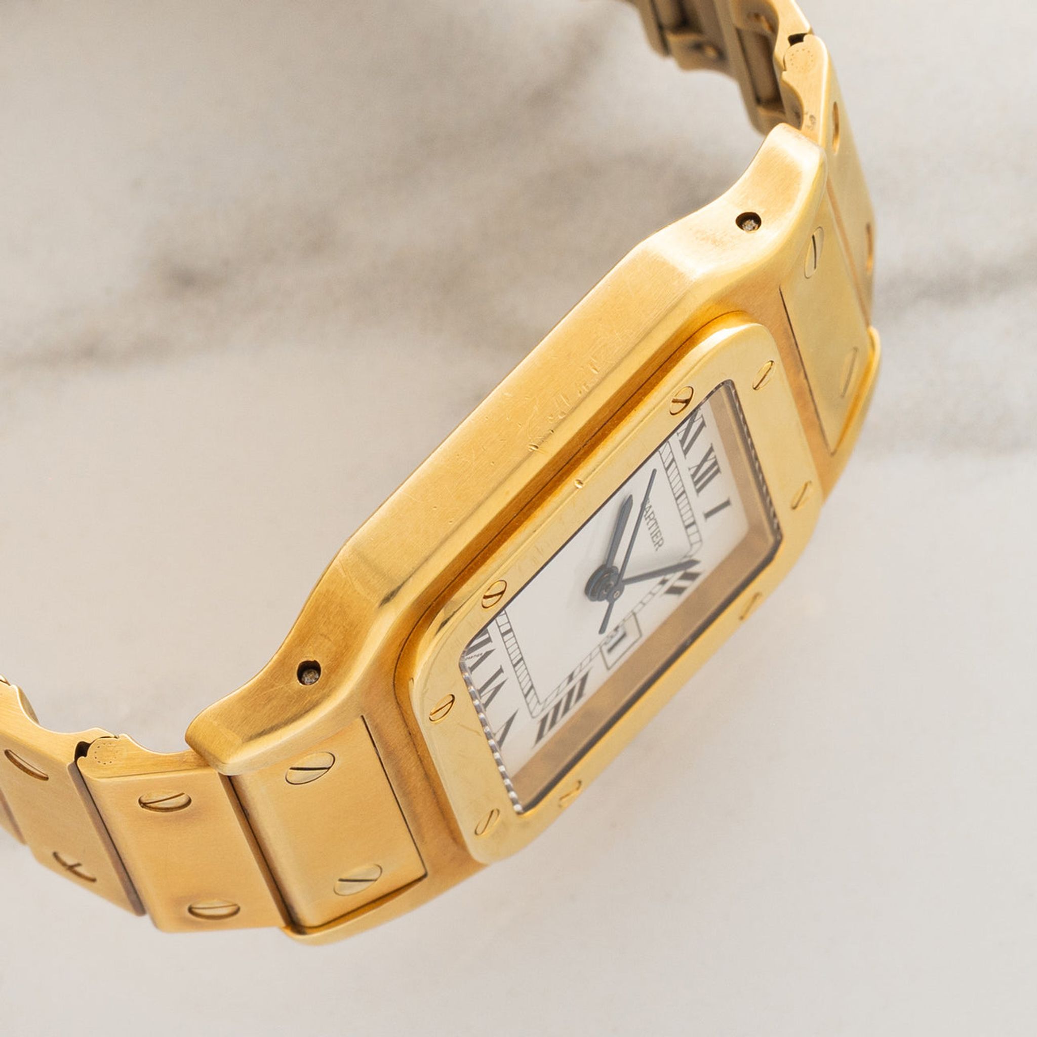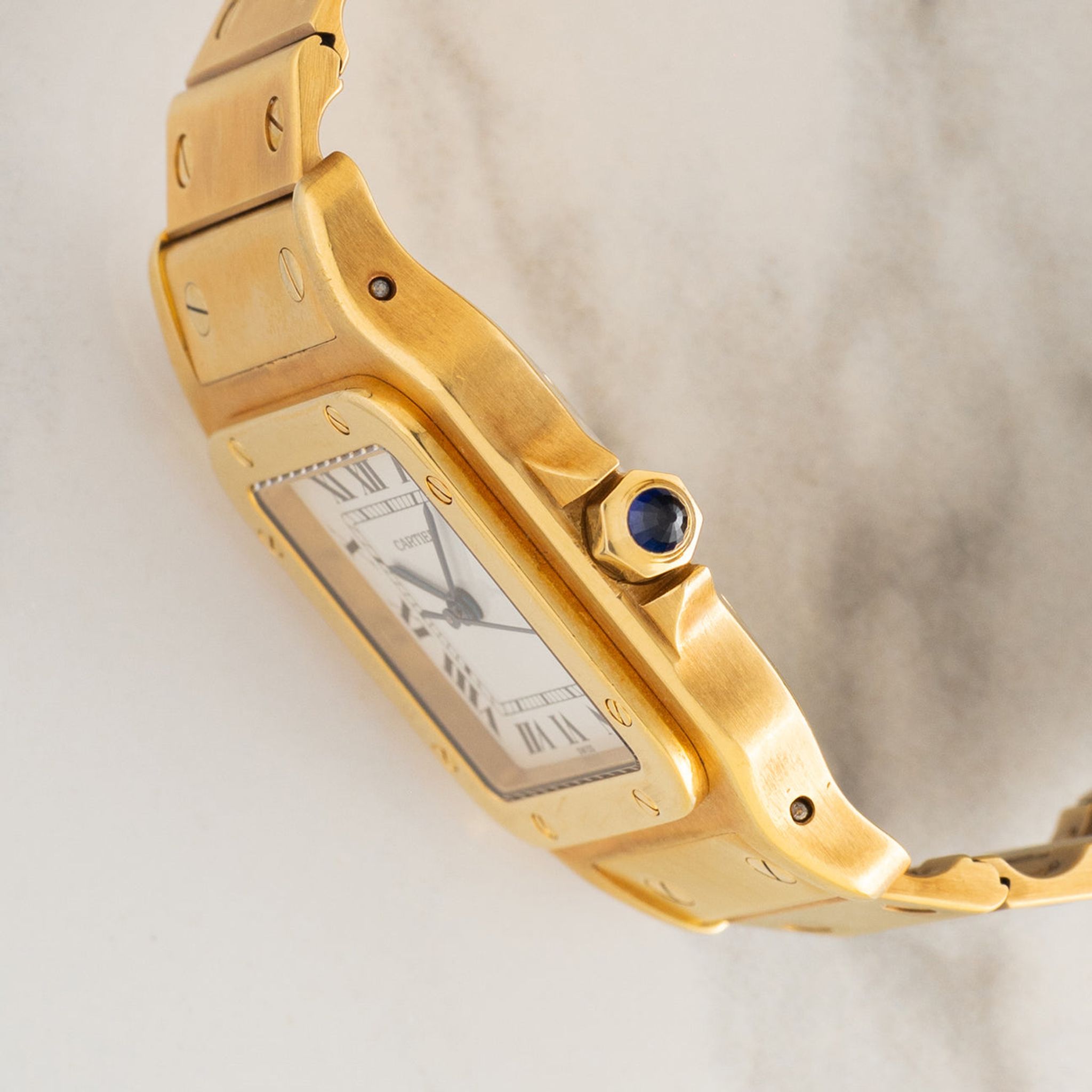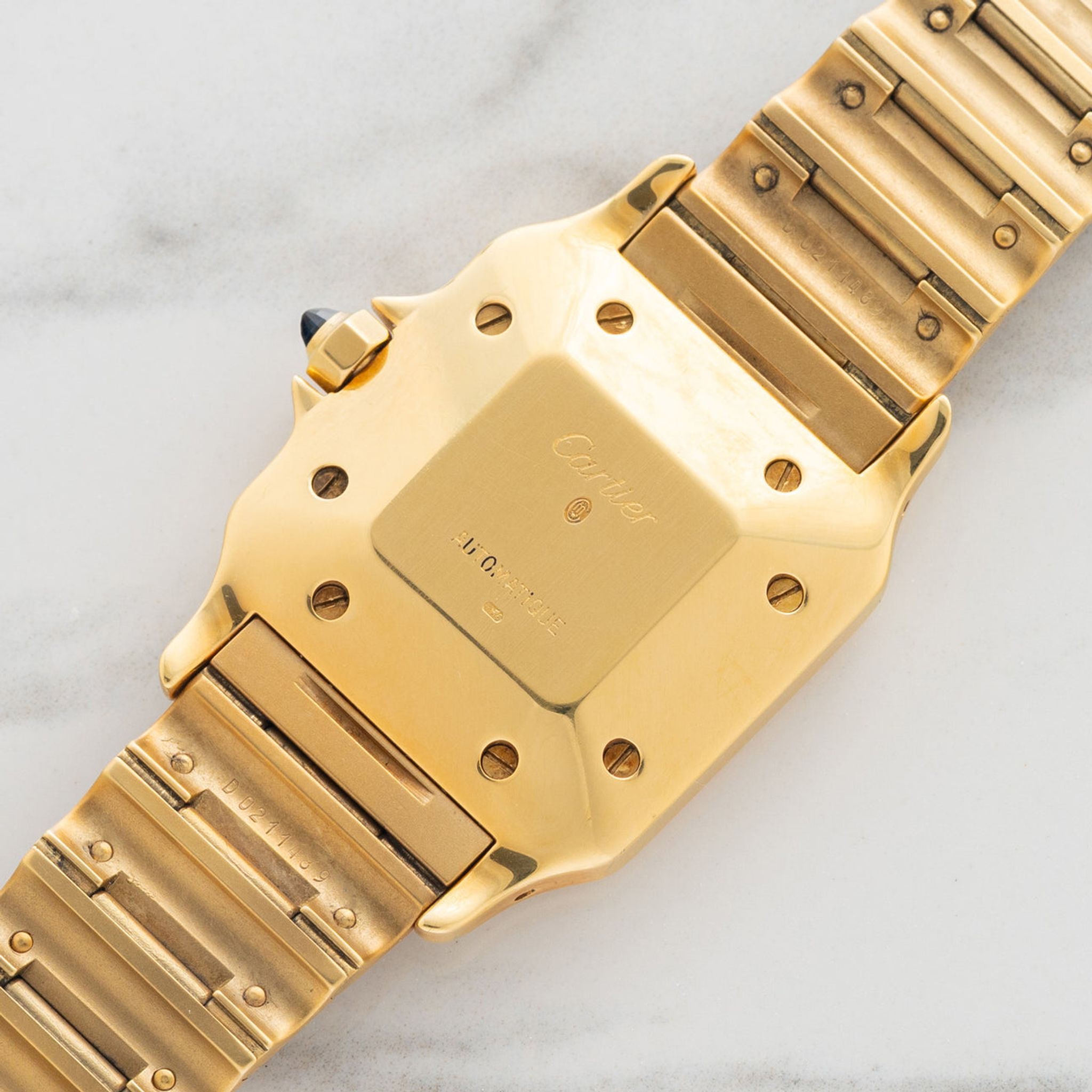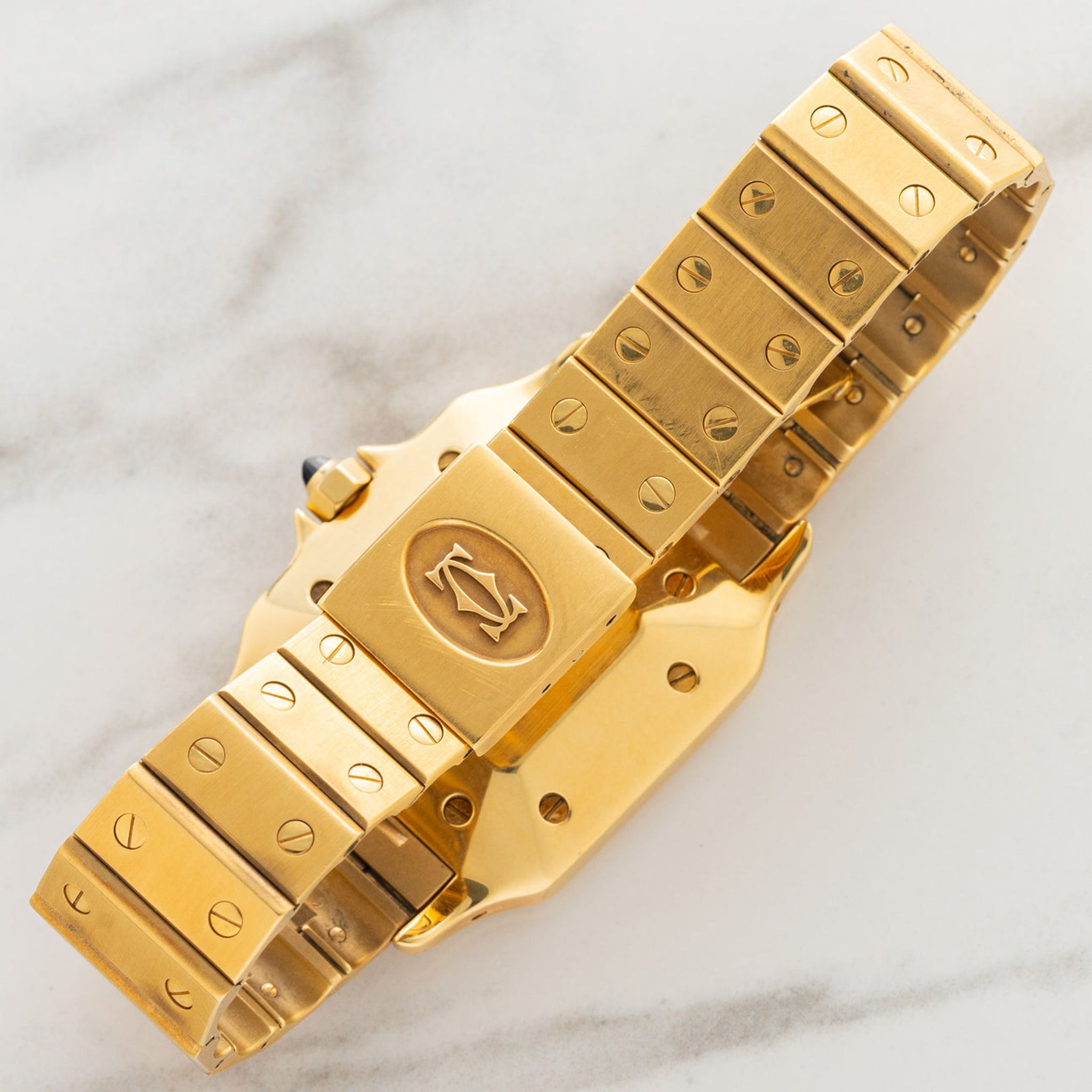 A much more seldom seen ref. 2960 Carrée "Massif" however is the 18k example we see here. Finding one in the right condition is getting harder as each year passes but worth the pursuit. This model is a true gem in yellow gold, elevating its feel on wrist to a unique combination of bold design and refinement. We are thrilled to be able to offer this lovely example which remains in excellent vintage condition. The case is strong with thick and even lugs and retains a strong looking bezel. The dial is also in mint condition and has a beautiful warm and even patina. To top it off, this piece even retains its warranty papers, box, folder and comes with 3 Santos booklets. The bracelet remains tight and will fit an approximate 7.5 inch wrist.