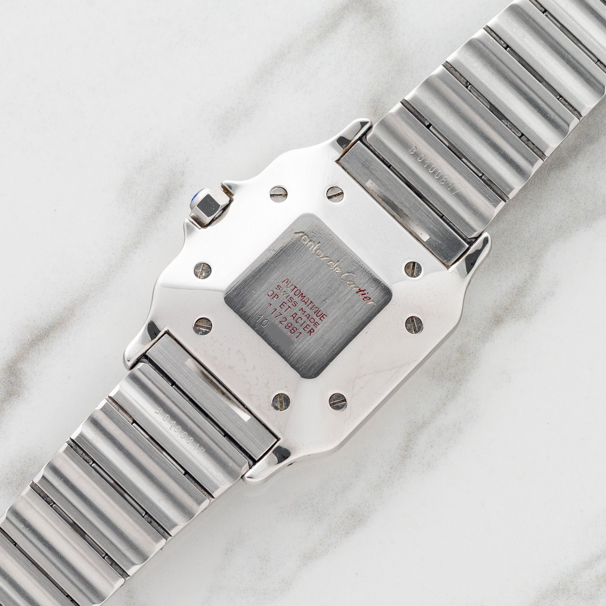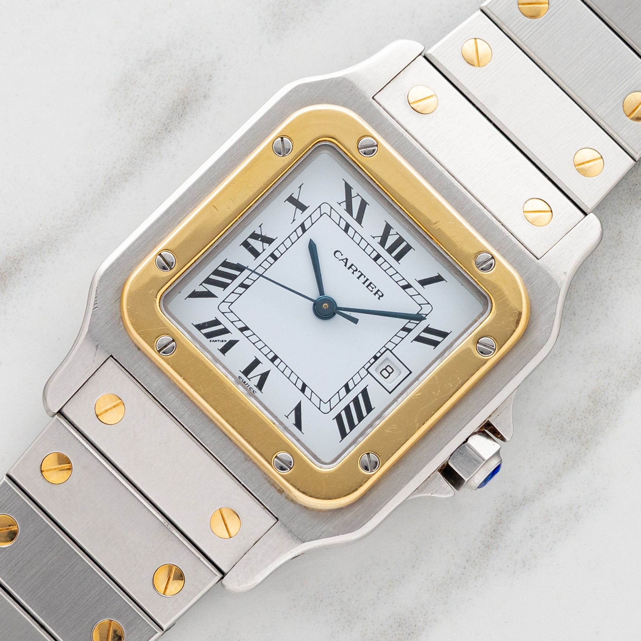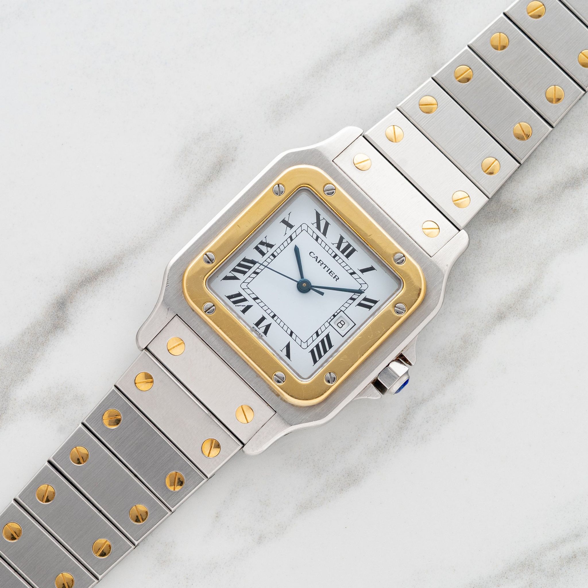 First released in the 70s, the Santos Carrée was Cartier's attempt to offer an accessible sport watch in both two tone (ref. 2961) and in steel (ref. 2960). At 29mm, the Carrée (square in French), case is perfectly sized to be the perfect blend of elegance and sporty. One might argue that today, more than ever, this model is the Rolex Datejust of Cartier. This piece boasts an excellent dial, strong looking case/bezel and bracelet. If you've been hunting for a great example, look no further!