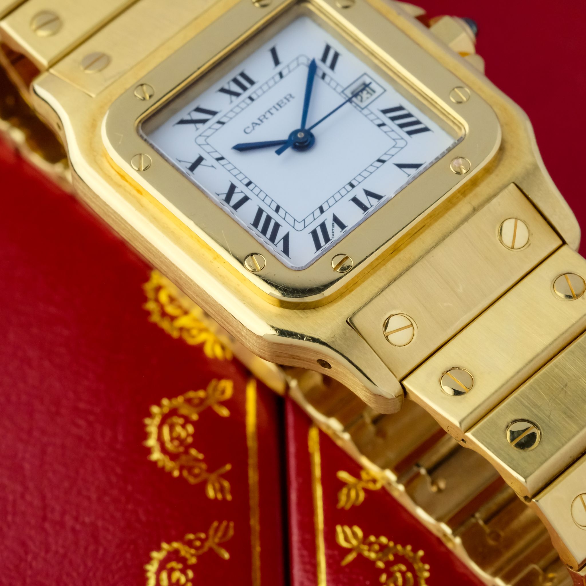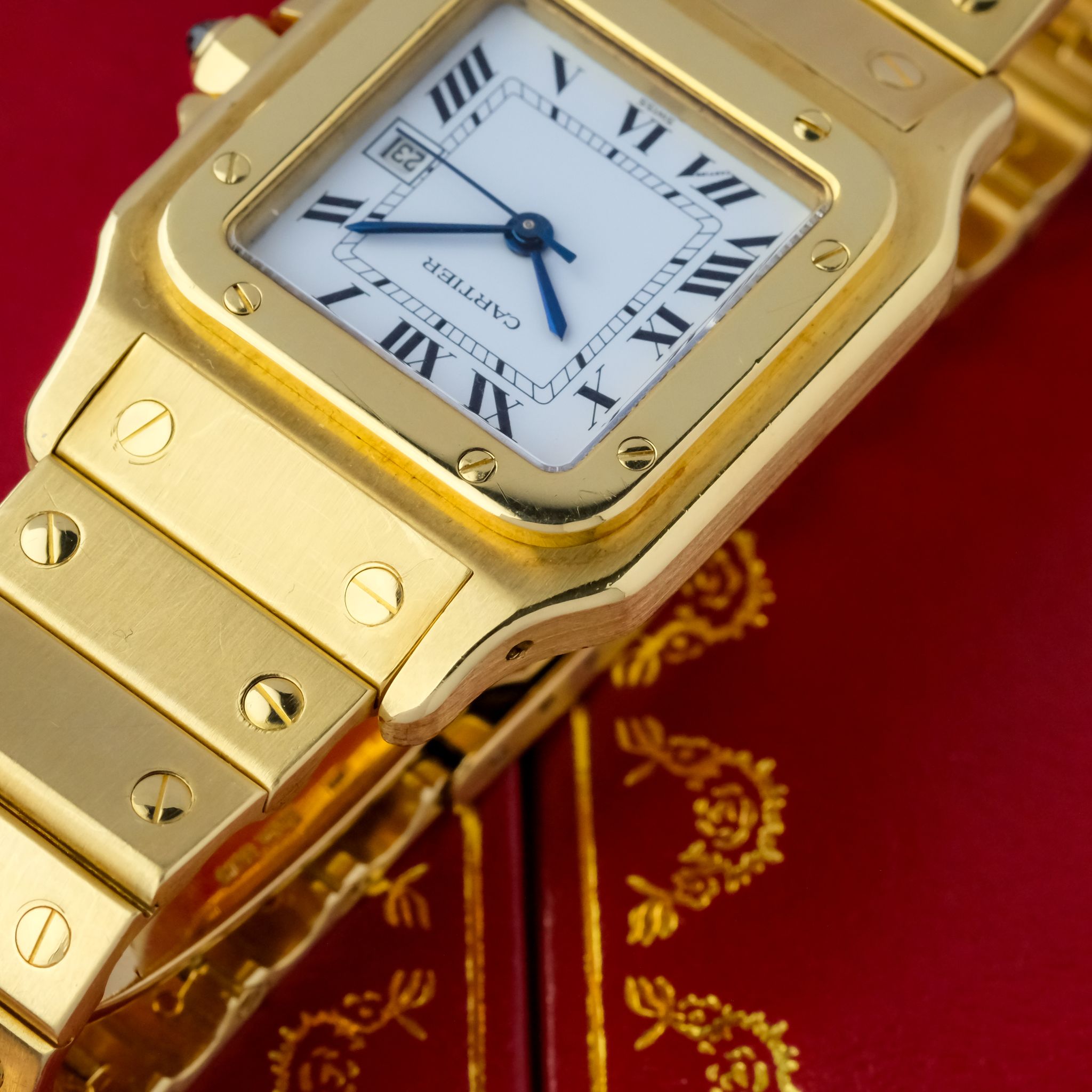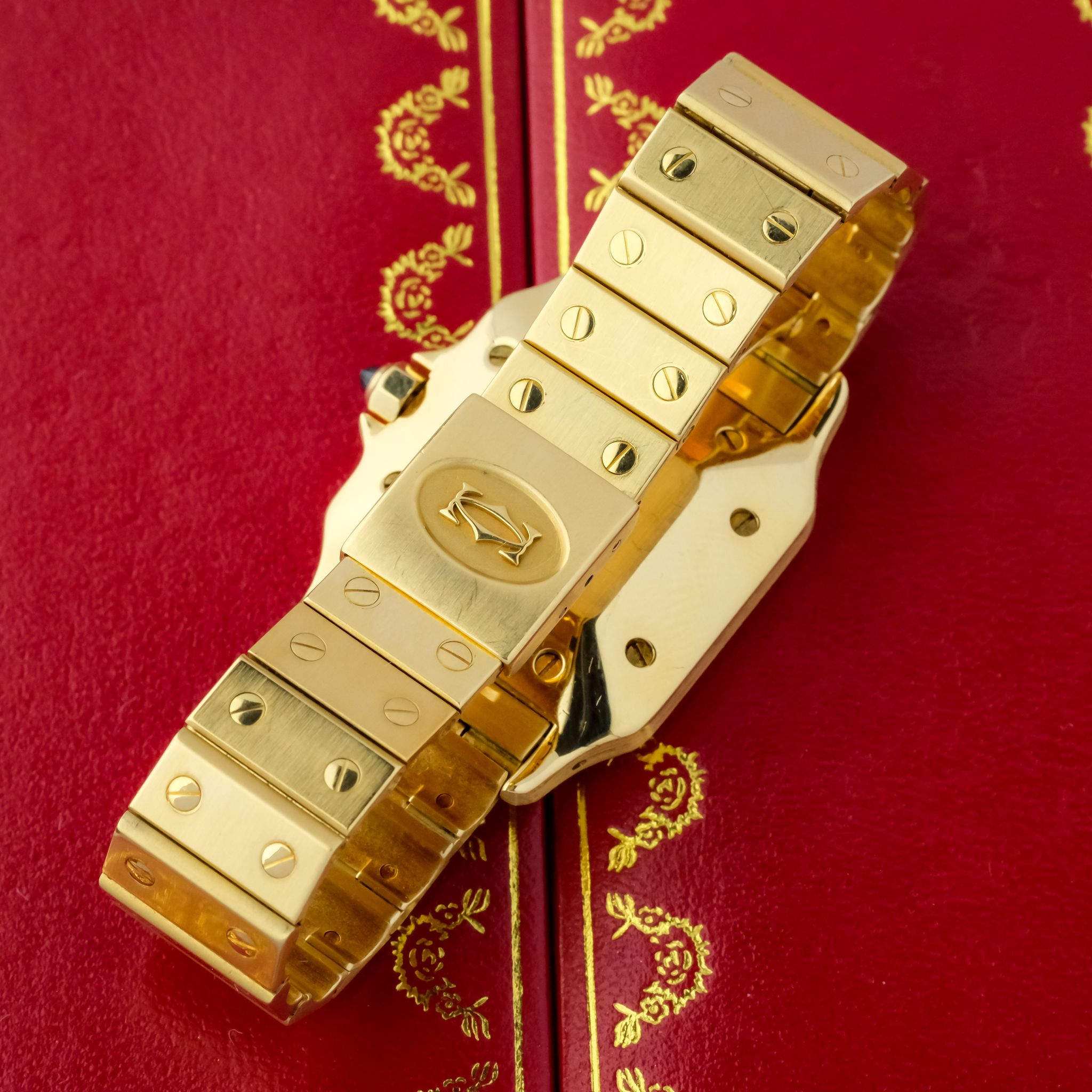 Crafted entirely from solid 18k yellow gold, the watch makes a powerful statement with its substantial case, visible screws, and integrated bracelet. Measuring a balanced size, the 2960 features an automatic movement housed within a slim yet robust case. The dial is quintessential Cartier, with elegant Roman numerals, a chemin de fer minute track, and signature blued sword hands. The Santos Carrée Ref. 2960 blends timeless design with impressive craftsmanship and presence, making it a highly sought-after vintage piece that embodies Cartier’s mastery of marrying jewelry elegance with functional watchmaking.