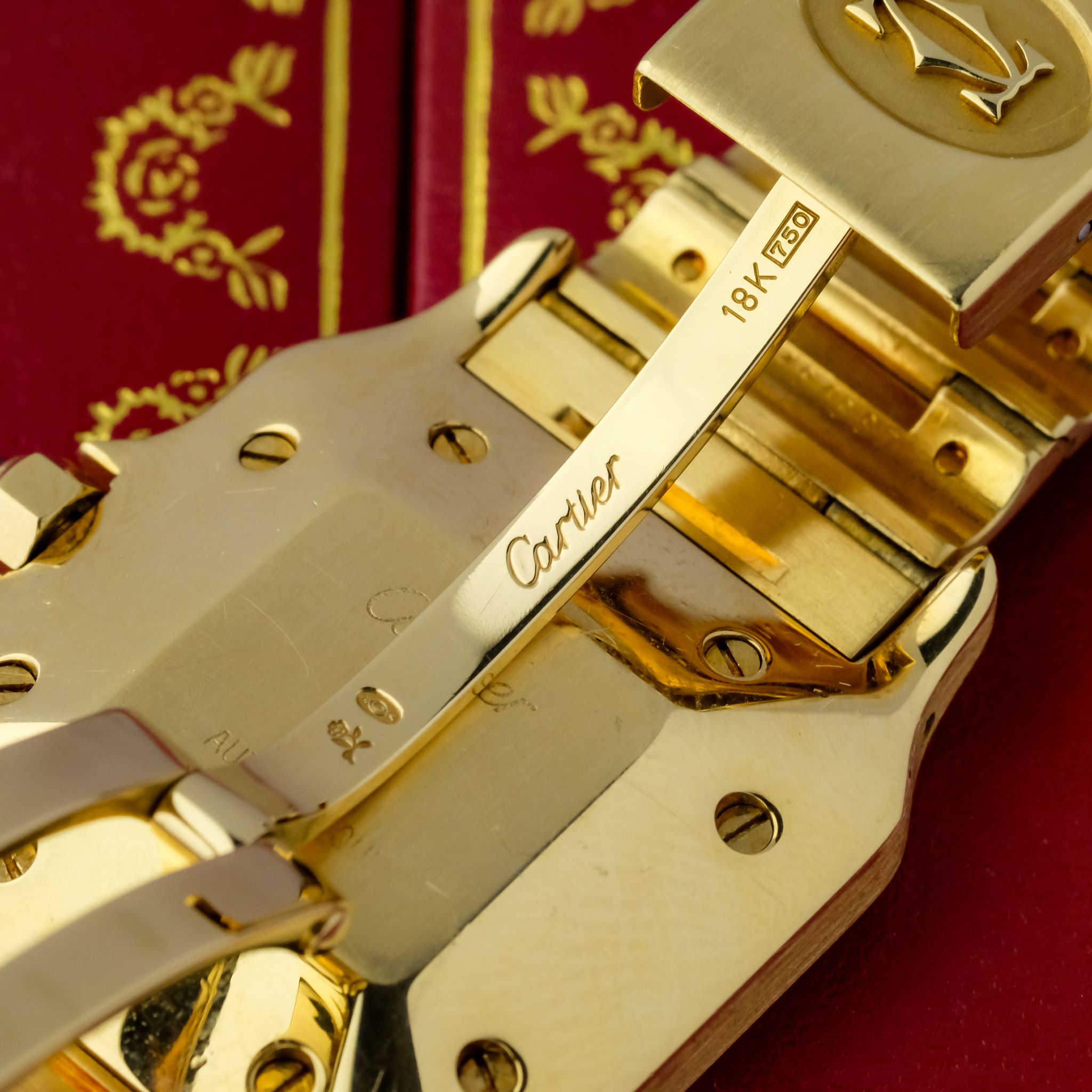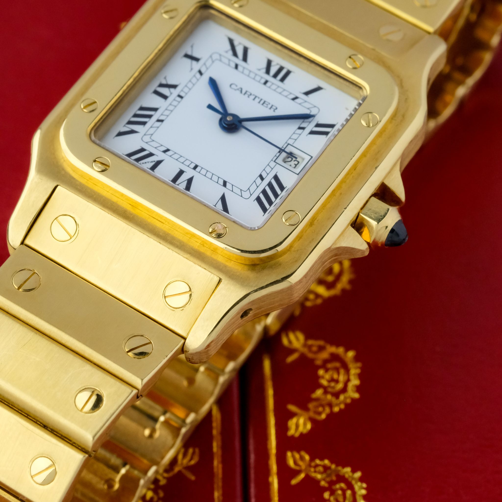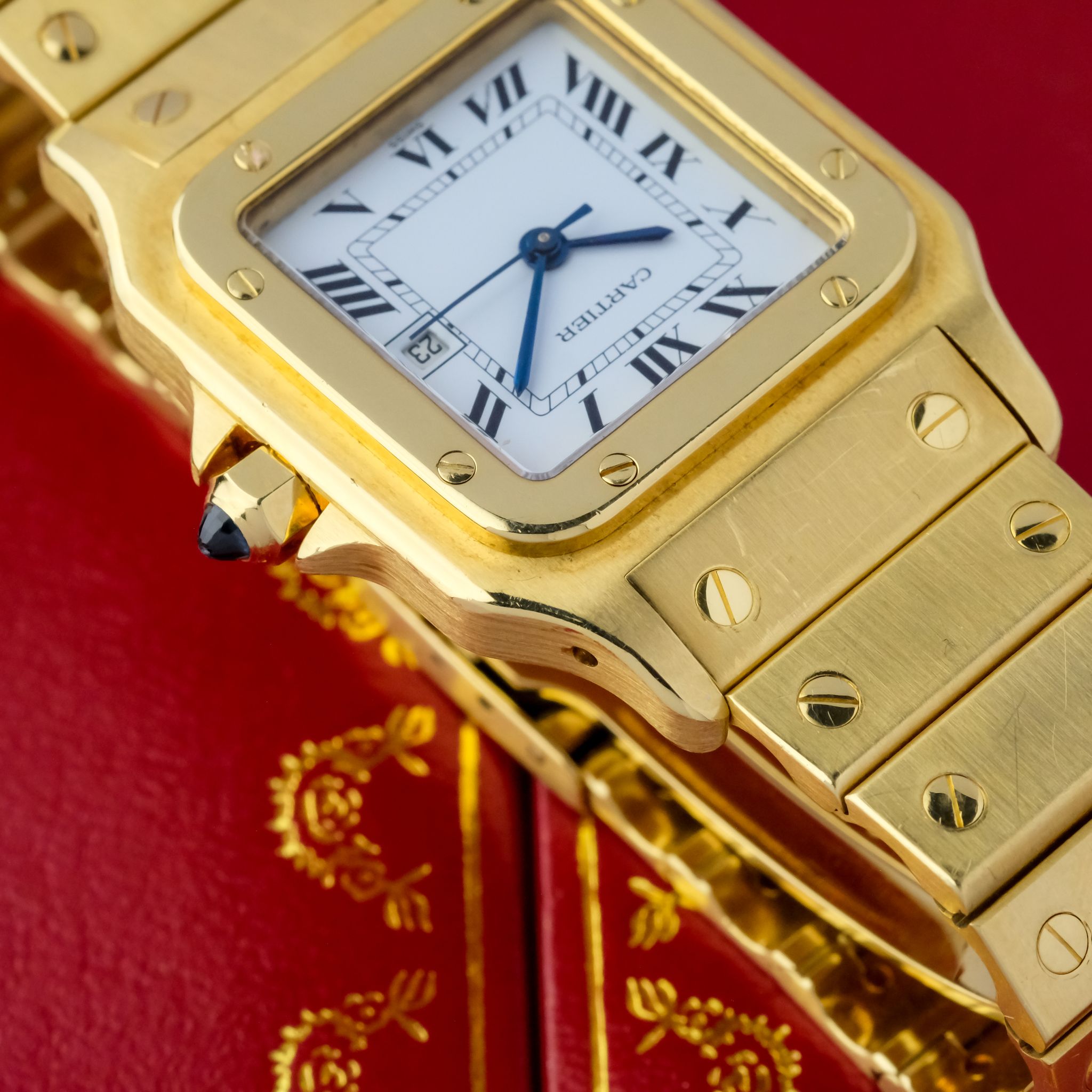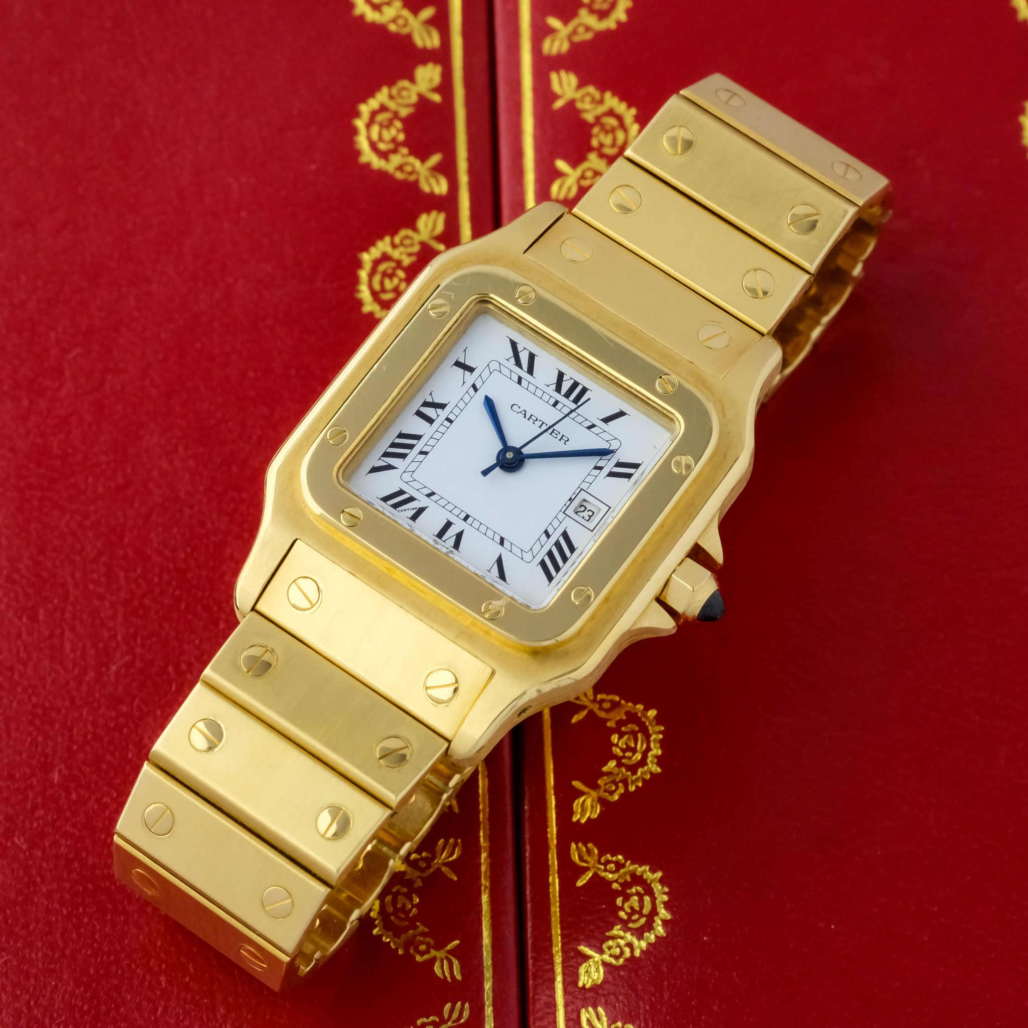 Crafted entirely from solid 18k yellow gold, the watch makes a powerful statement with its substantial case, visible screws, and integrated bracelet. Measuring a balanced size, the 2960 features an automatic movement housed within a slim yet robust case. The dial is quintessential Cartier, with elegant Roman numerals, a chemin de fer minute track, and signature blued sword hands. The Santos Carrée Ref. 2960 blends timeless design with impressive craftsmanship and presence, making it a highly sought-after vintage piece that embodies Cartier’s mastery of marrying jewelry elegance with functional watchmaking.