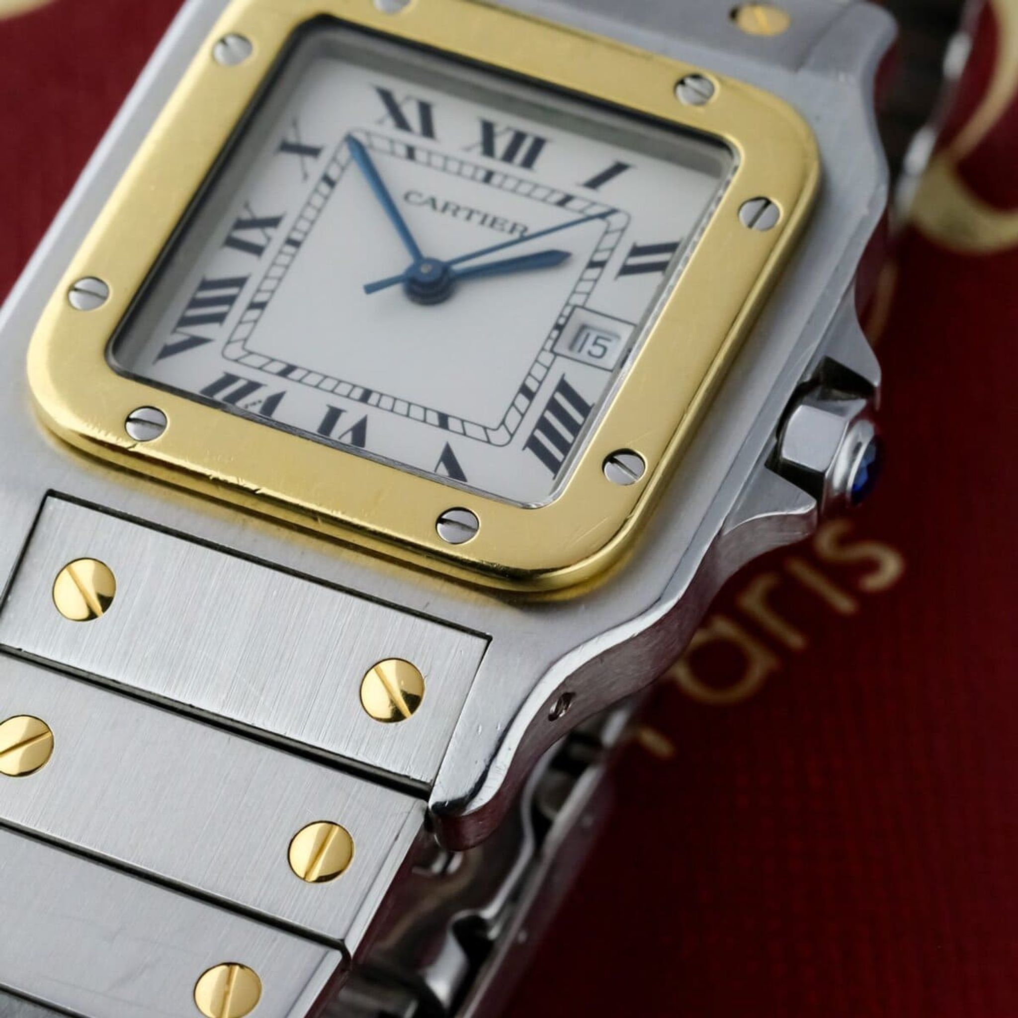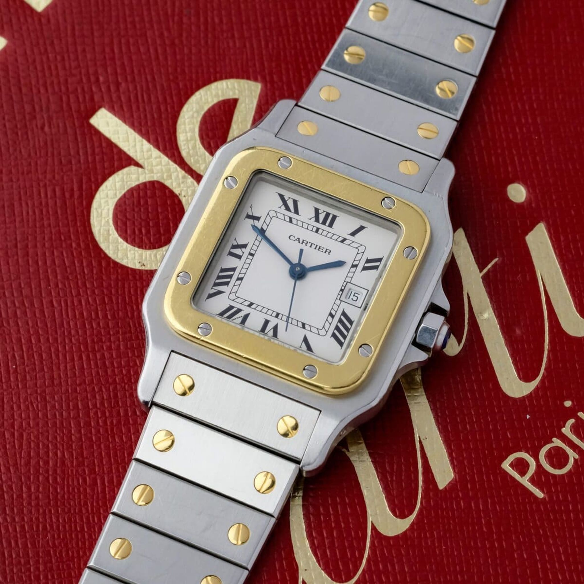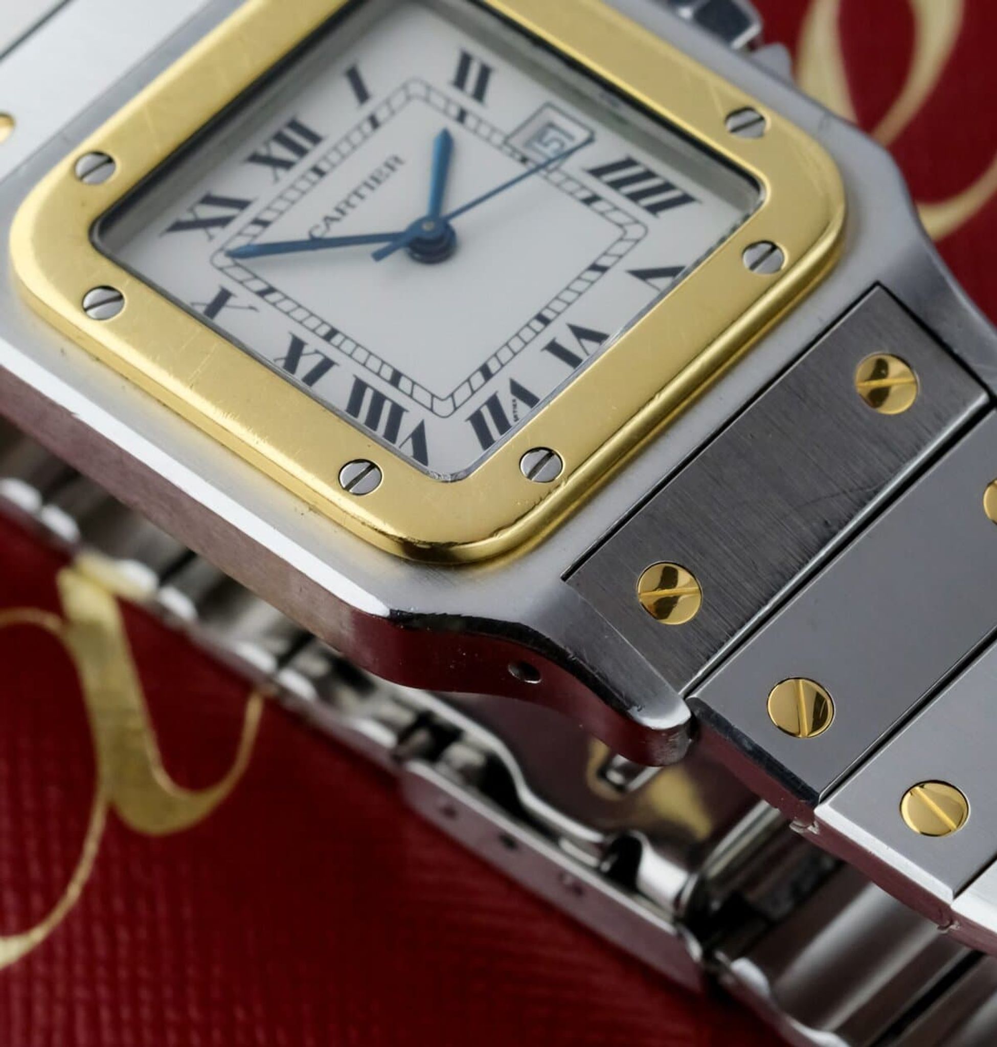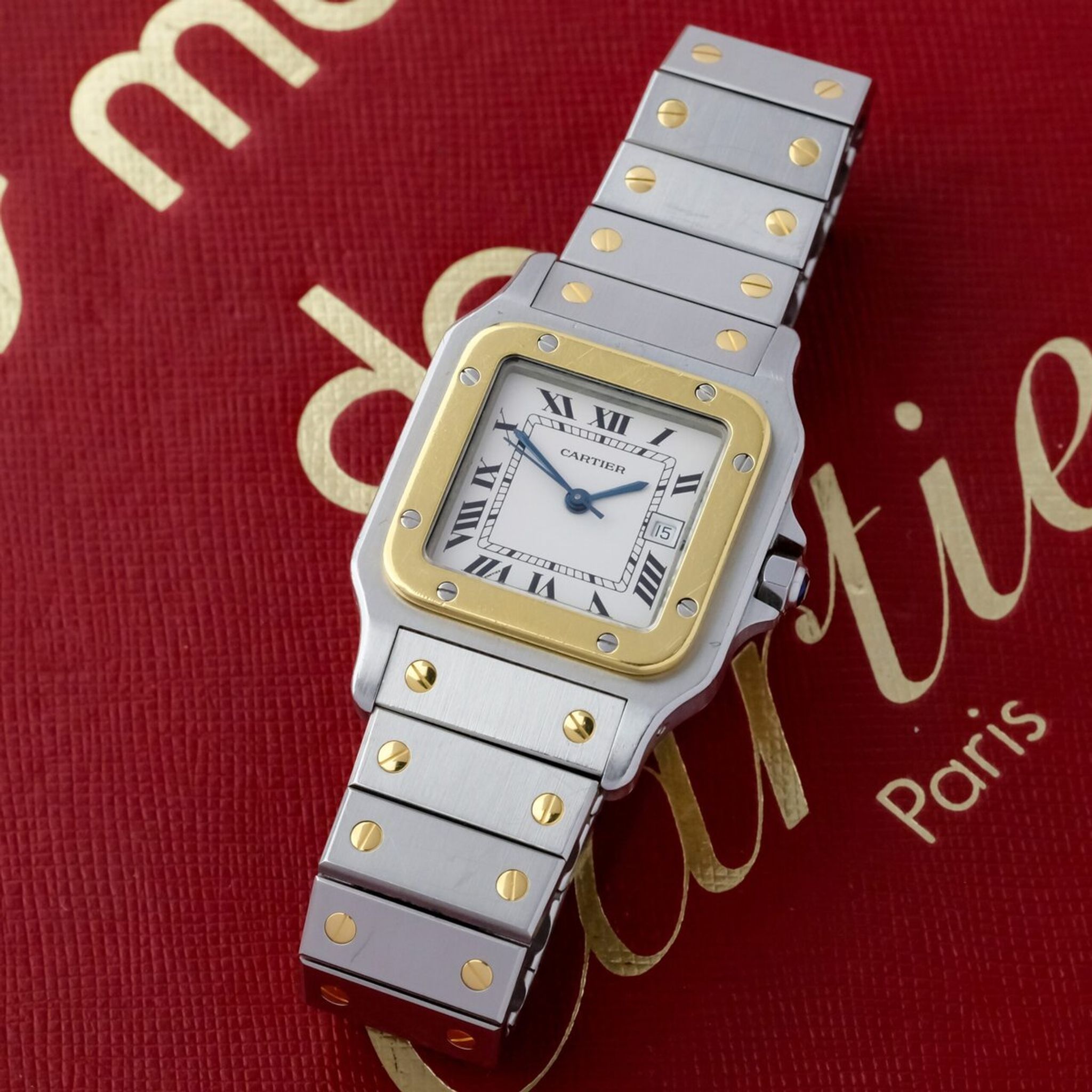 This Cartier Santos Carrée GM reference 2961 is a classic and instantly recognizable example of Cartier’s pioneering sport luxury design. Crafted in a combination of stainless steel and 18k yellow gold, the watch features the signature exposed bezel screws and integrated bracelet that have defined the Santos line for decades.