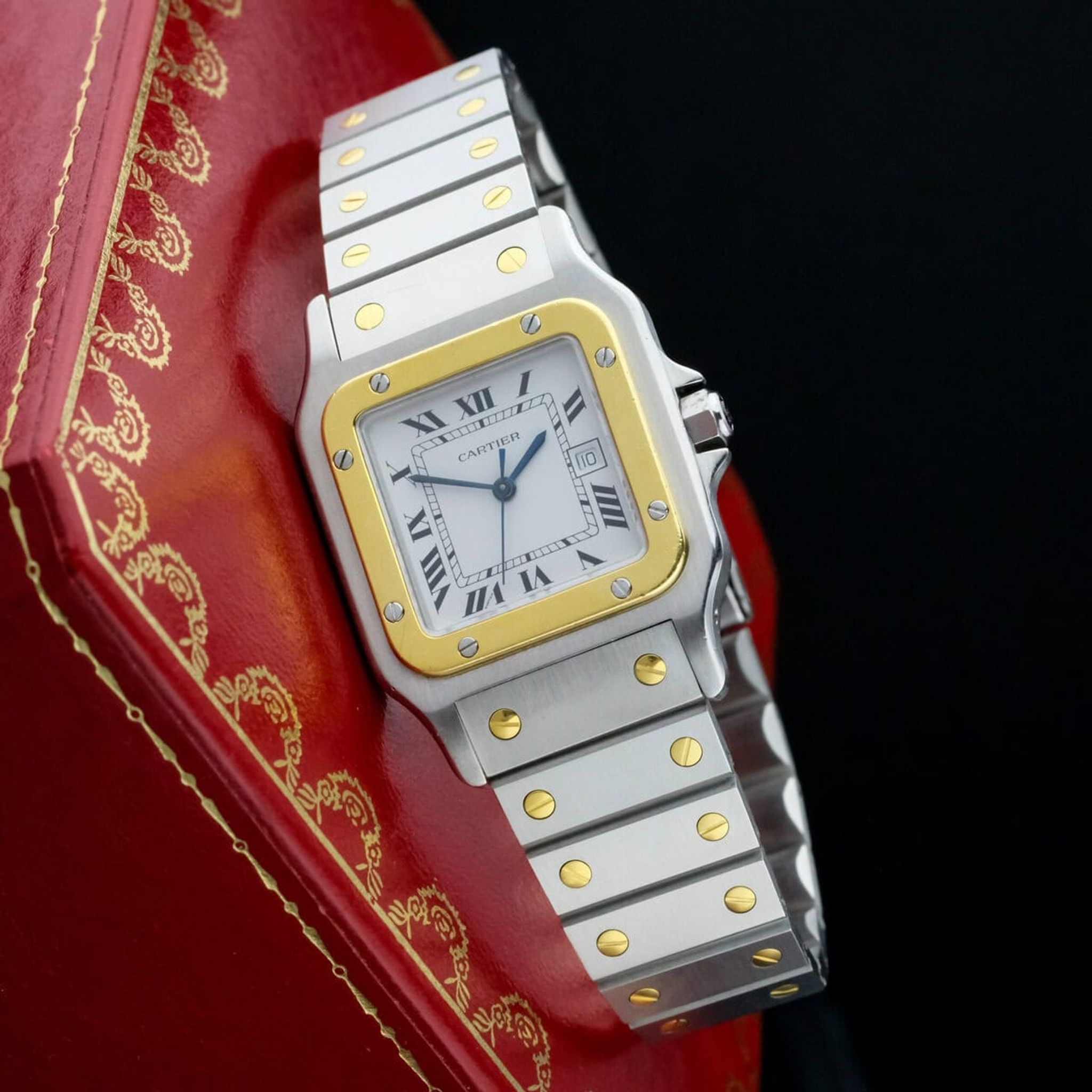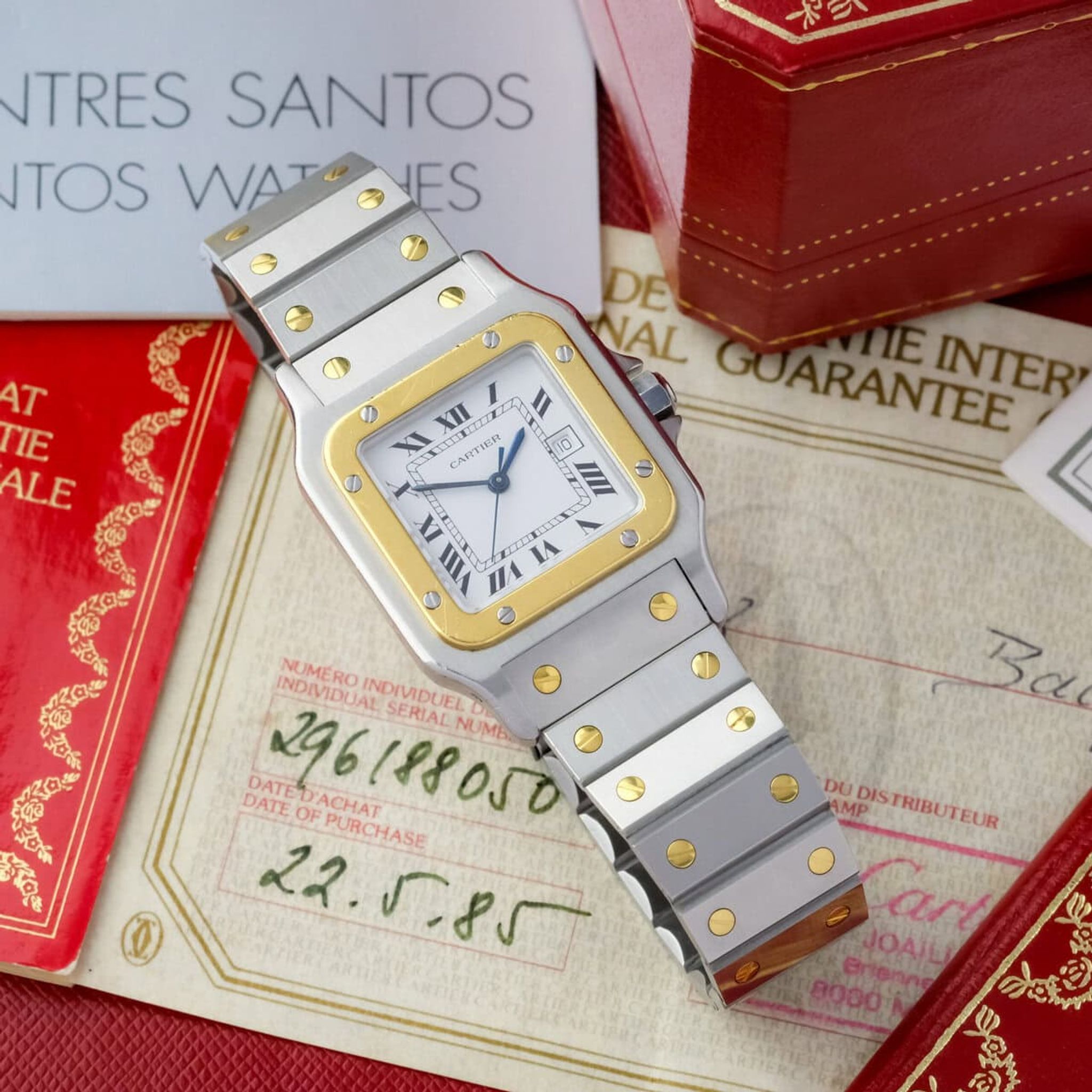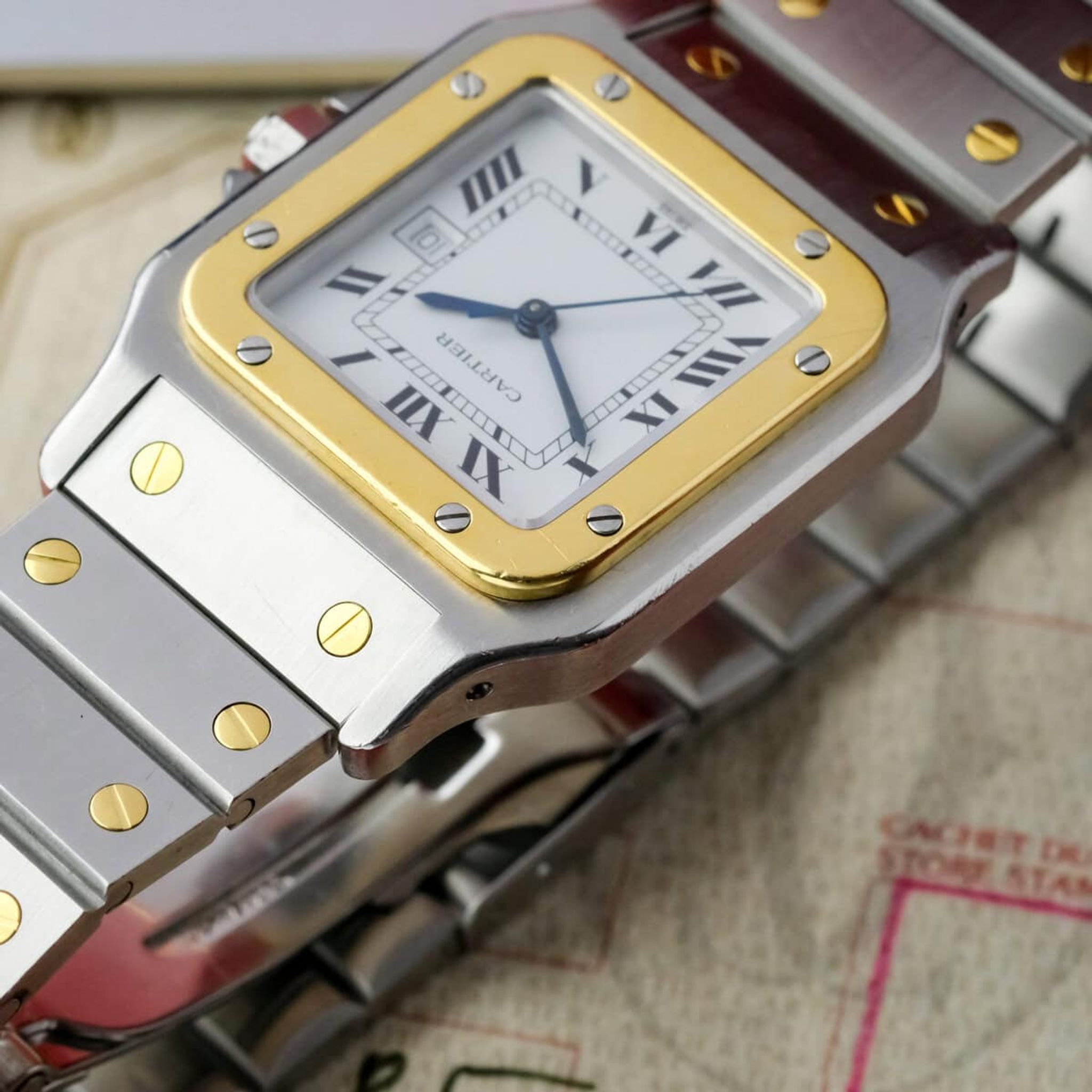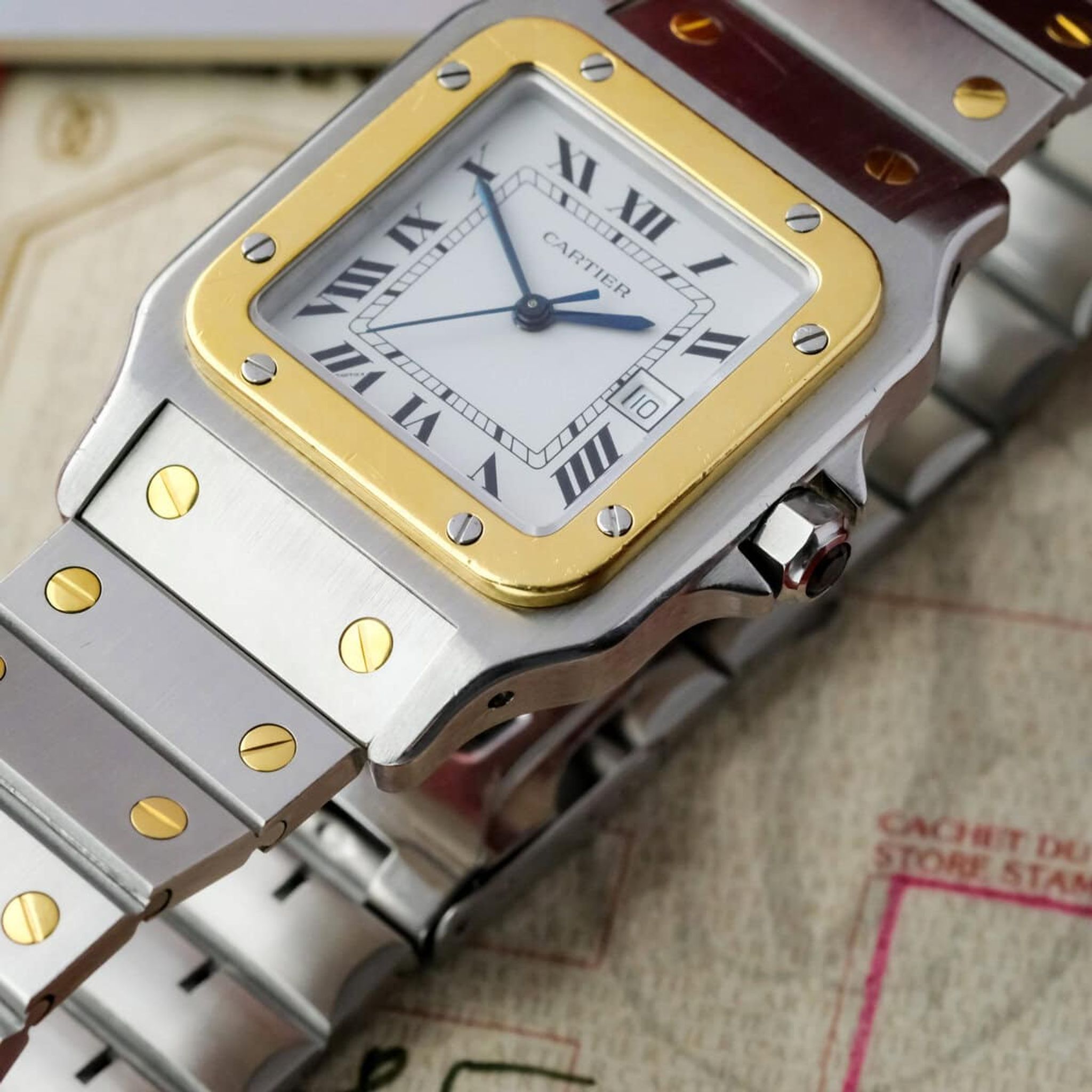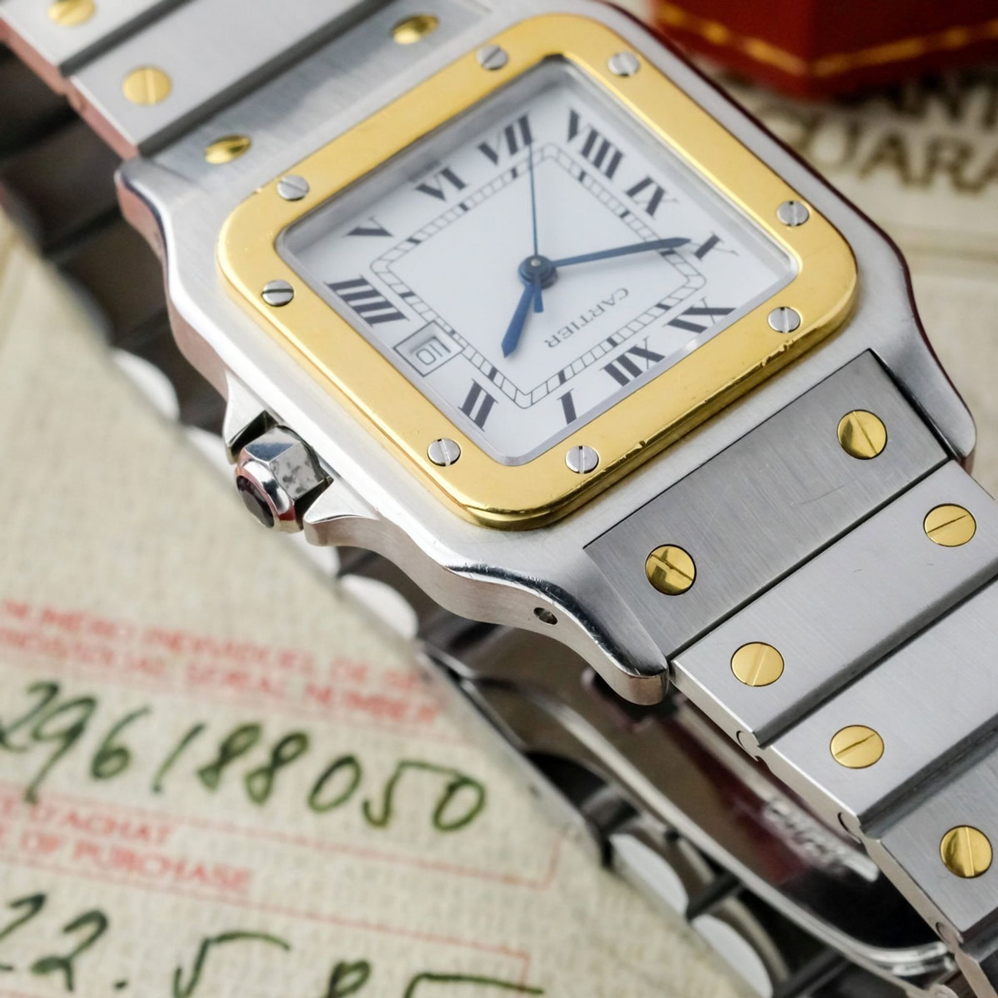 This Cartier Santos Carrée reference 2961 is a classic example of one of the maison’s most enduring designs. Crafted in stainless steel and 18k yellow gold, it retains the signature exposed bezel screws and integrated bracelet that define the Santos line.