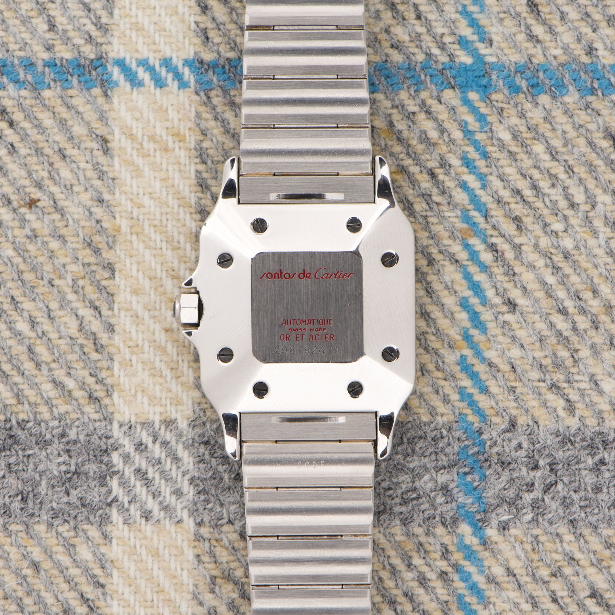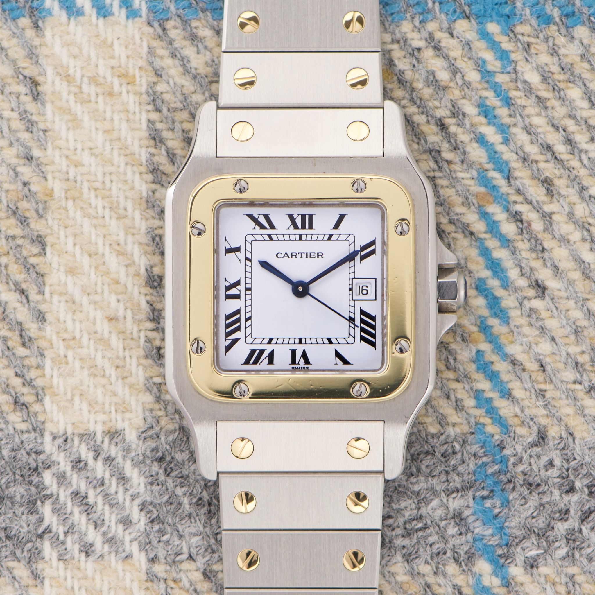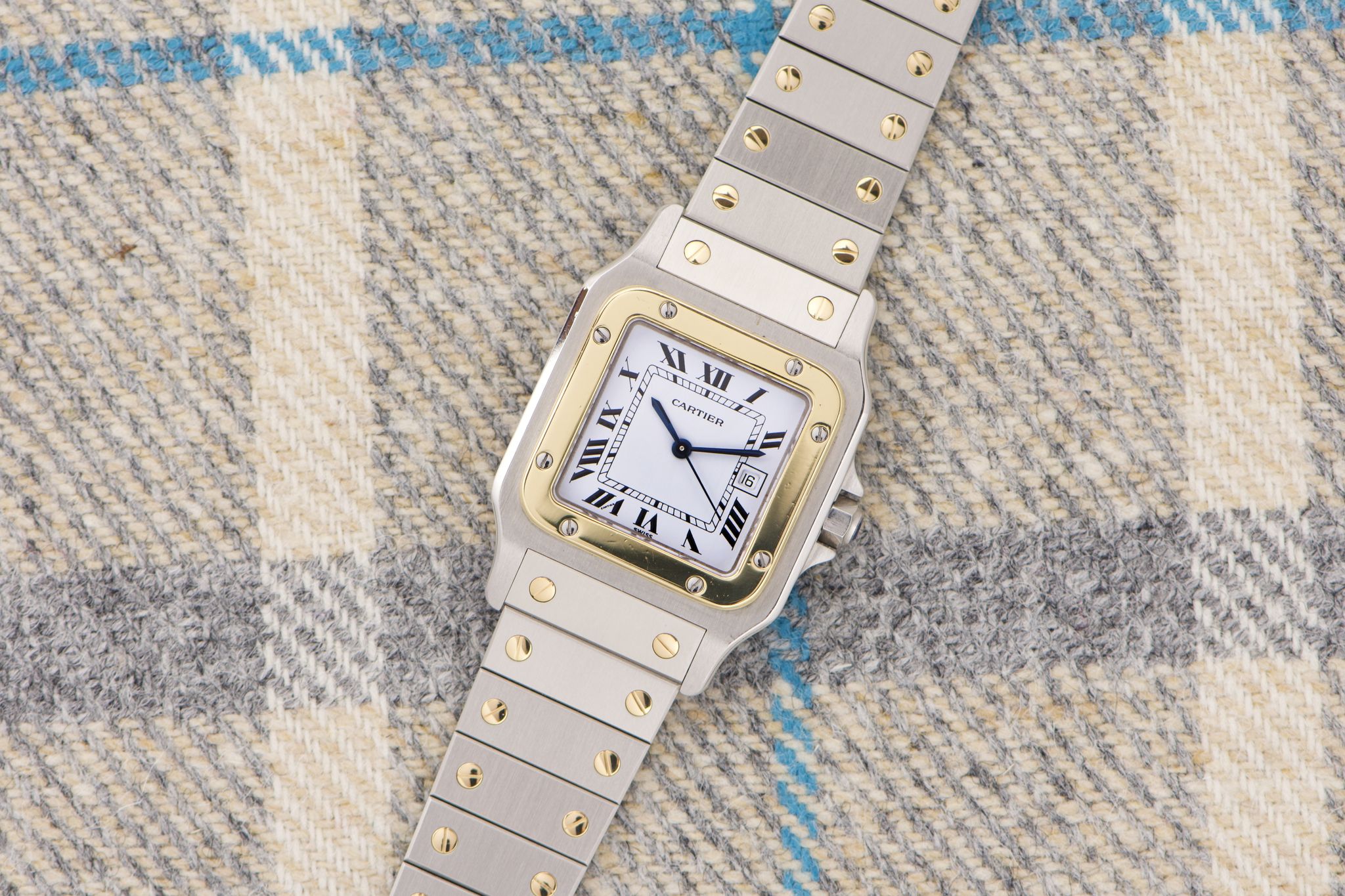 Case: The reference 2961 is the large two-tone Santos Carree with a fantastic 29mm case. The chamfers are nice and prominent. The lugs are still even and sharp. The yellow-gold bezel is clean and even.