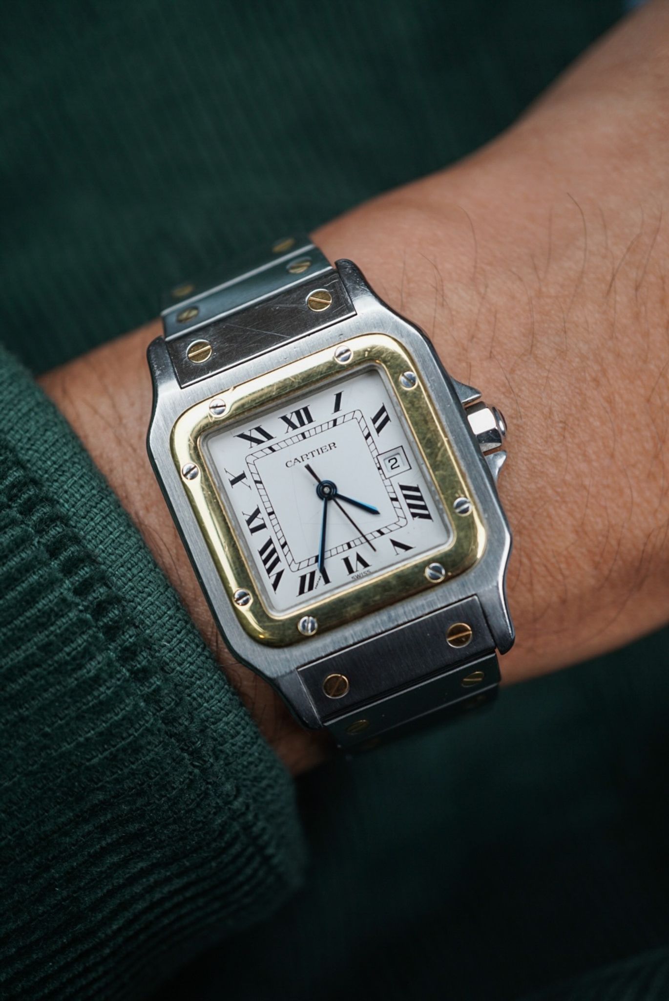Cartier Santos 2961 - these 29mm cases wear beautifully on the wrist. I have always liked the sharp edges on the case and the combination of a roman dial and an integrated bracelet. Now available!