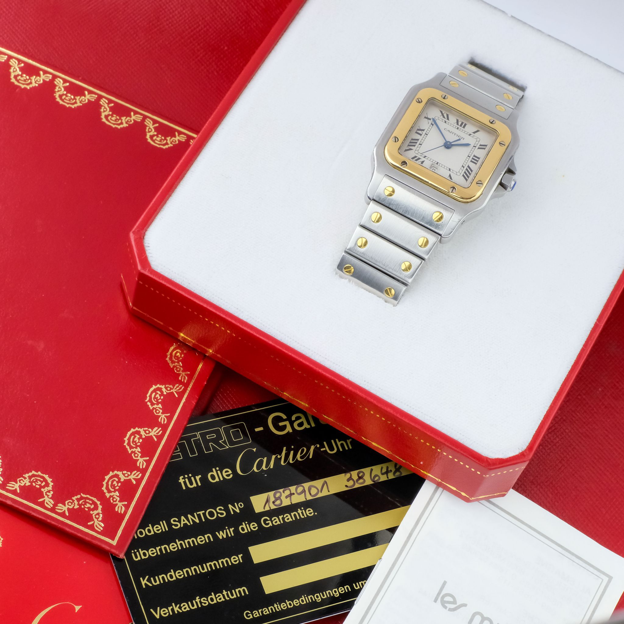 Very nice and unpolished Cartier Santos Galbée ref. 187901 accompanied by a "metro" fullset, a former retailer of Cartier in germany, as well as booklets.