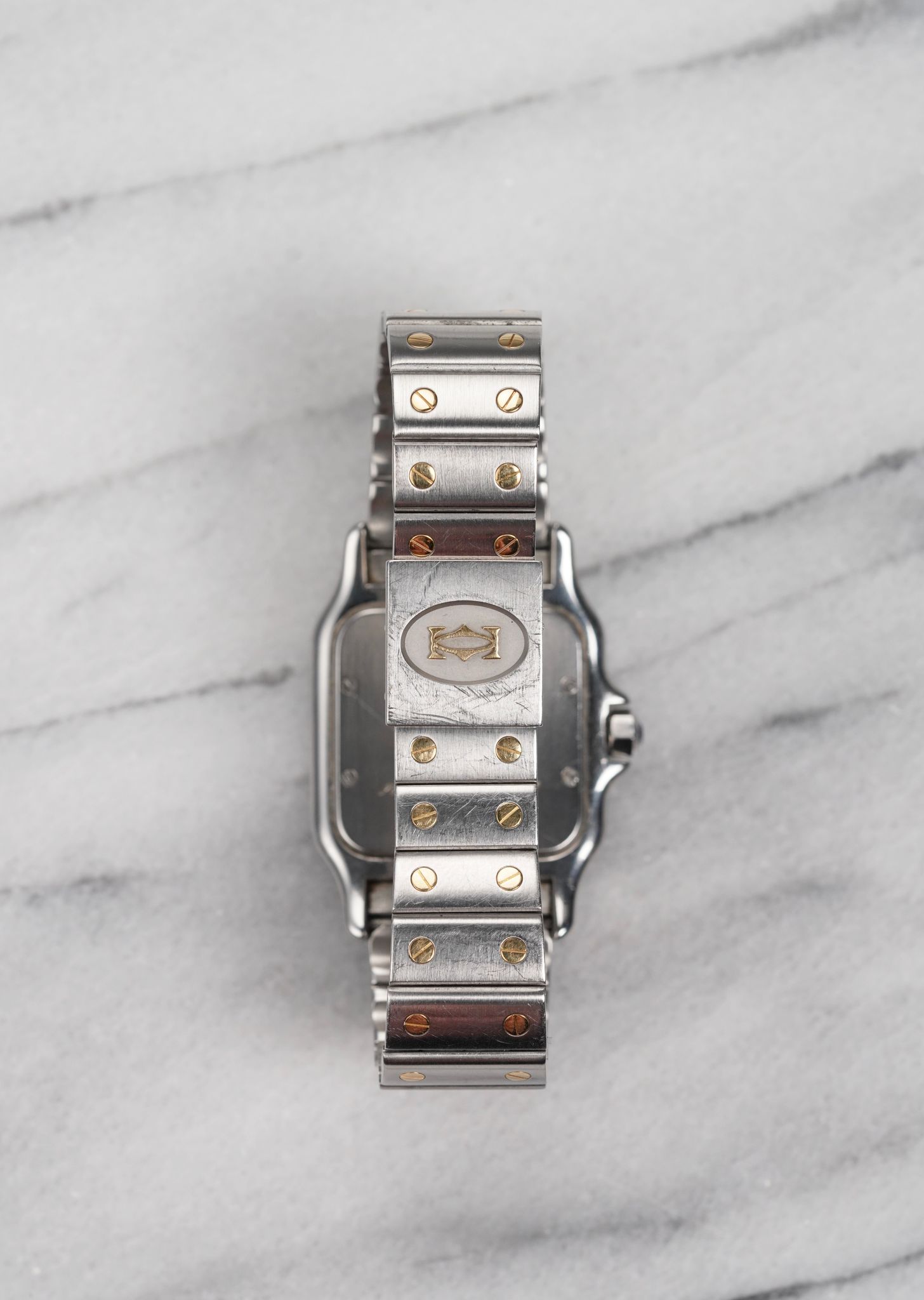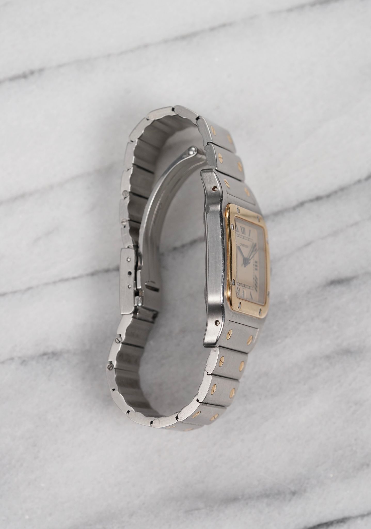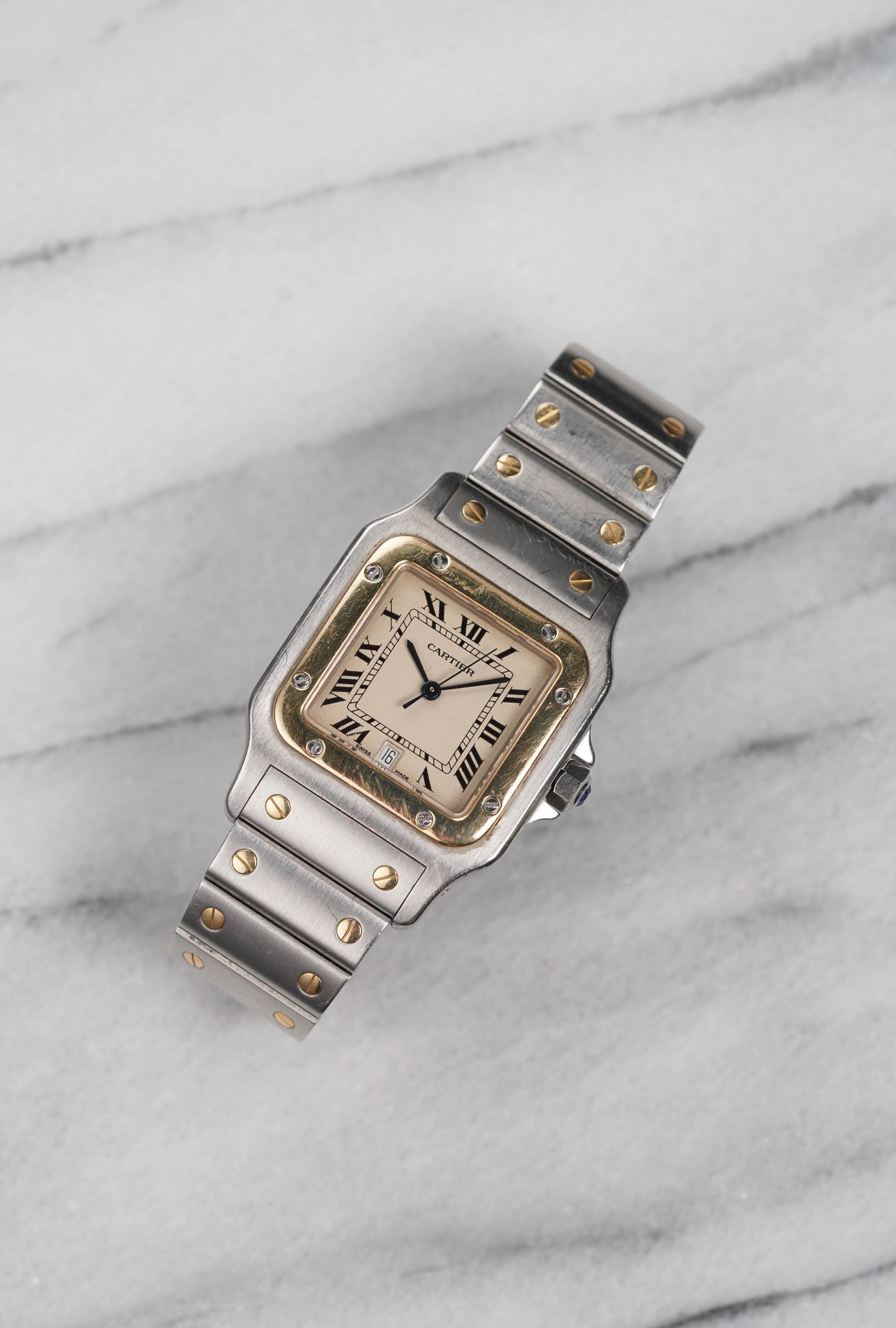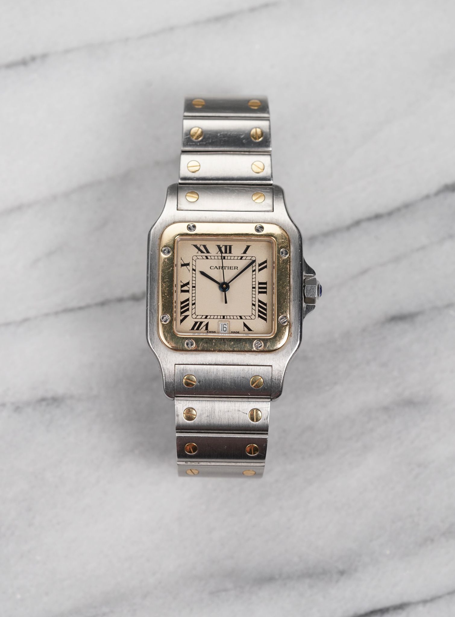 Here's a vintage Cartier Santos Galbee two tone quartz with a grey roman numeral dial (quite unique dial configuration). Keeps great time and is fully functional. Measurements include a 29x41mm square case size and 18mm lug width. Integrated bracelet with screws that fit up to a 6.75 inch wrist. Quickset date function at 6 a clock. Blue cabochon crown. Matching blue hands, hour markers, and minute track. Stainless steel case and caseback. Some scratches on the bezel, case, and bracelet. gold bezel and screws in the bracelet. Brushed finishing on both the case and bracelet. Matching screws on the bezel and bracelet. Drilled lug holes. Makes for a great watch for both men and women. All the parts are original including the crown, dial, movement, and caseback. Both the dial and case are in great cosmetic, untouched condition.