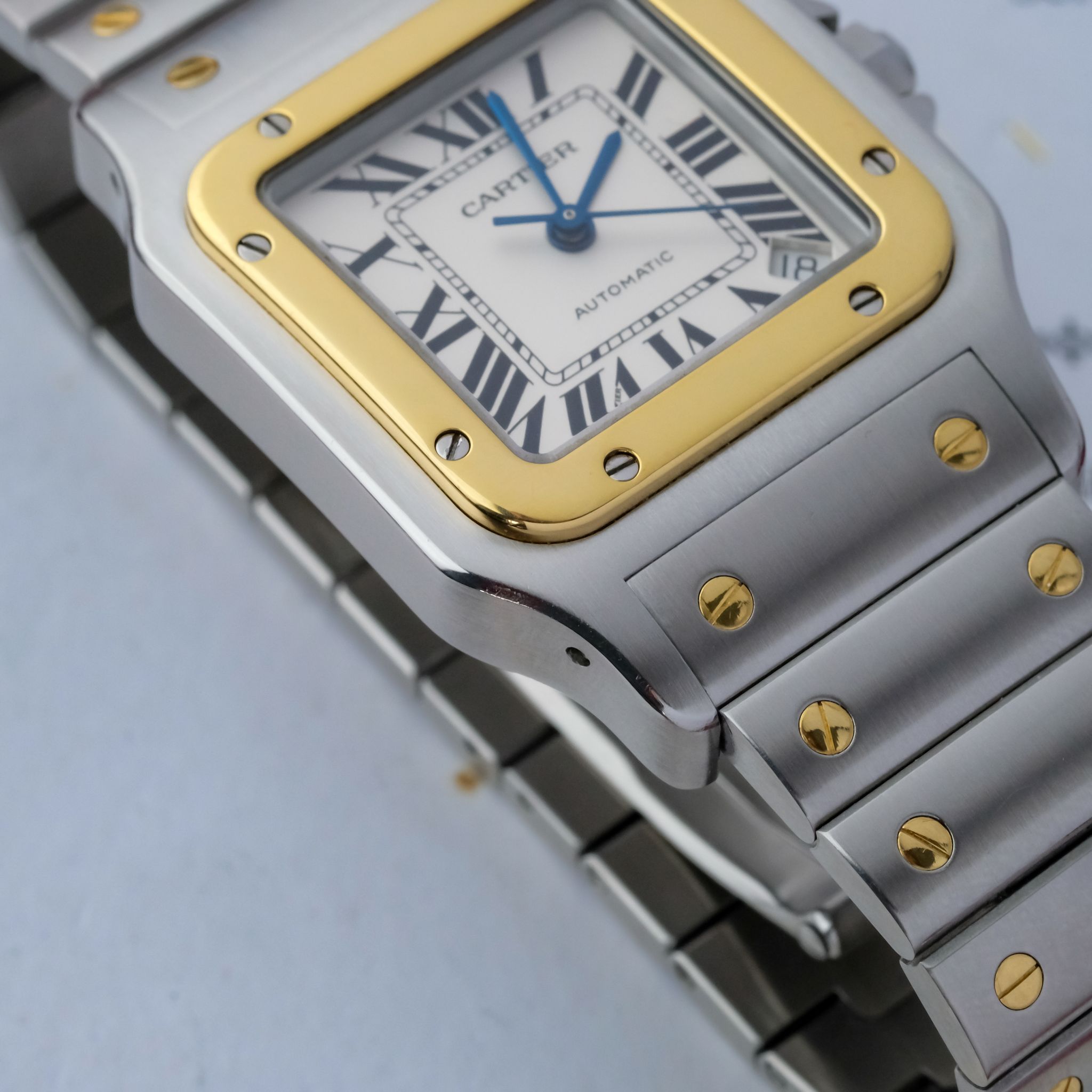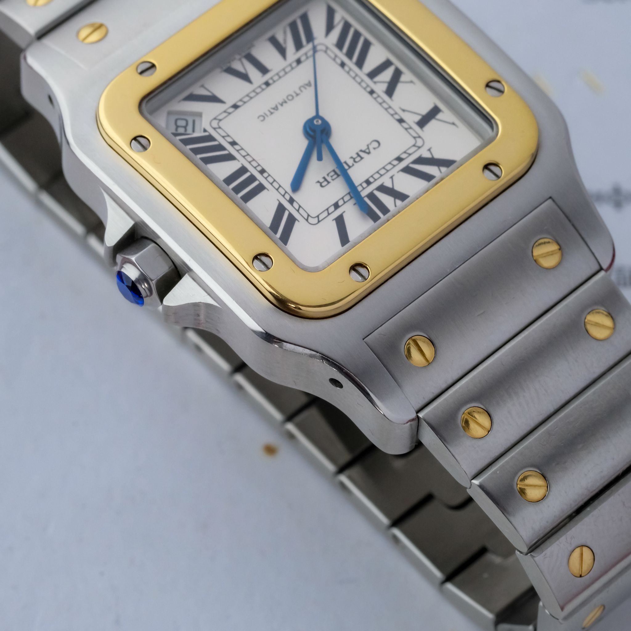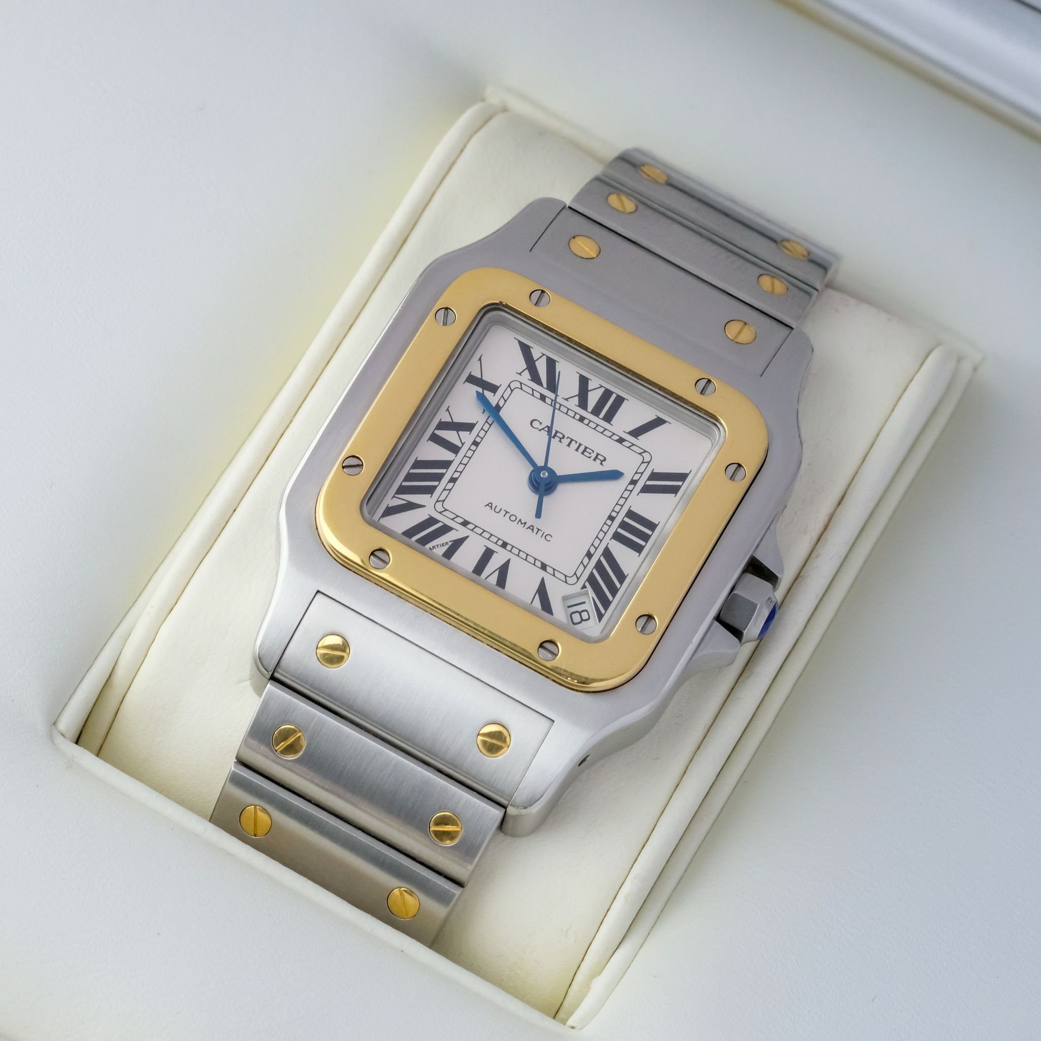 The Cartier Santos Ref. 2823 exemplifies Cartier’s ability to blend classic design with contemporary functionality. Introduced in the 1990s as part of the Santos de Cartier collection, this model builds upon the heritage of the original Santos. Crafted in steel and 18k yellow gold, the Ref. 2823 is larger than the more compact Santos Galbée models, offering a more substantial presence on the wrist. The square case with gently rounded edges retains its iconic shape, while its increased size adds a contemporary feel without losing the signature elegance of the Santos design. The white dial features Roman numerals, blue steel hands, and the exposed screws on the bezel. Powered by a self-winding mechanical movement, the Ref. 2823 offers both precision and reliability.