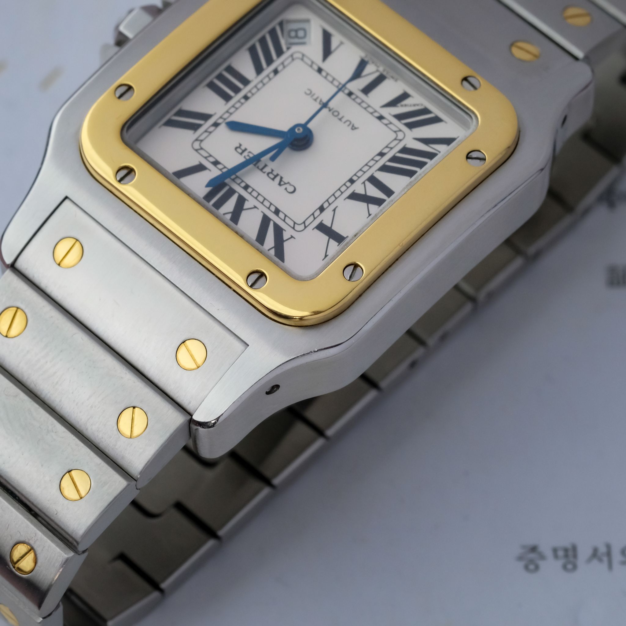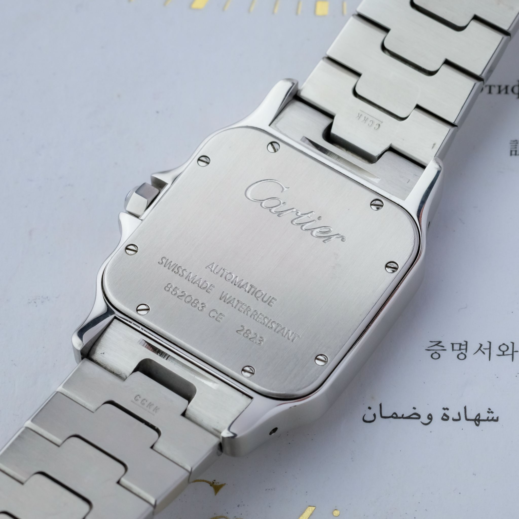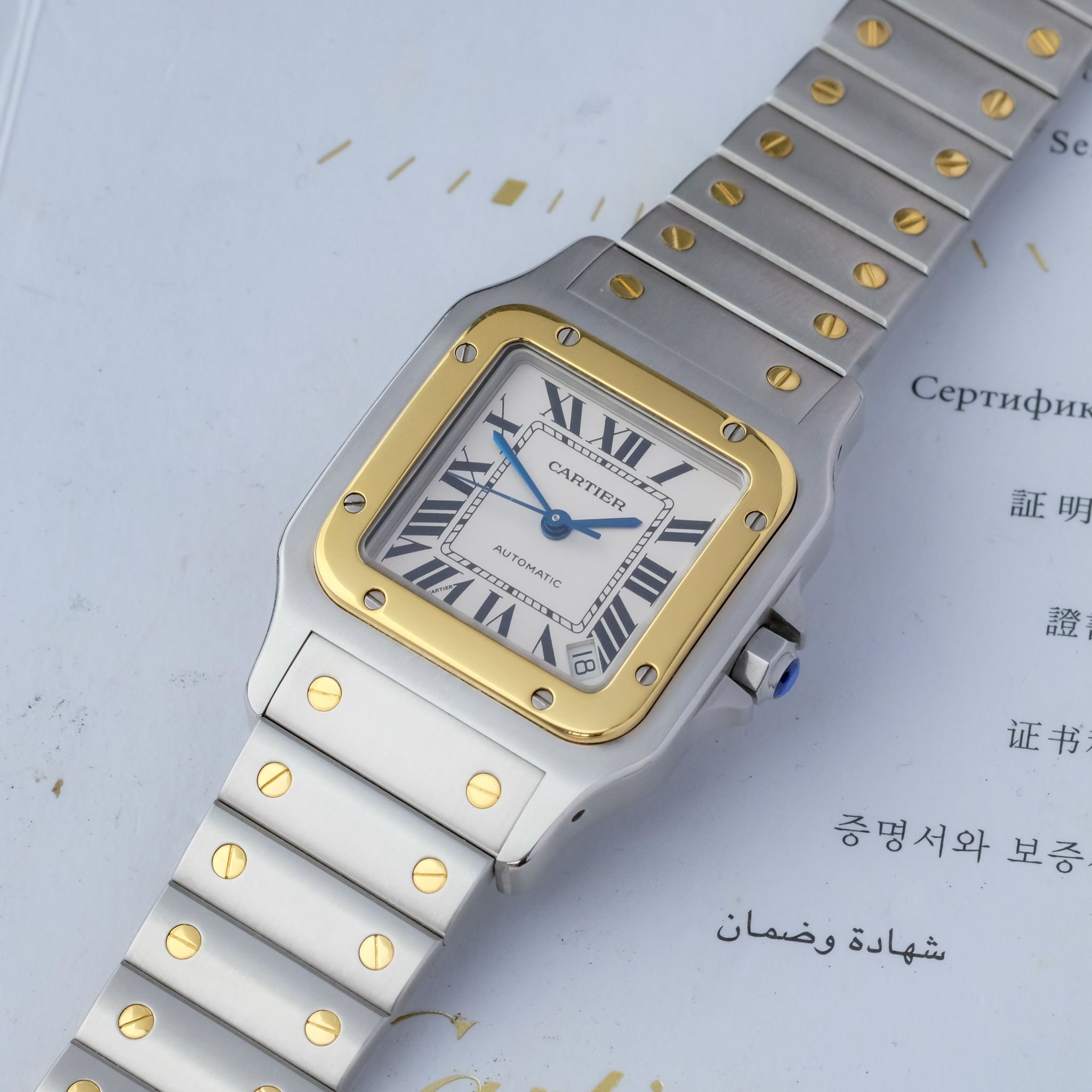 The Cartier Santos Ref. 2823 exemplifies Cartier’s ability to blend classic design with contemporary functionality. Introduced in the 1990s as part of the Santos de Cartier collection, this model builds upon the heritage of the original Santos. Crafted in steel and 18k yellow gold, the Ref. 2823 is larger than the more compact Santos Galbée models, offering a more substantial presence on the wrist. The square case with gently rounded edges retains its iconic shape, while its increased size adds a contemporary feel without losing the signature elegance of the Santos design. The white dial features Roman numerals, blue steel hands, and the exposed screws on the bezel. Powered by a self-winding mechanical movement, the Ref. 2823 offers both precision and reliability.