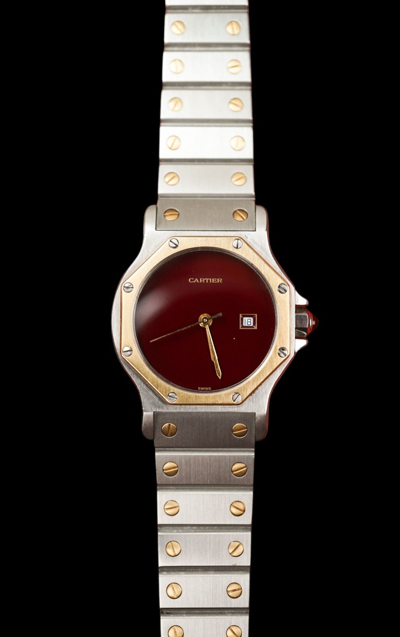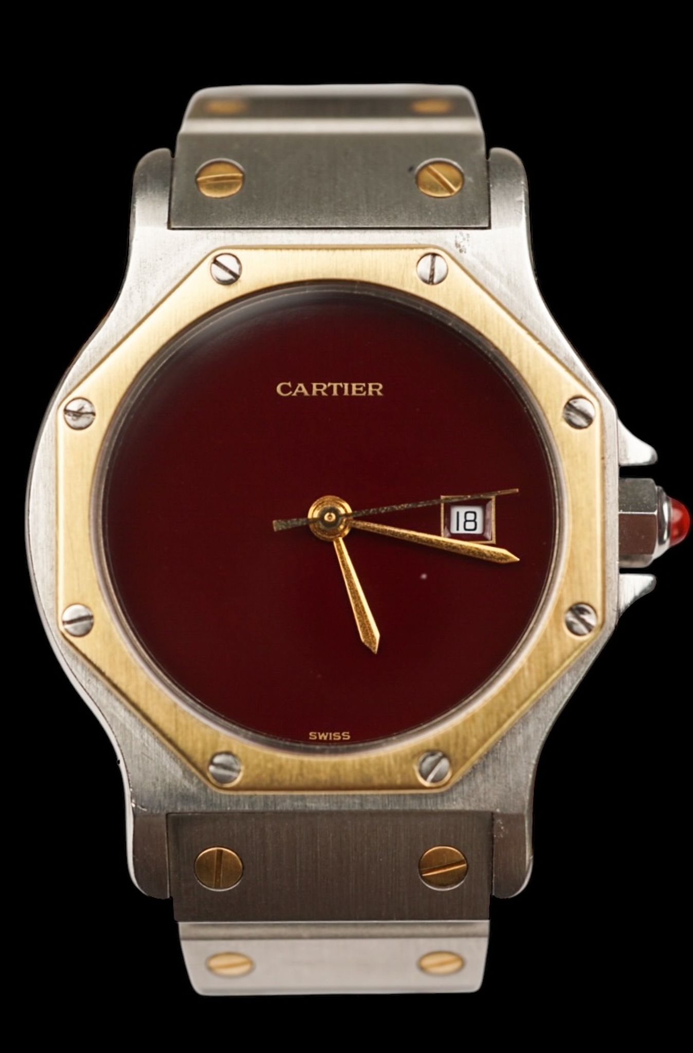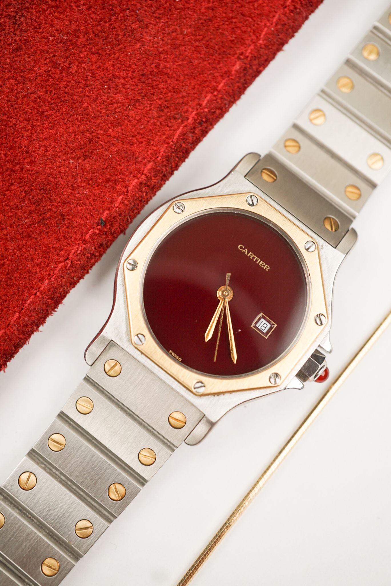 Cartier Santos ref. 2966. This is the larger model with a date and a flawless burgundy dial in stellar condition. 🍷🍷