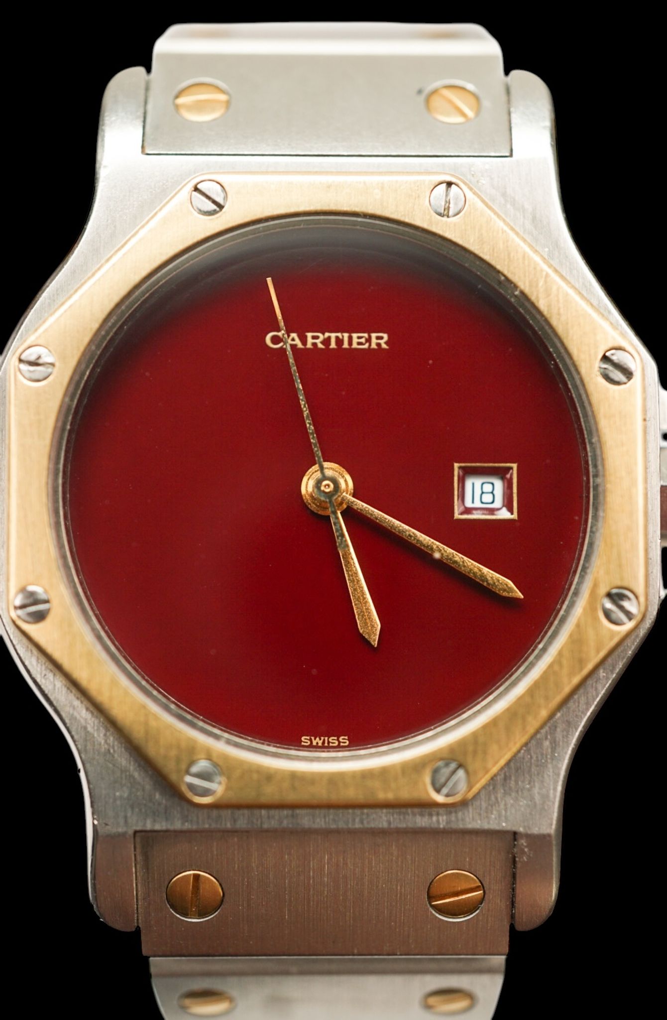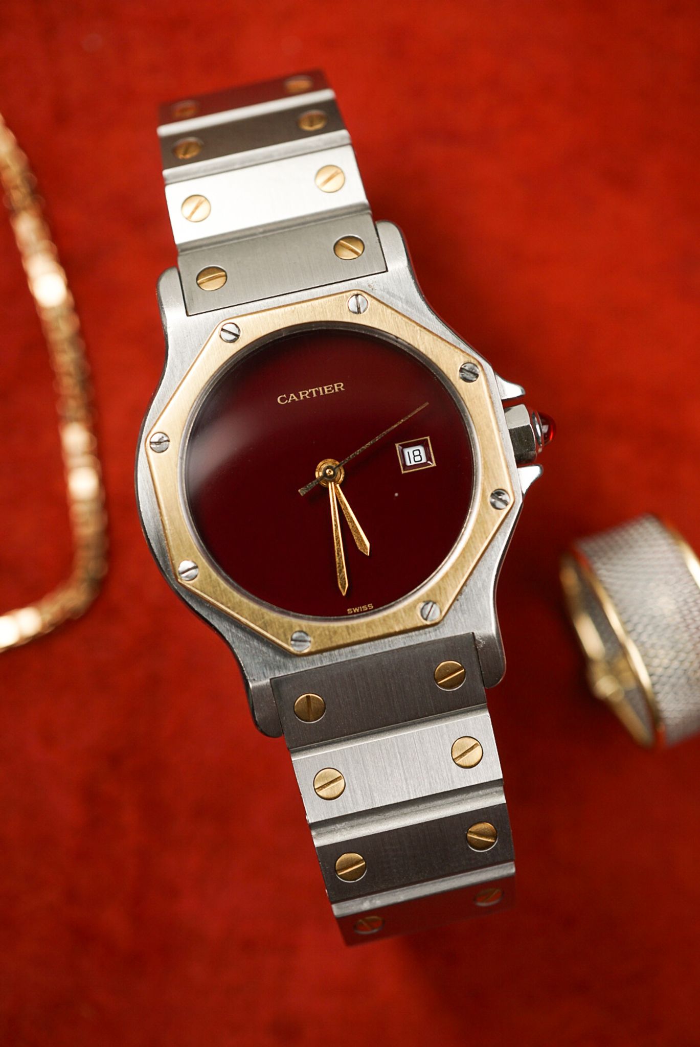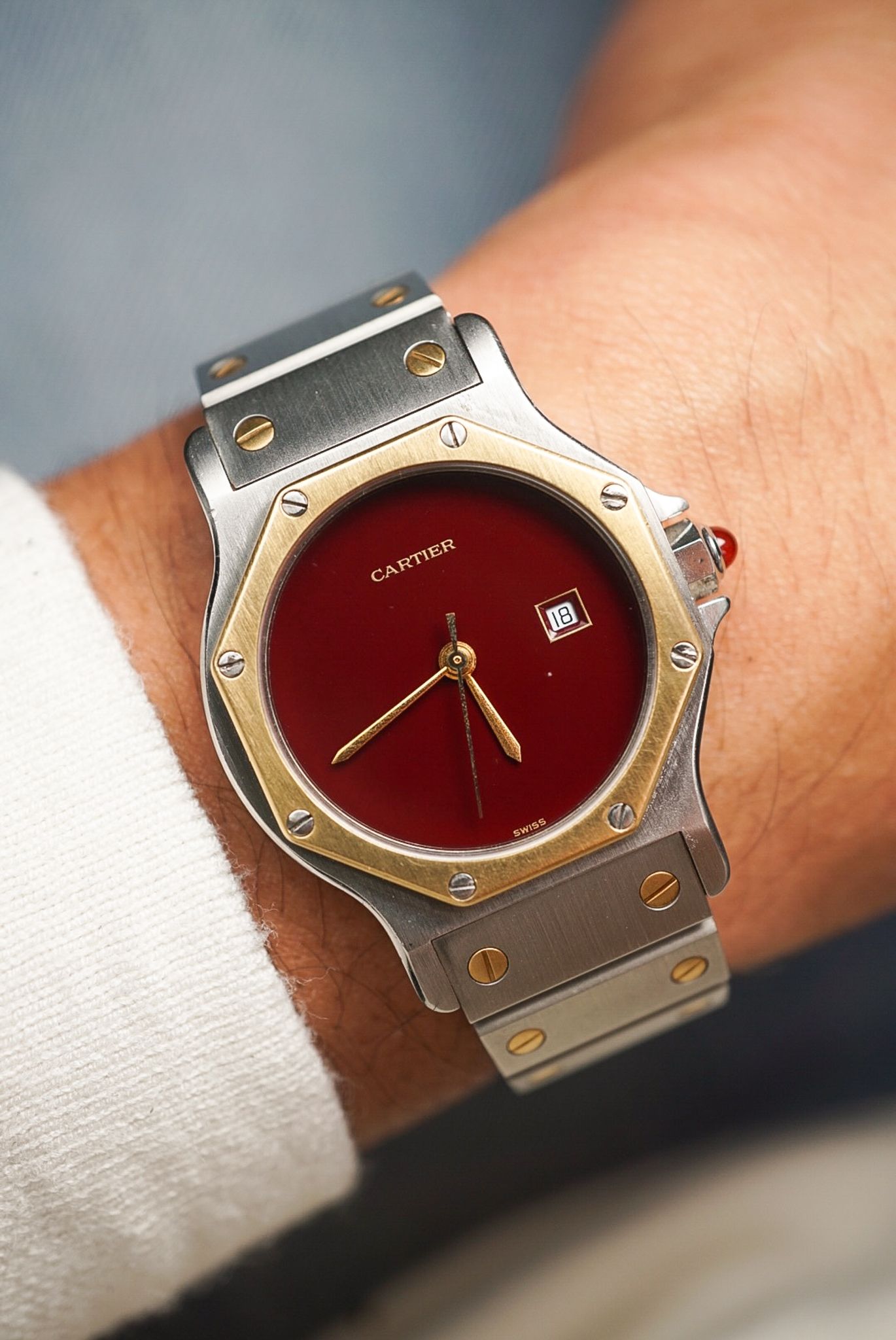 Cartier Santos ref. 2966. This is the larger model with a date and a flawless burgundy dial in stellar condition. 🍷🍷