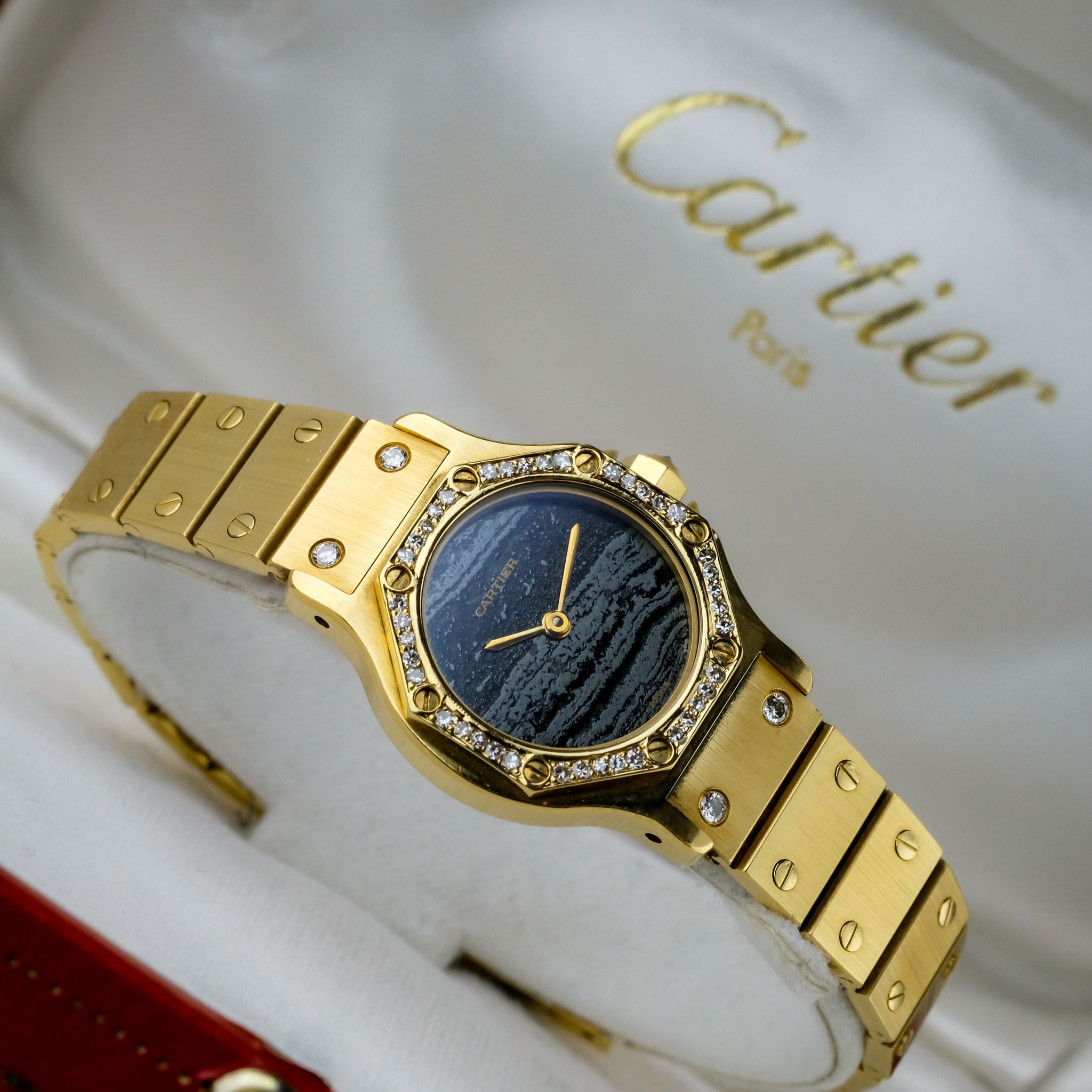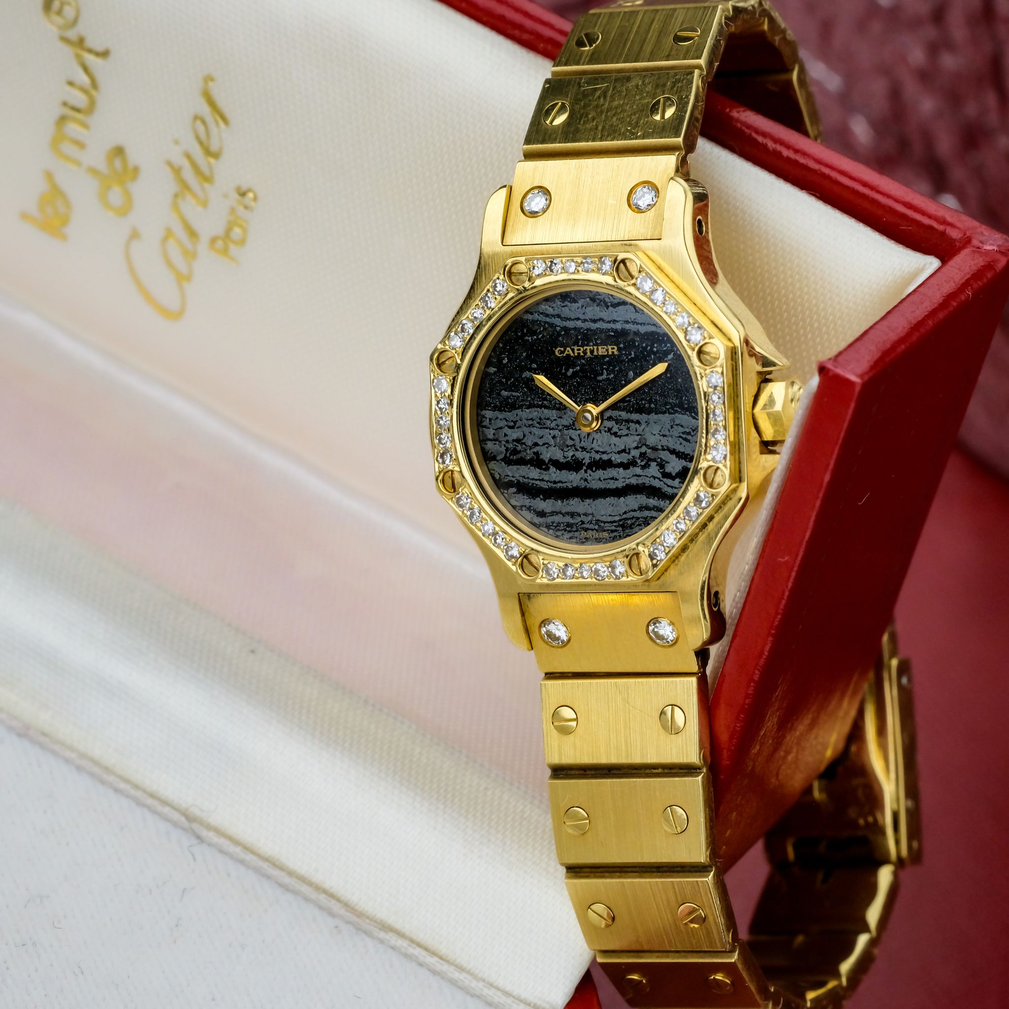 Rare Carrier Santos Octagon ladies model in unworn condition with perfect "ferrite" dial.