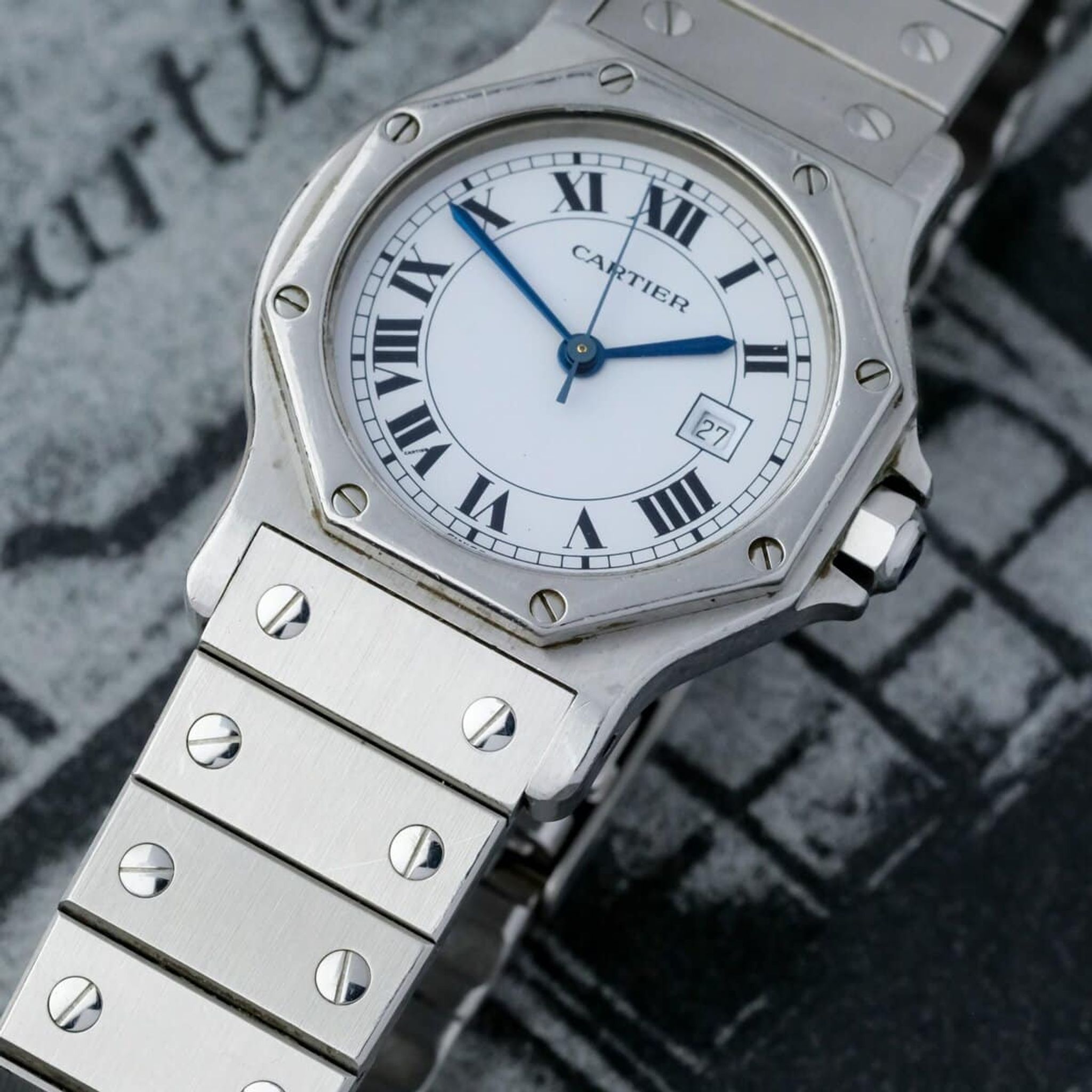 This Cartier Santos Octagon GM reference 2965 is a refined and sporty expression of one of Cartier’s most distinctive designs. Crafted in stainless steel, the watch features the iconic octagonal bezel with exposed screws and an integrated bracelet that together define the unmistakable Santos aesthetic.
