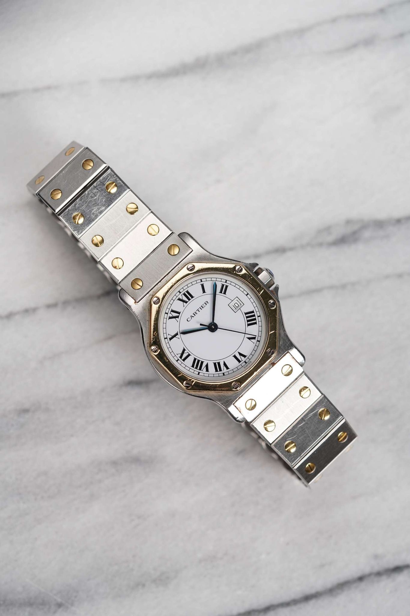 Here's a vintage Cartier reference 2966 two tone automatic octagon with a white Roman numeral dial from the late 80s, early 90s. Keeps great time and is fully functional. Measurements include a 30mm case size and 18mm lug width. Integrated bracelet with screws that fit up to a 7 inch wrist. Bracelet is in really great shape for its age. It's almost unworn and unpolished. Blue cabochon crown and blued hands. Matching black roman numerals and minute track. Quickset date function at 3 a clock. Stainless steel case and caseback. Brushed finishing on the case and polished finishing on the bracelet. The bracelet and case shimmer, depending on the light. Matching screws on the bezel and bracelet. Gold bezel and screws in the bracelet. Drilled lug holes. Makes for a great watch for both men and women. A nice thin profile. All the parts are original including the crown, dial, movement, and caseback. Both the dial and case are in great cosmetic, untouched condition.