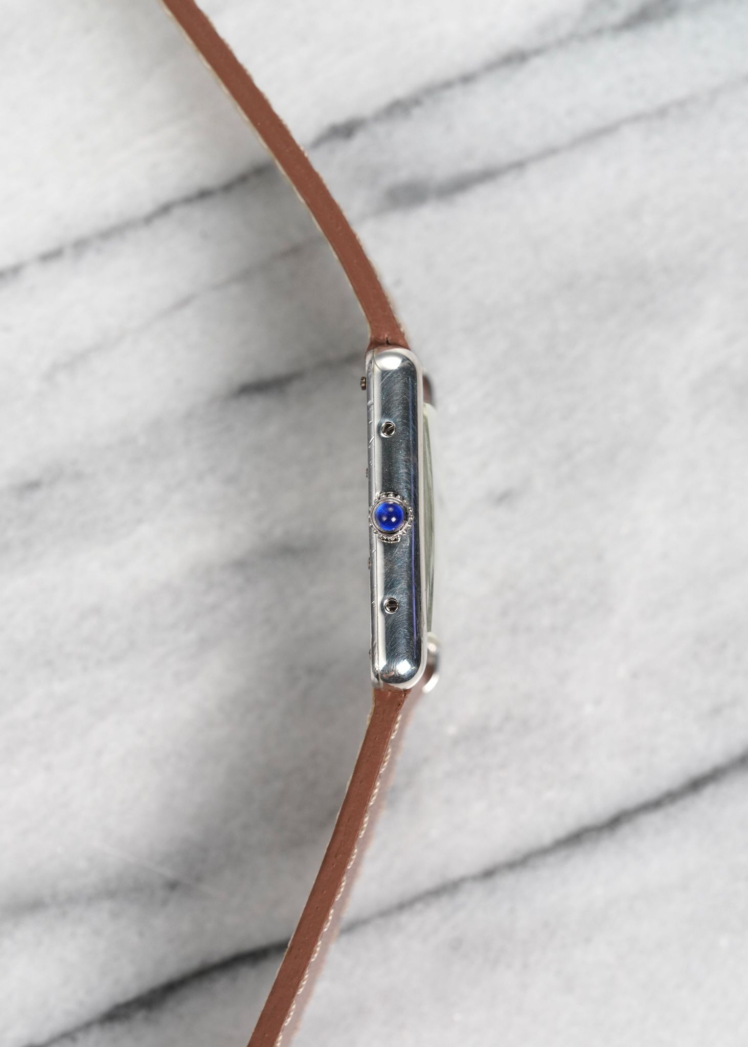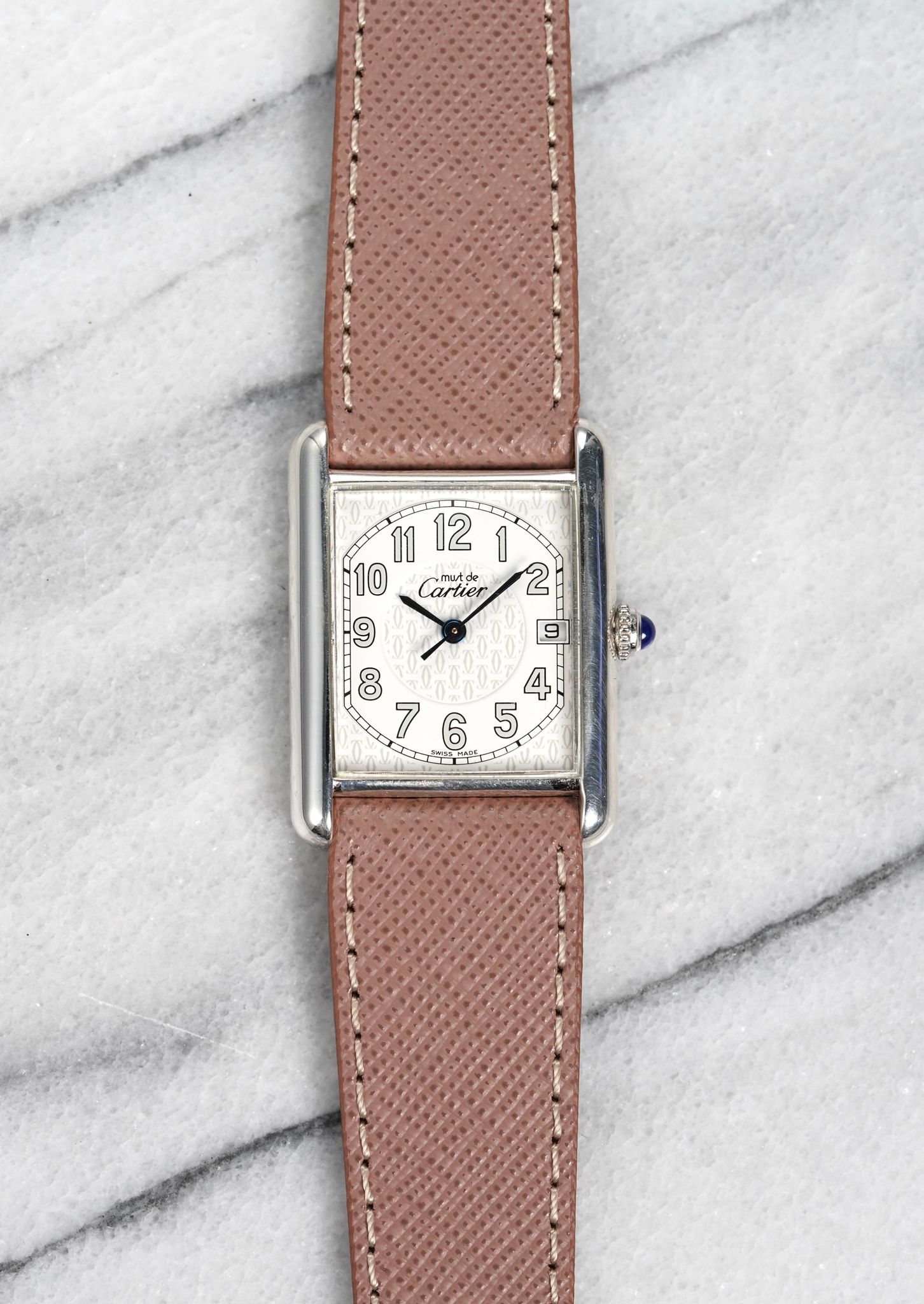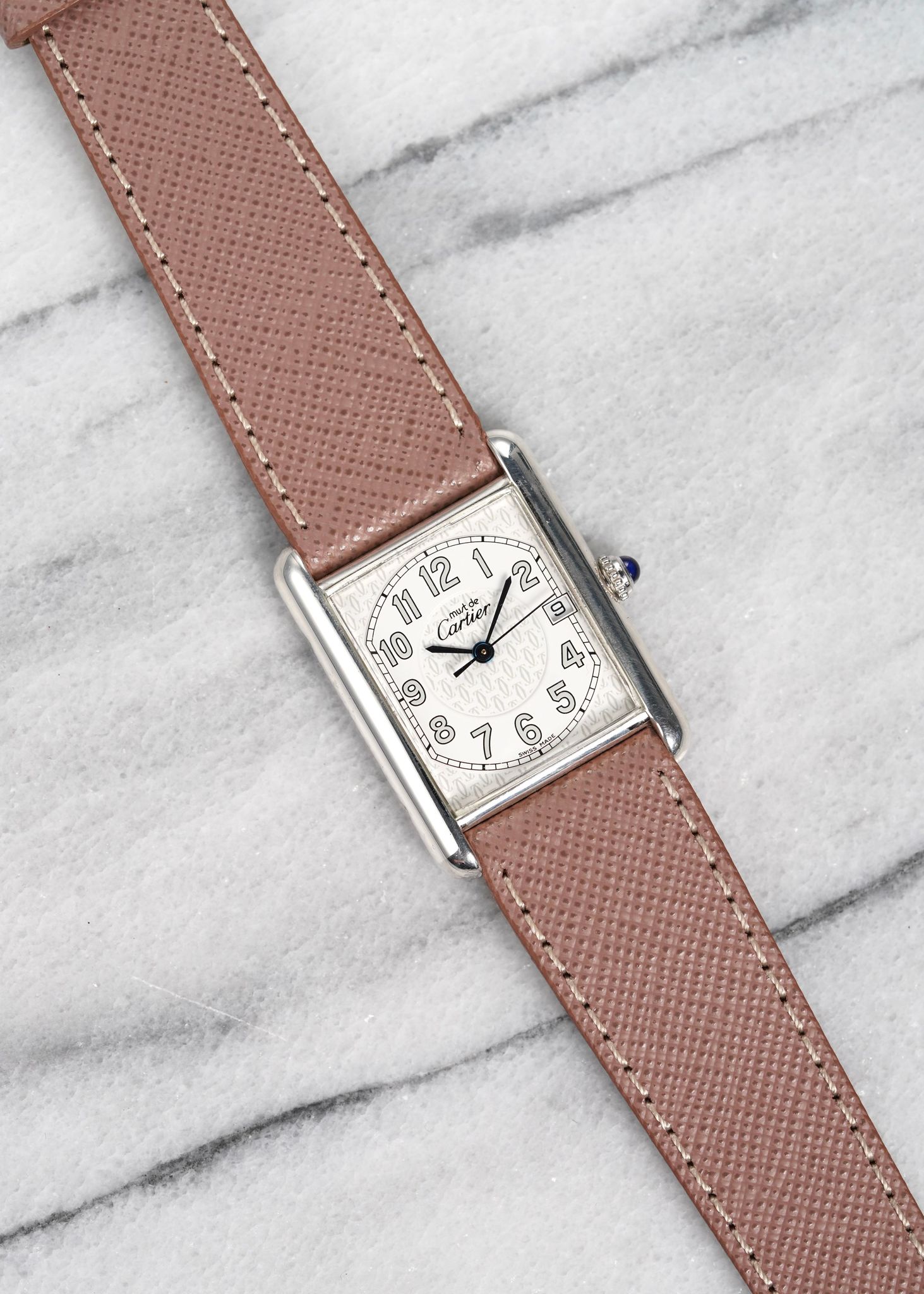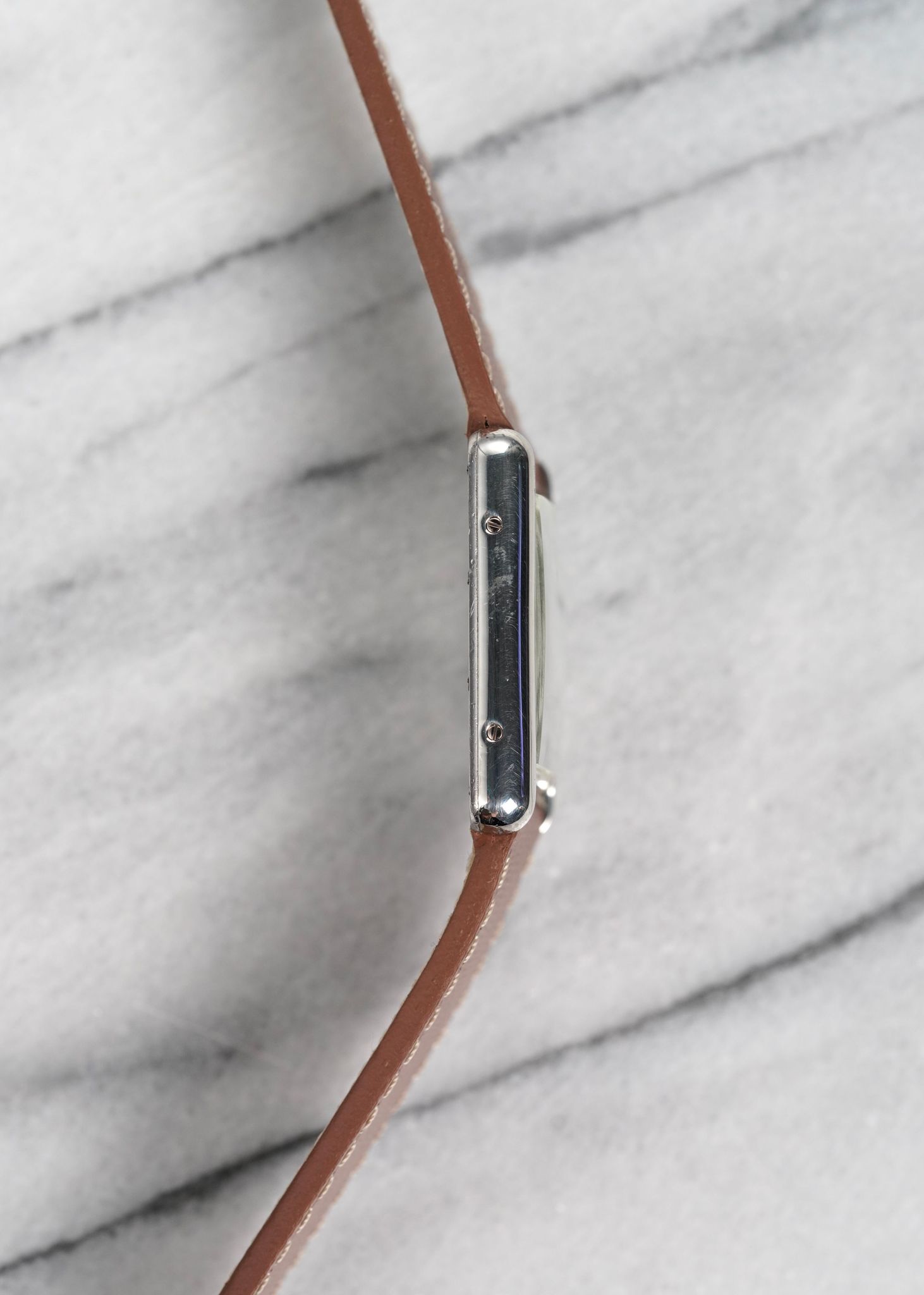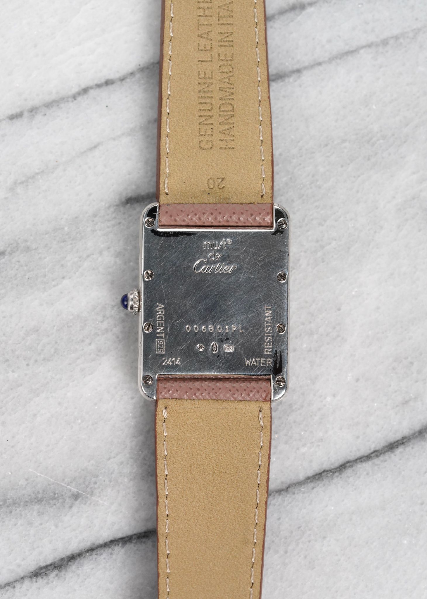 Here's a Cartier tank reference number 2414 quartz with a white roman numeral dial from the late 90s, early 2000s. Keeps great time and is fully functional. Measurements include a 25mm case and 19mm lug width. On an aftermarket grey pebble textured leather strap (Made in Italy). Features include the time and quickset date function at 3 a clock. Solid silver case. White dial with matching blue roman numerals and minute track. Blued hands. The case and casebacks silver color are still in tact. Blue cabochon crown. Both the dial and crystal are free from any scratches or marks. All parts are original including the crown, dial, and caseback. Both the dial and case are in great cosmetic, untouched condition.