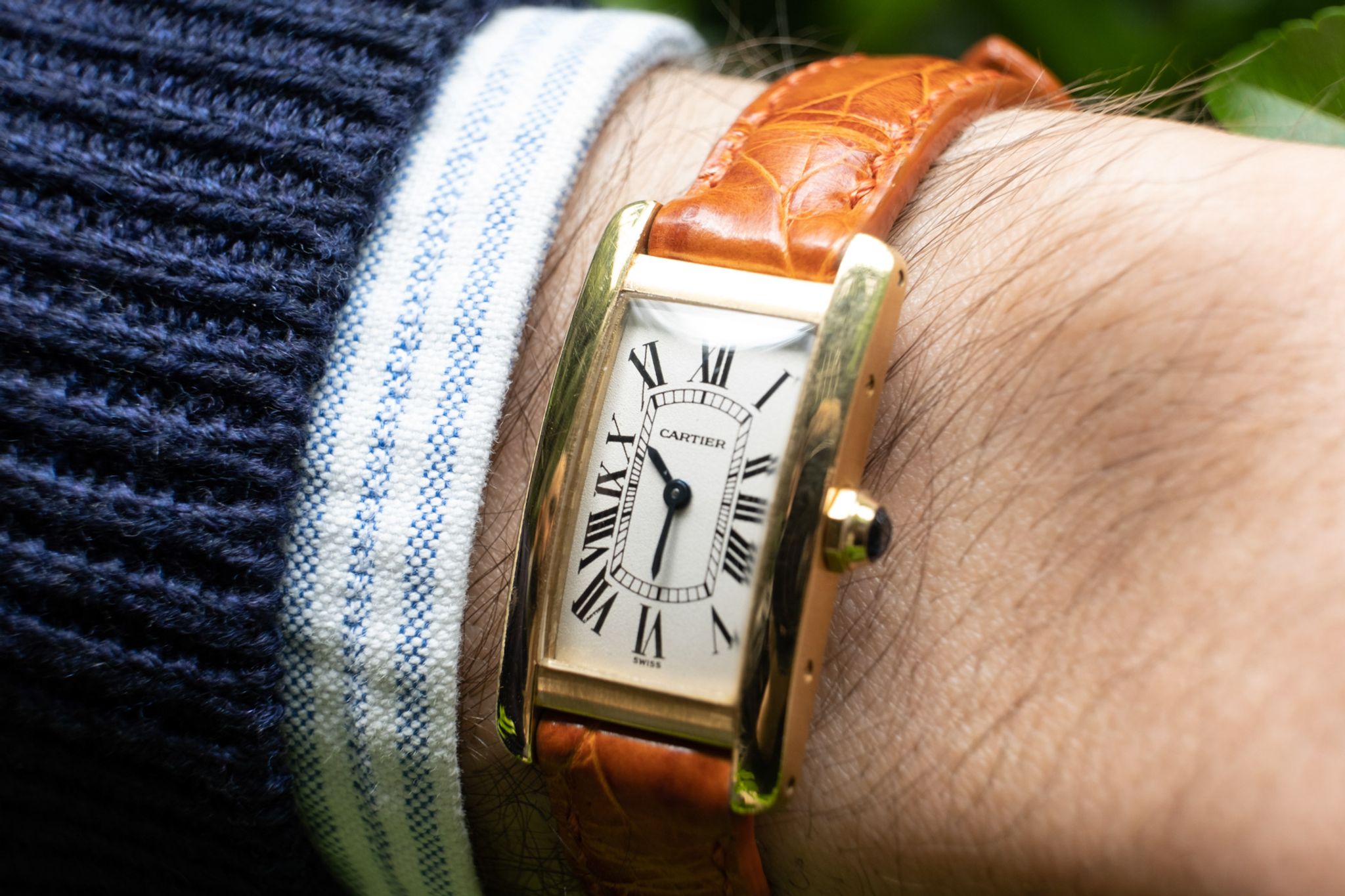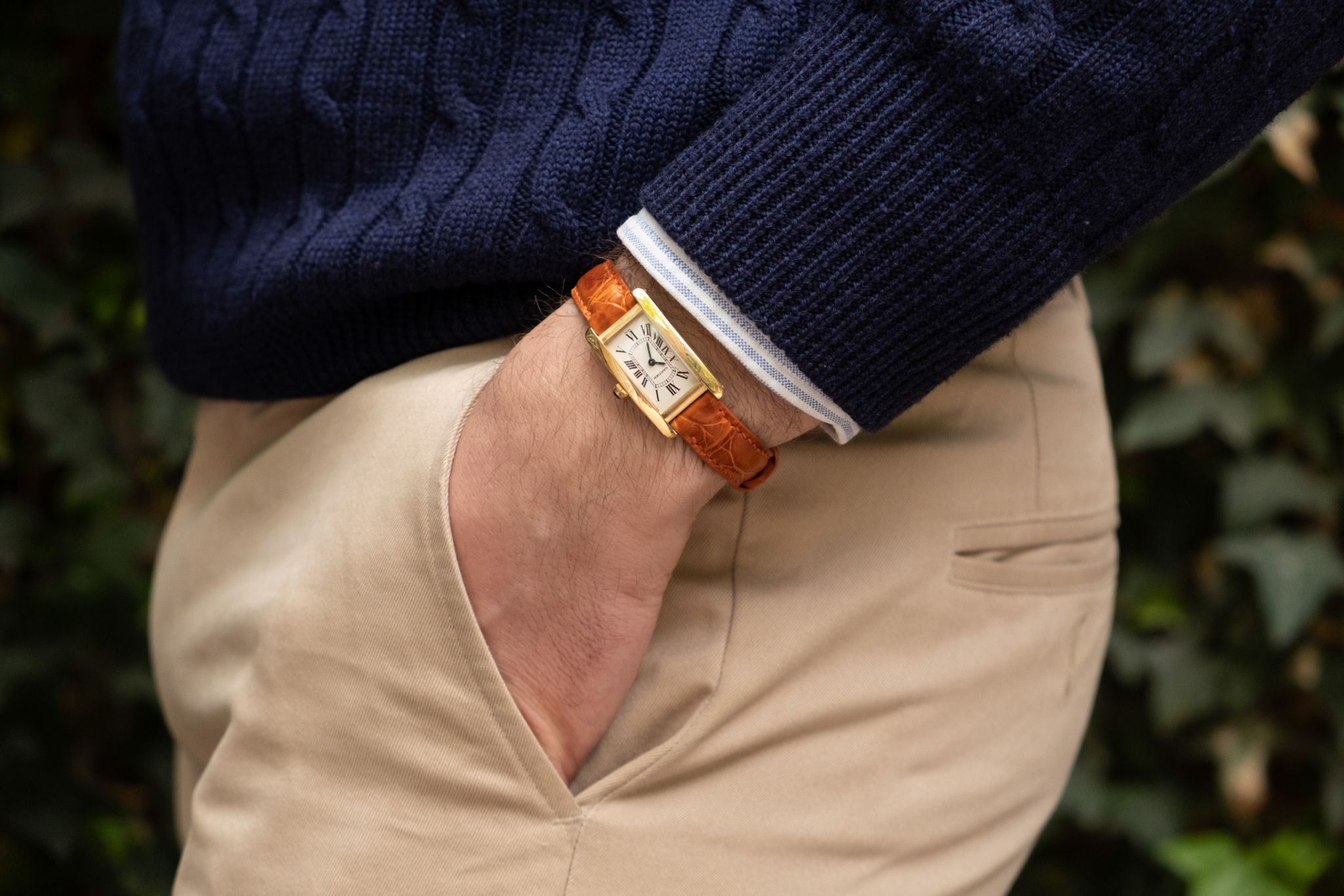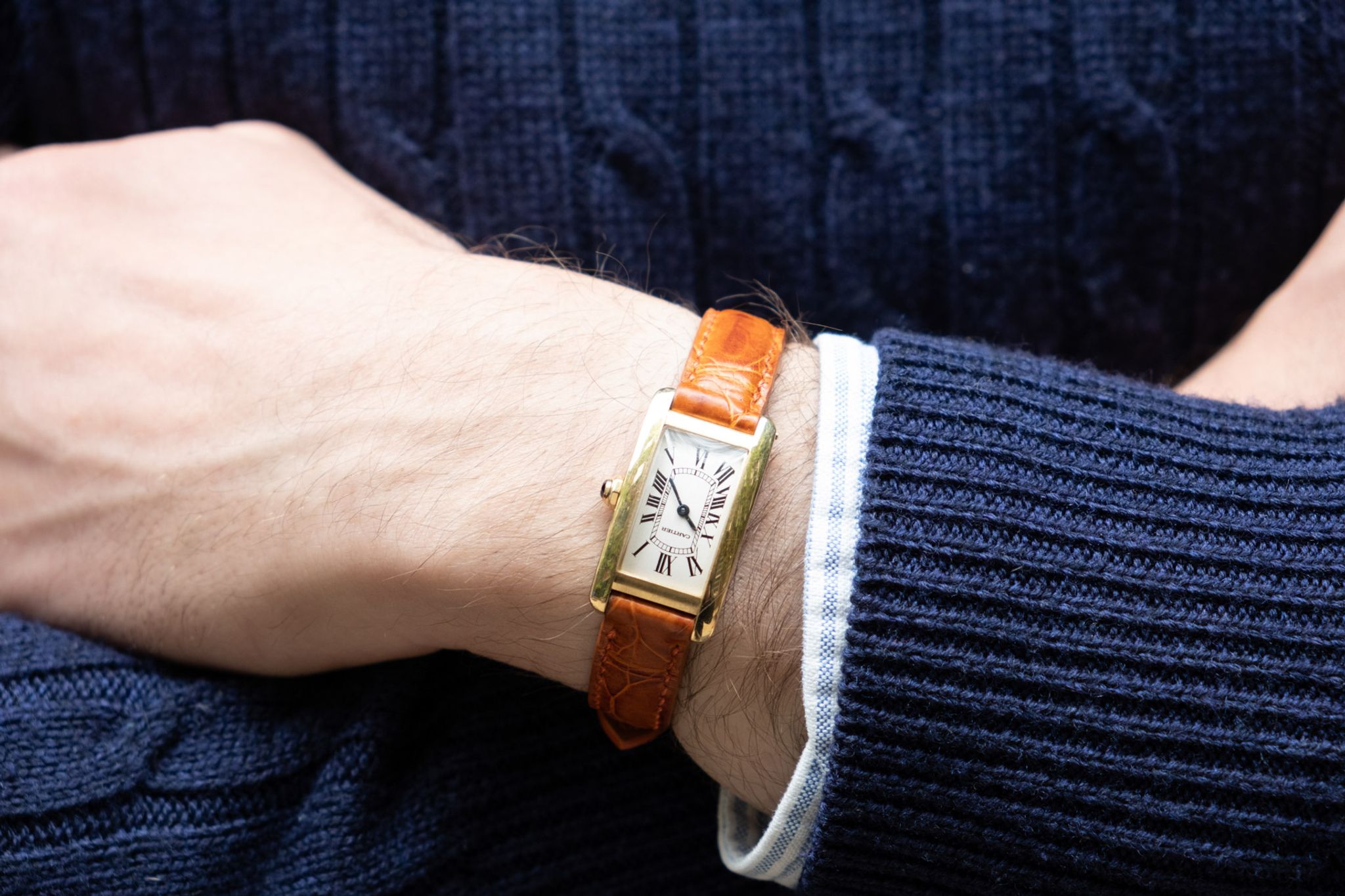 For me, the cognac alligator strap is what ties the knot. The contrast of colour adds a subtle pop and throw back to your favourite ivy league sweater. Overall, this Tank Americaine carries a strong value proposition - it's precious, it's versatile and it gives you a Cintrée-like design for one fifth of its price. It's the perfect small gold watch.