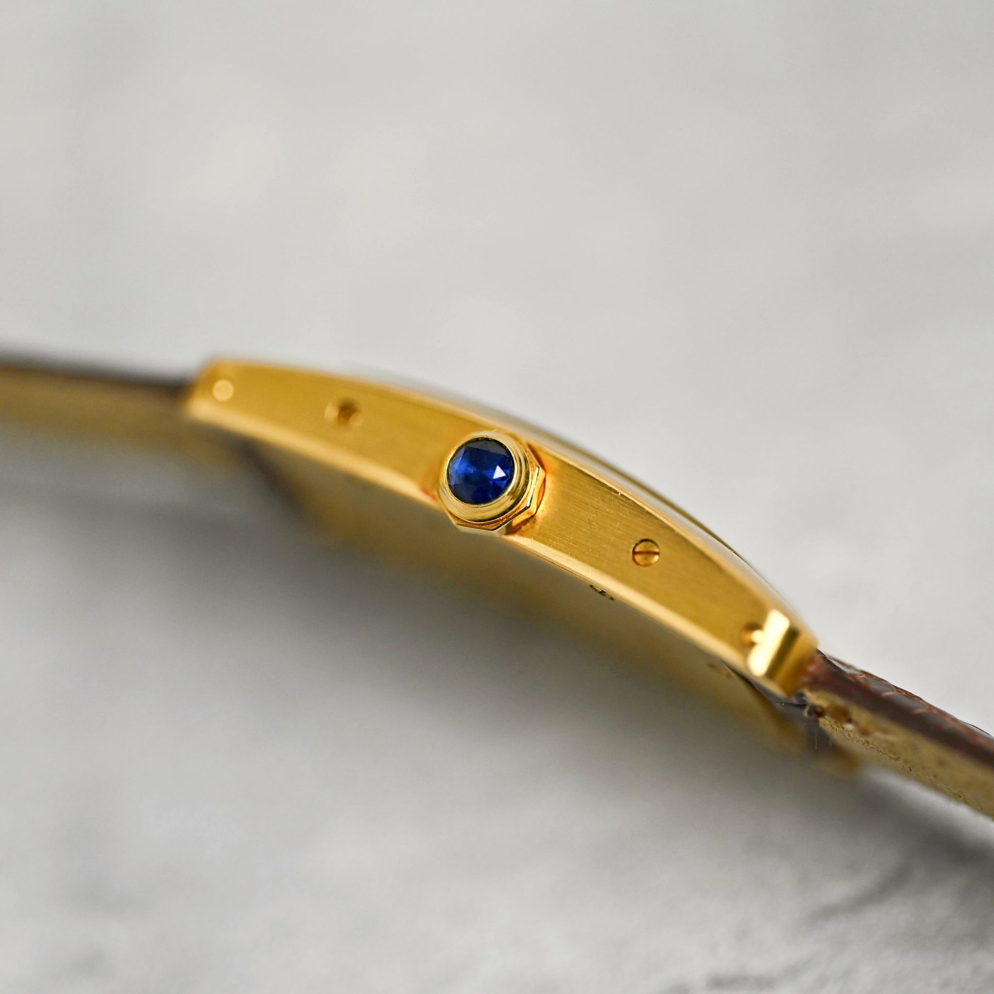 Let's explore some of its remarkable features. Starting with the crown, this model replaces the traditional cabochon Spinel with a beautifully faceted gem that complements the unique "nut-style" crown. The elongated case, made of 18k yellow gold, houses a reliable quartz movement, ensuring a hassle-tree wearing experience.