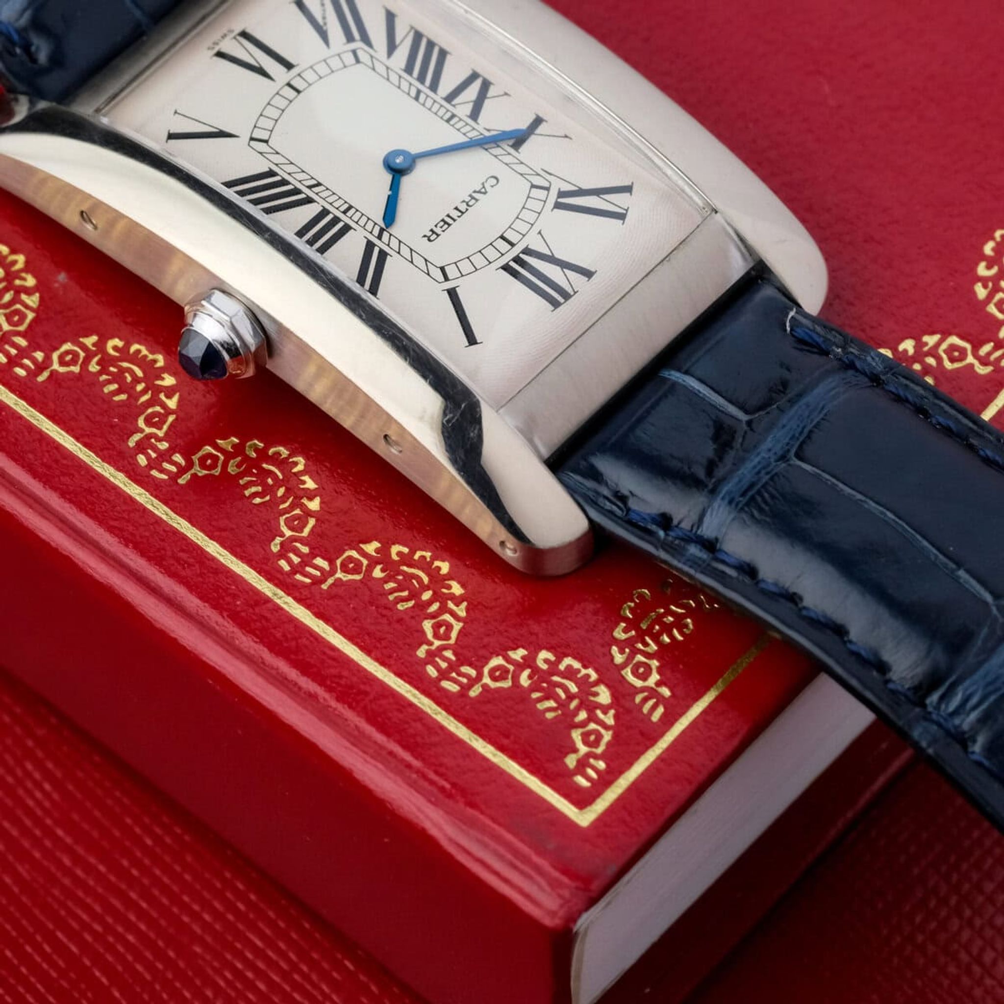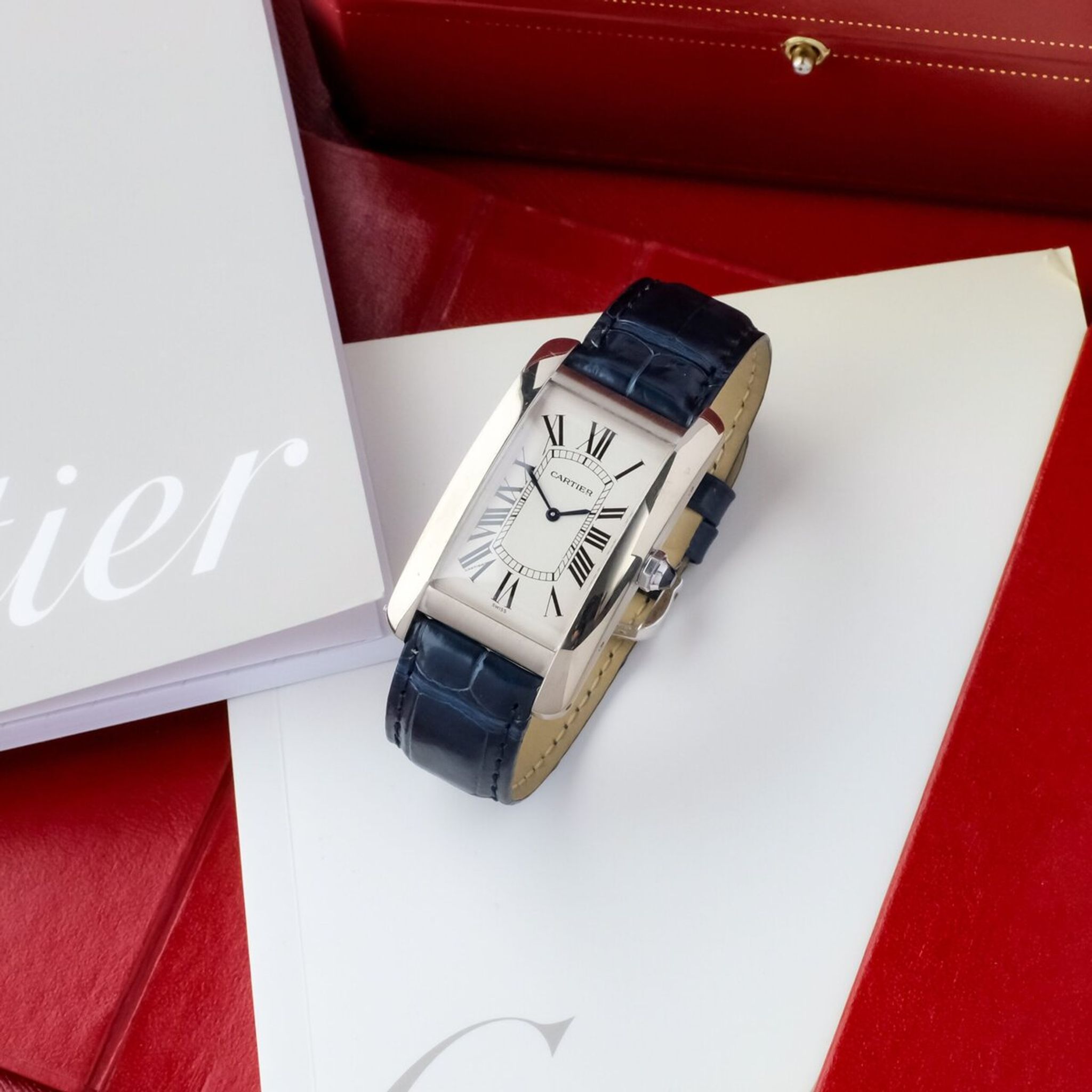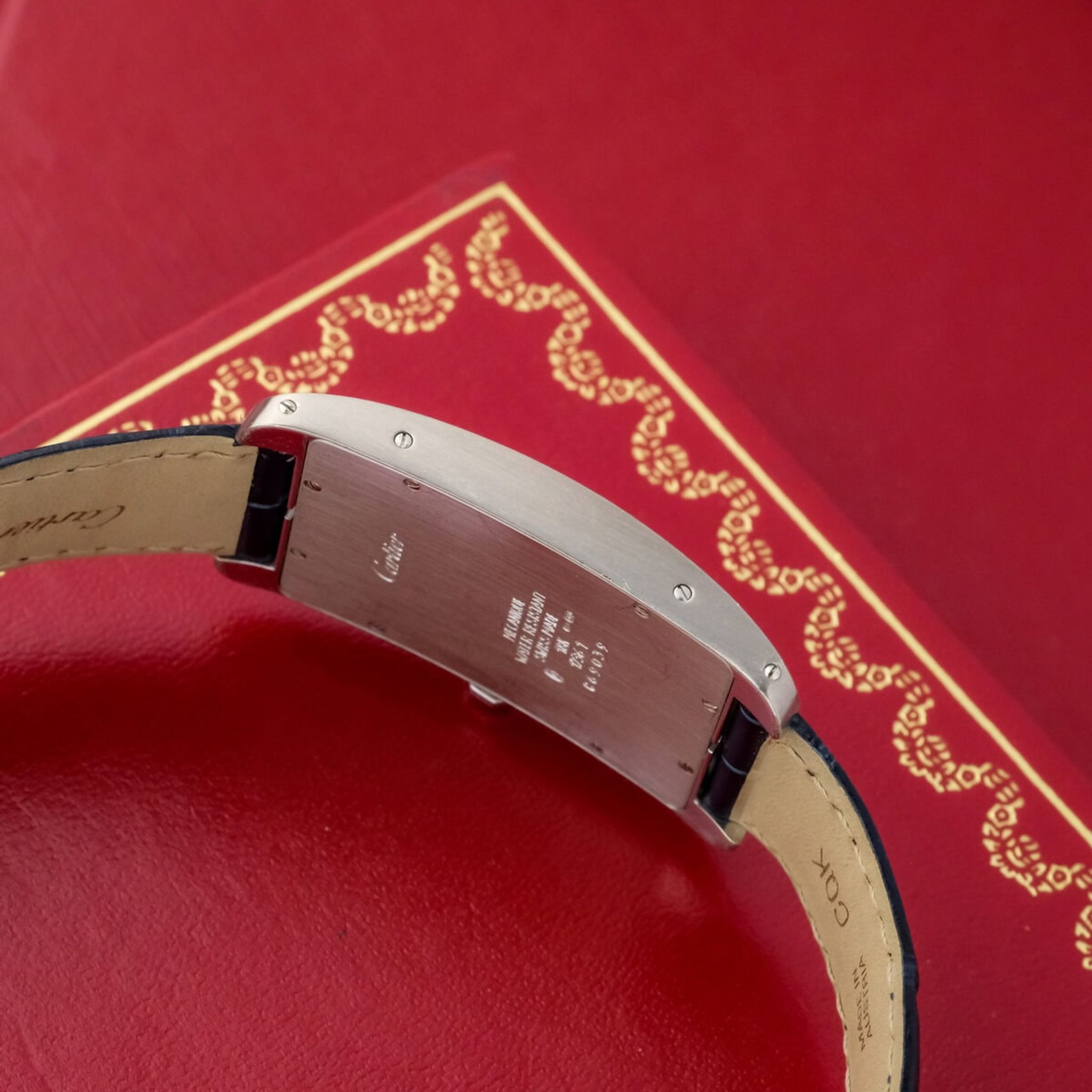 Powered by a hand wound movement, this watch preserves the slim profile and traditional charm that makes the Américaine one of Cartier’s most sophisticated models. It remains in good overall condition with natural signs of wear, unpolished surfaces, sharp hallmarks and its original Cartier leather strap paired with the matching Cartier white gold pin buckle. Offered as a full set from 2002, it stands out as a complete and beautifully preserved example of Cartier’s commitment to refinement and enduring style.