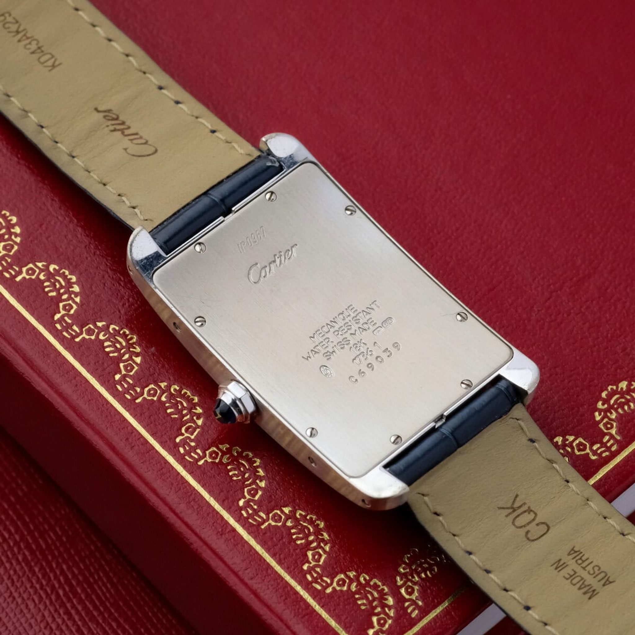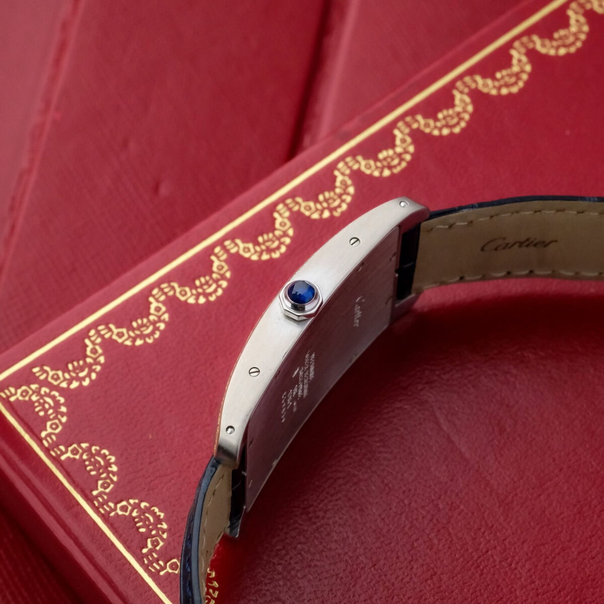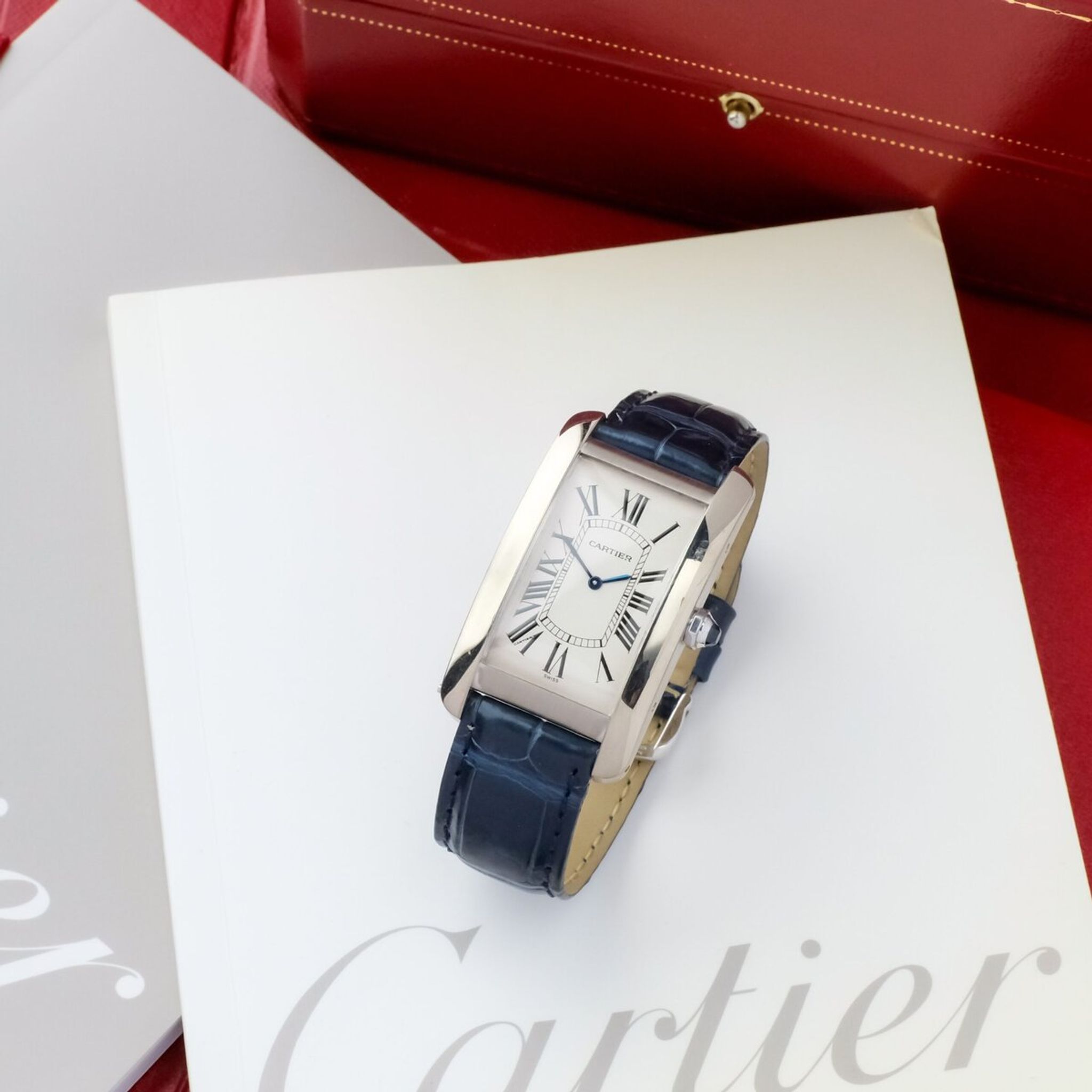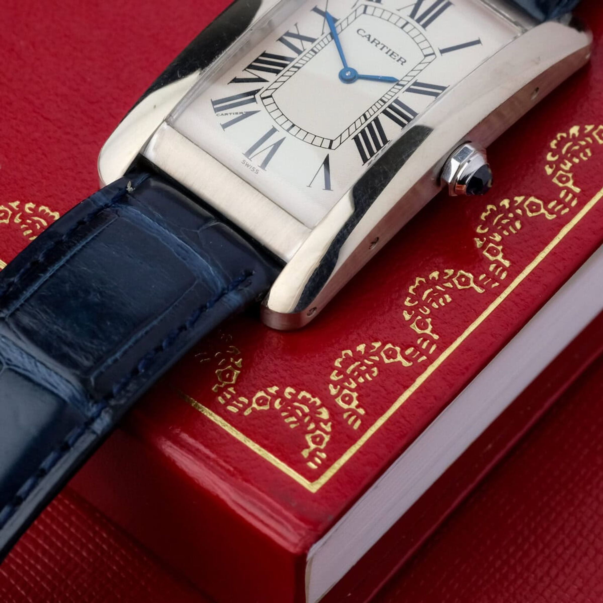Powered by a hand wound movement, this watch preserves the slim profile and traditional charm that makes the Américaine one of Cartier’s most sophisticated models. It remains in good overall condition with natural signs of wear, unpolished surfaces, sharp hallmarks and its original Cartier leather strap paired with the matching Cartier white gold pin buckle. Offered as a full set from 2002, it stands out as a complete and beautifully preserved example of Cartier’s commitment to refinement and enduring style.