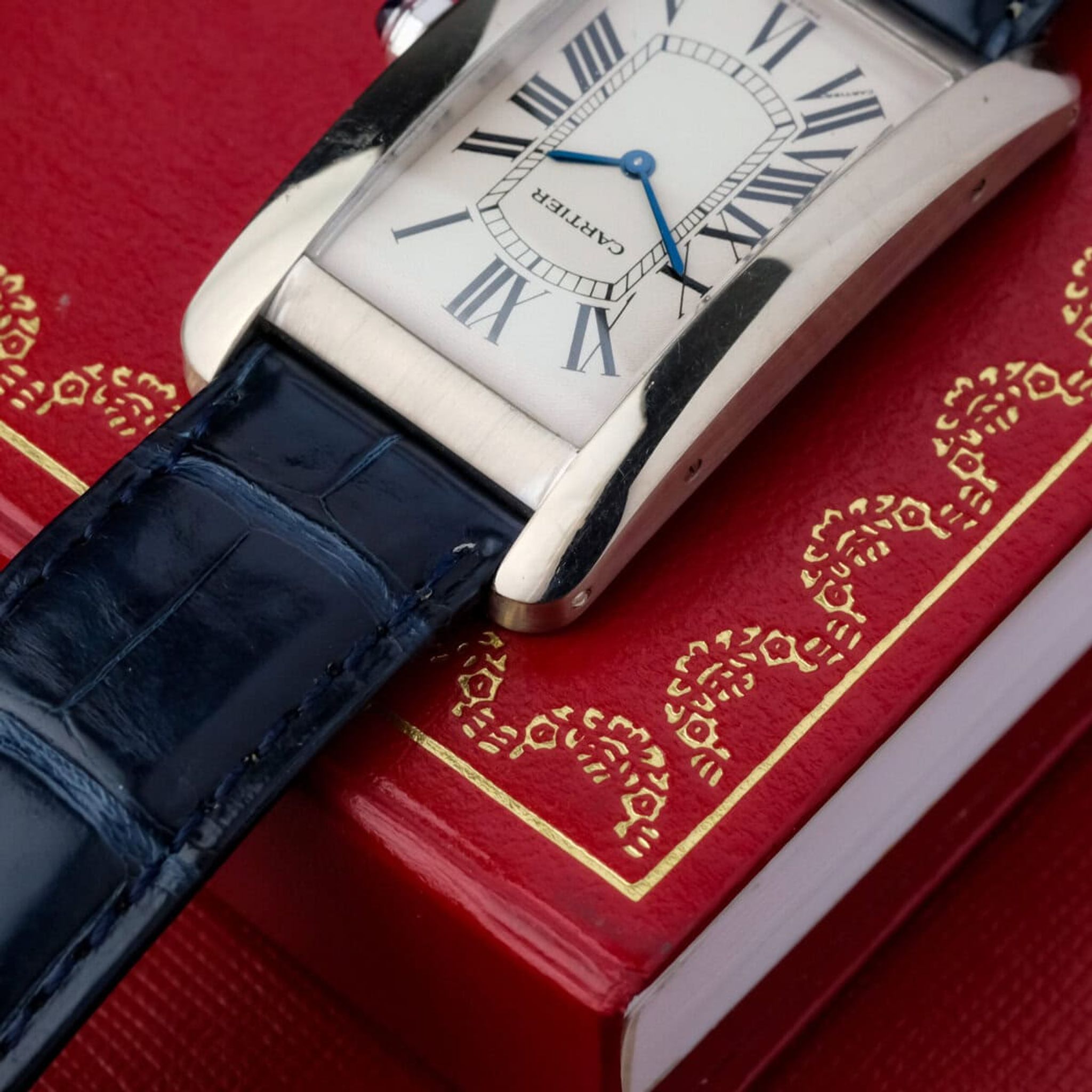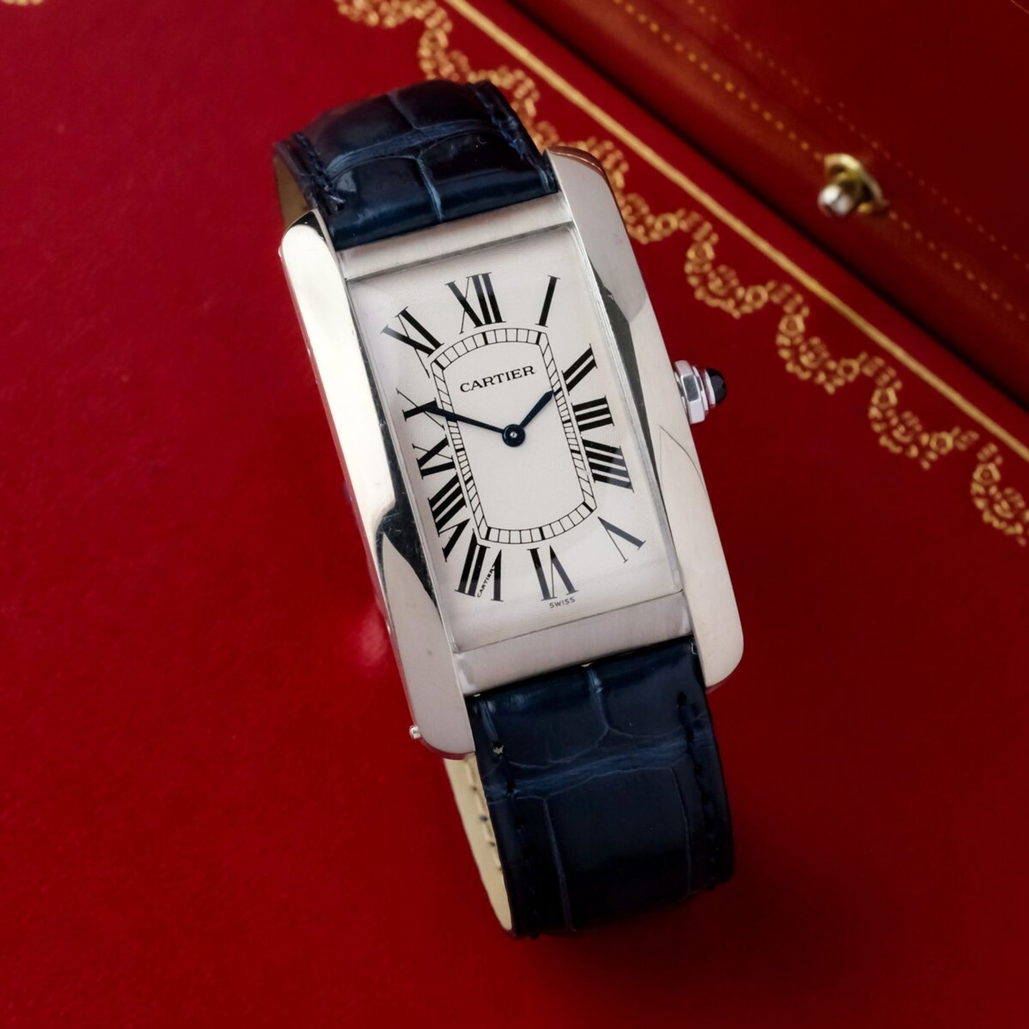 The elongated form of the Américaine is a modern evolution of the classic Tank Cintrée, offering slightly bolder proportions while retaining the same graceful curvature and timeless elegance. Its white dial is decorated with Cartier’s Roman numerals, blued steel hands and a chemin de fer minute track, details that together emphasize the maison’s distinctive design language.