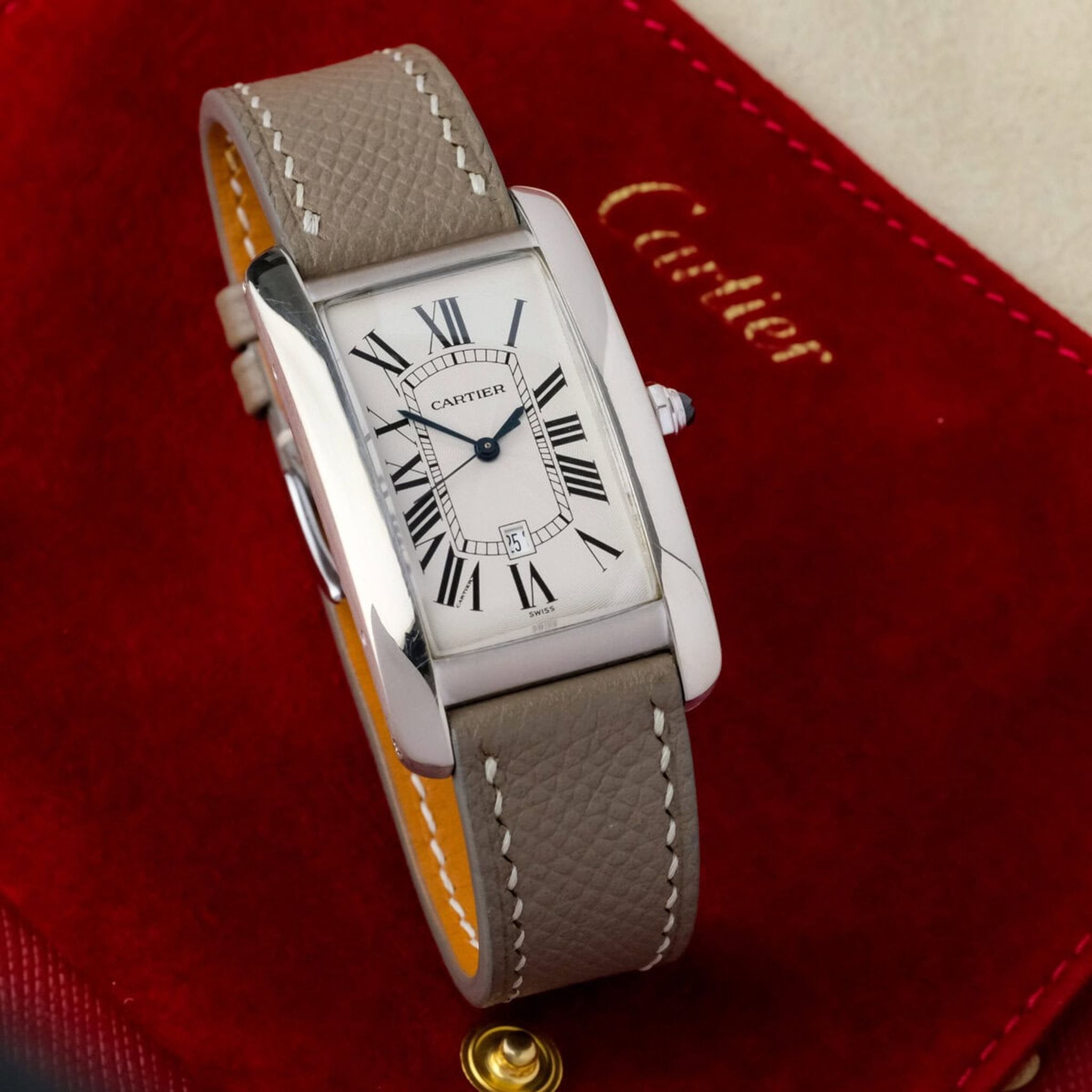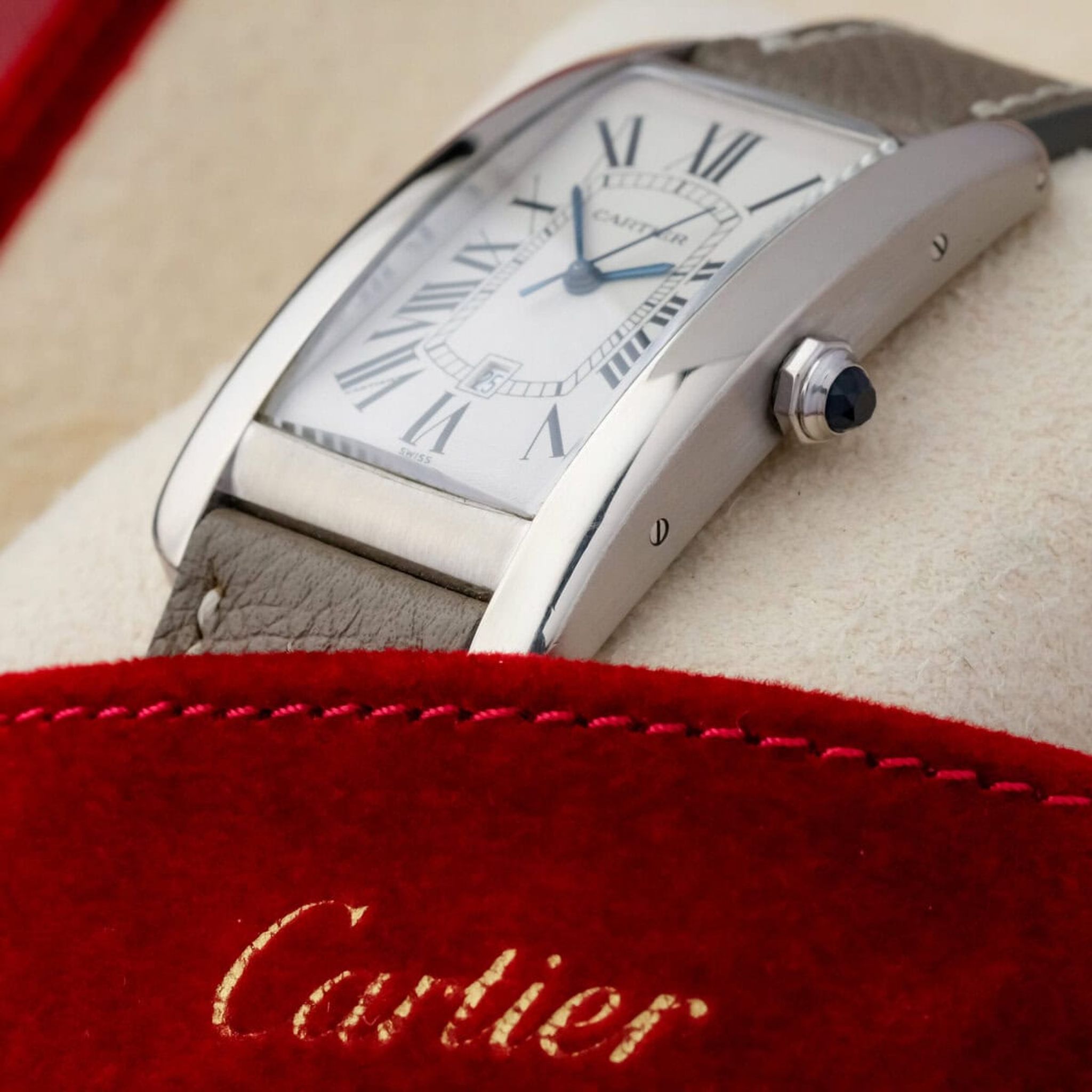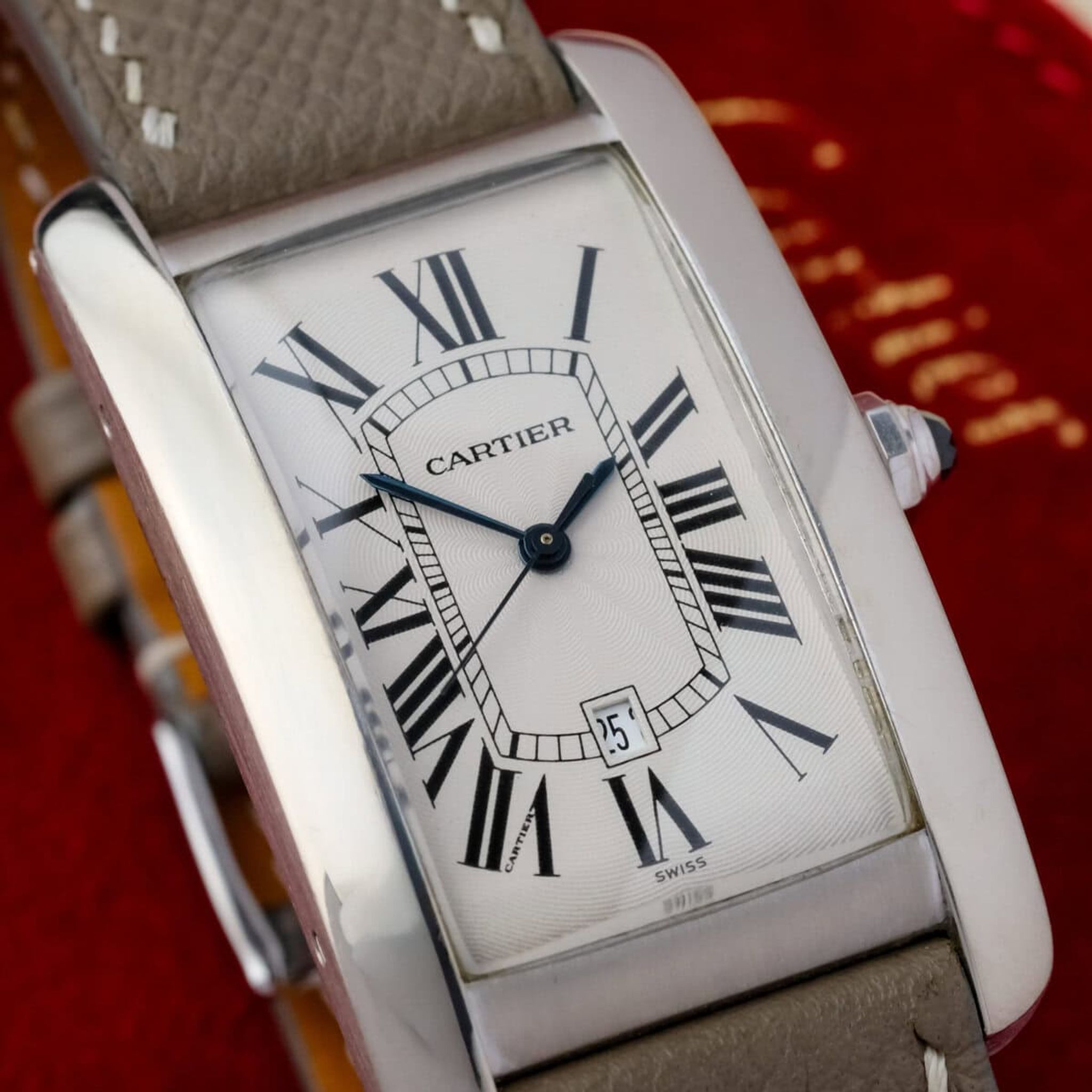 Fitted with a grey leather strap and offered as watch only, this Tank Américaine GM ref. 1741 remains in good overall condition and stands as a quintessential example of Cartier’s elegant design language and enduring refinement.
