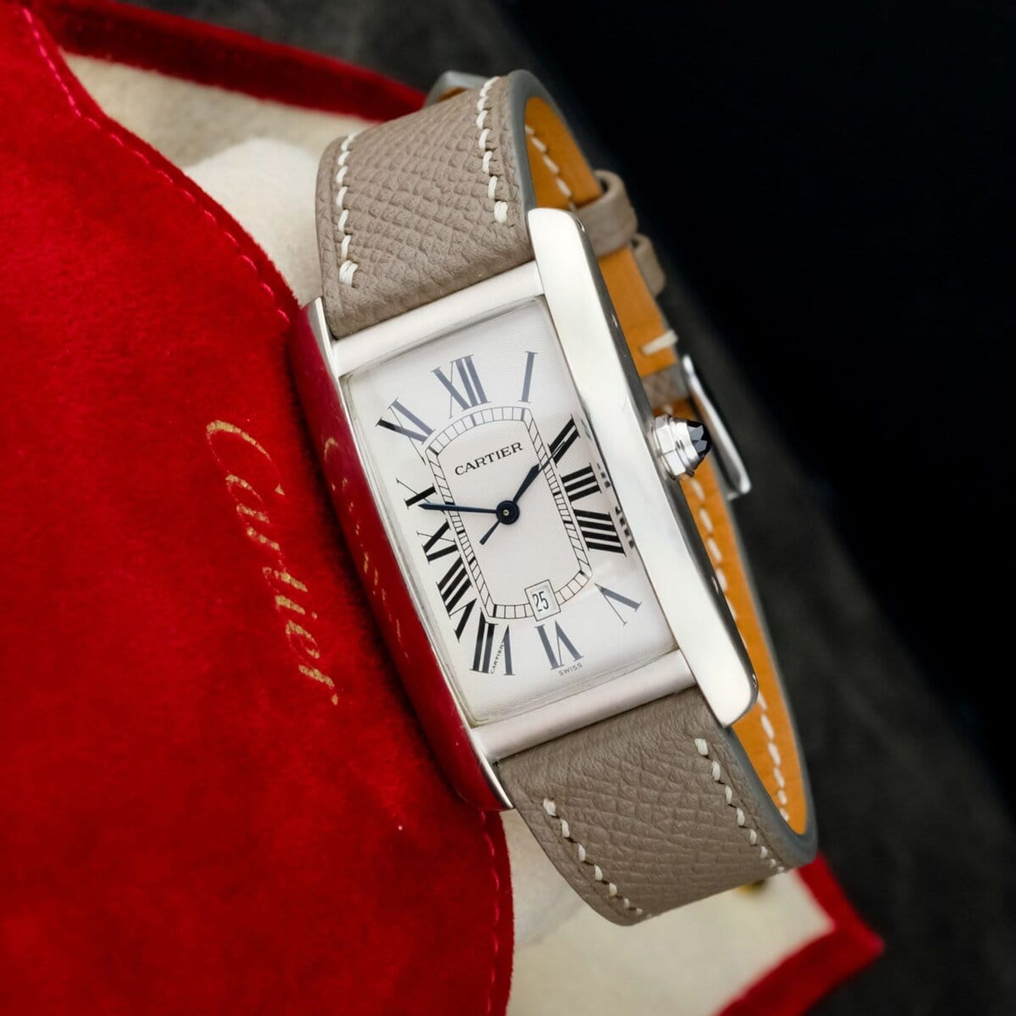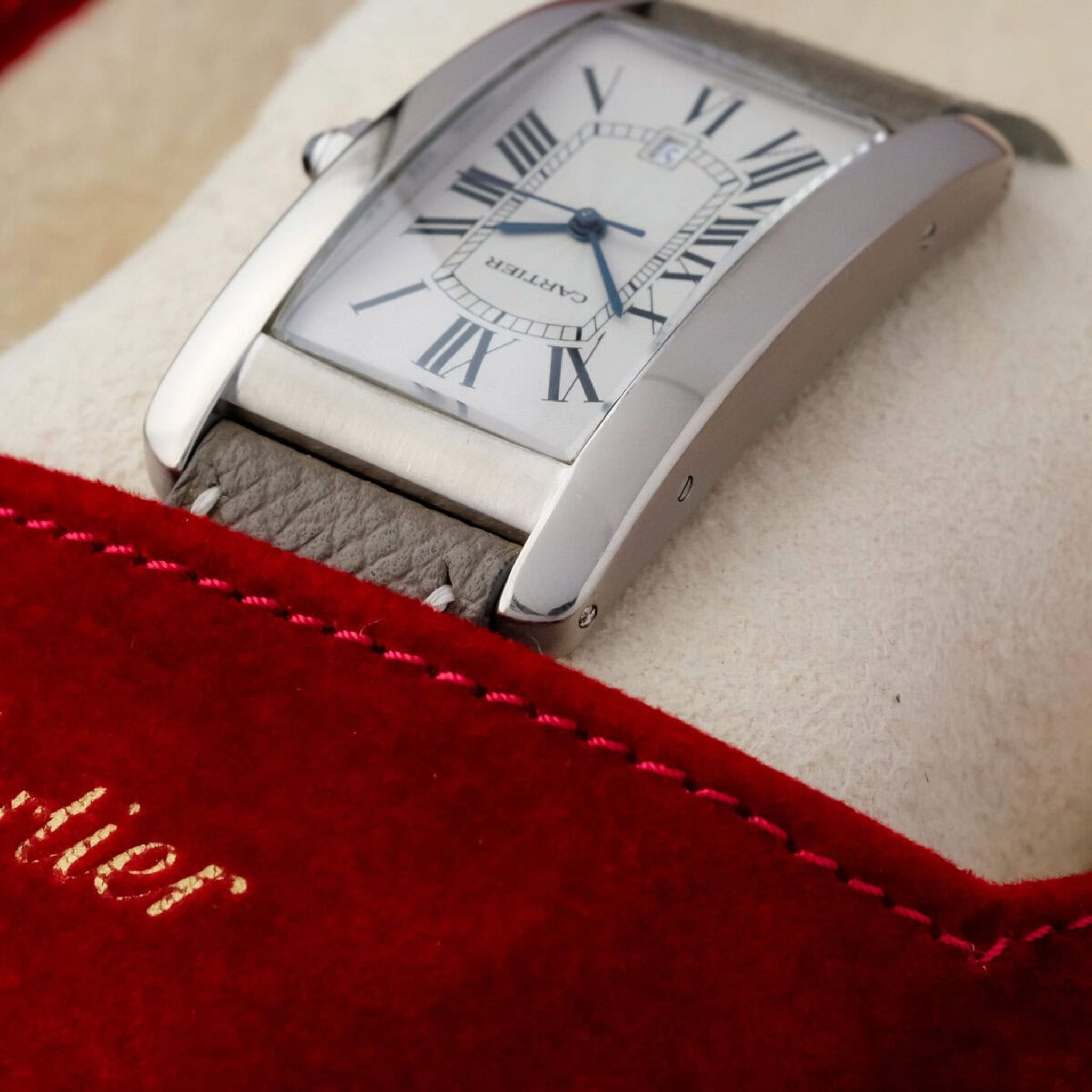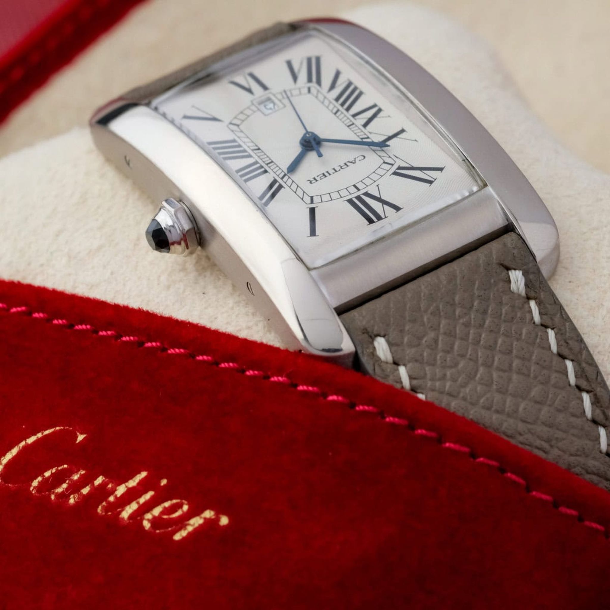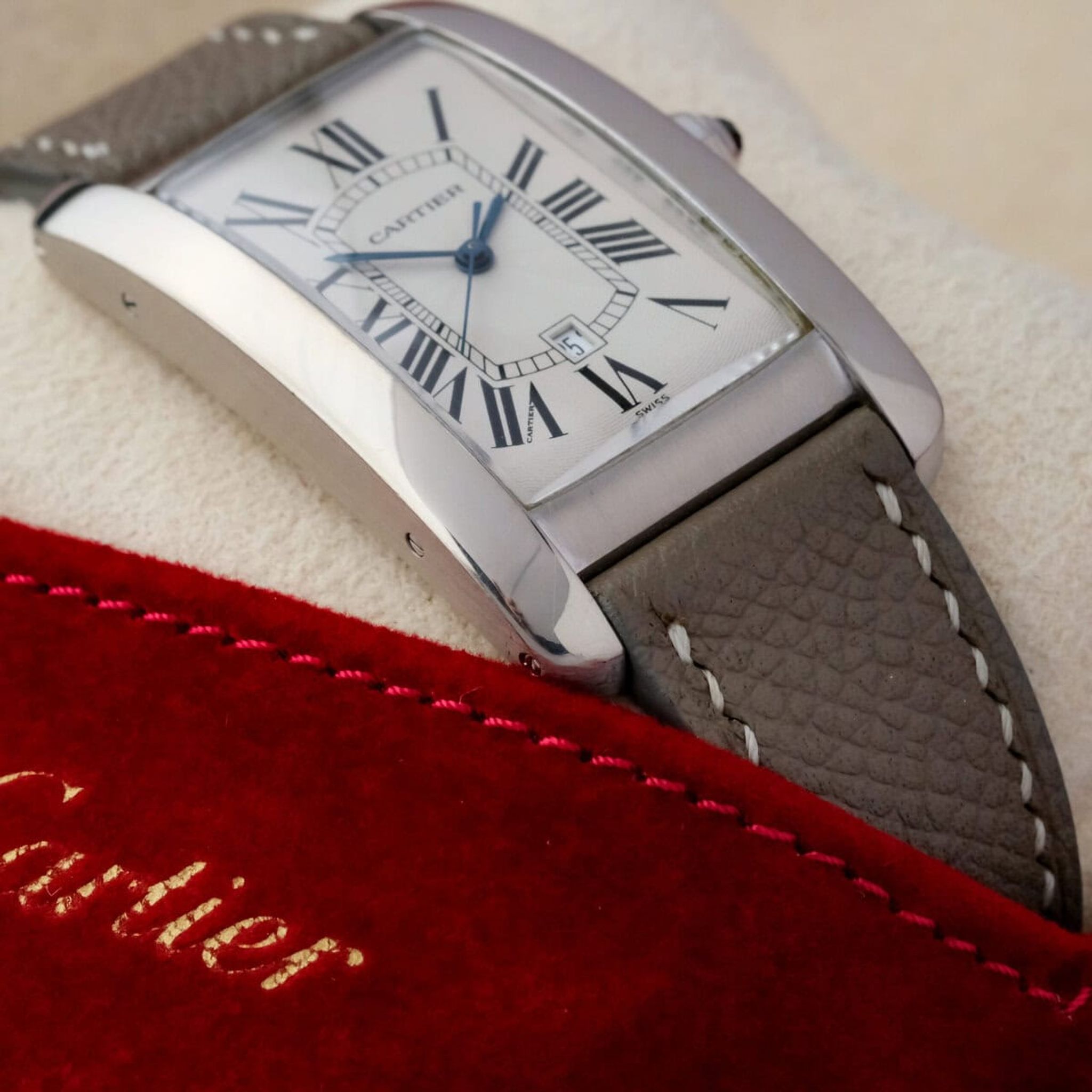 Fitted with a grey leather strap and offered as watch only, this Tank Américaine GM ref. 1741 remains in good overall condition and stands as a quintessential example of Cartier’s elegant design language and enduring refinement.