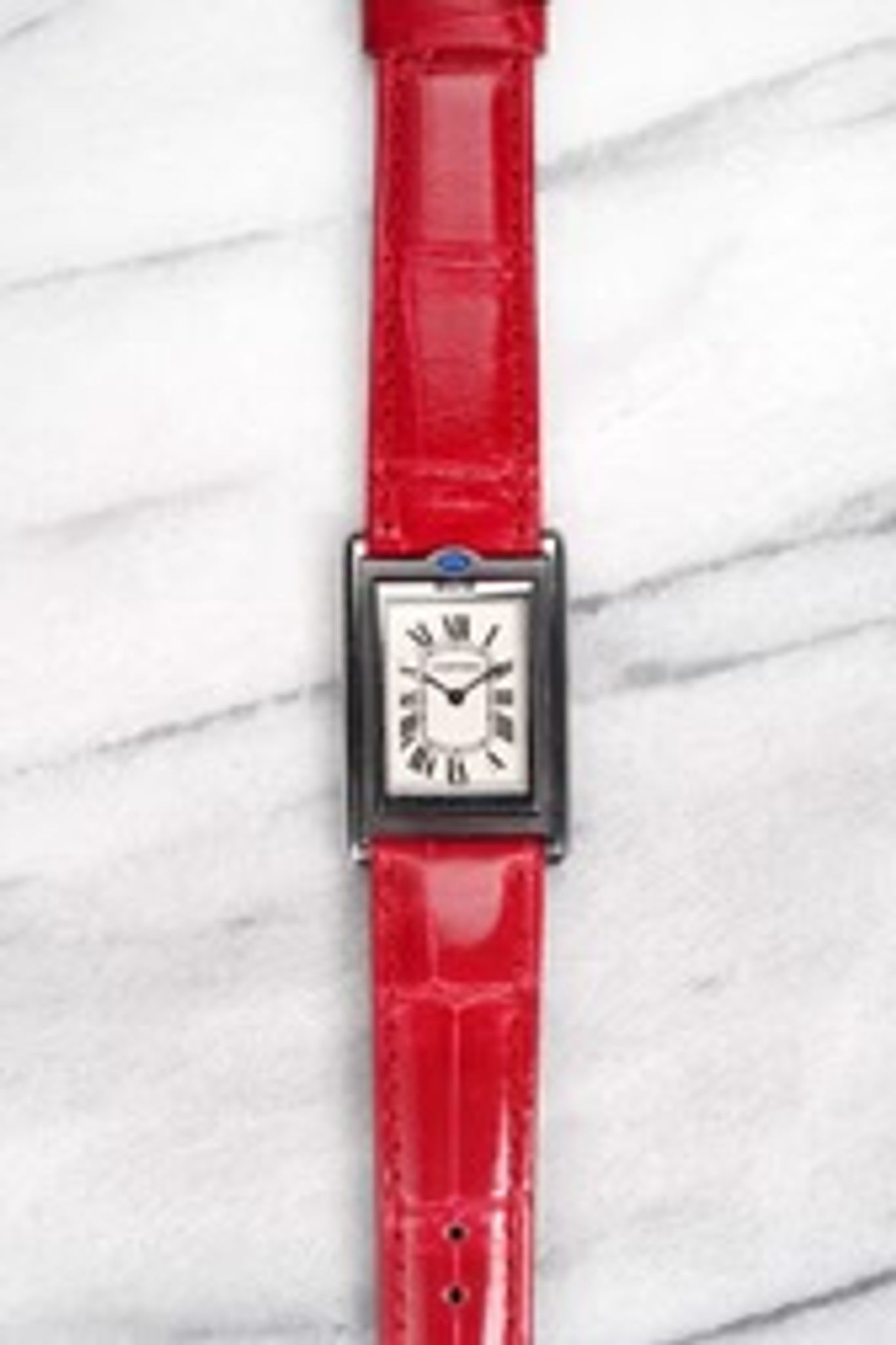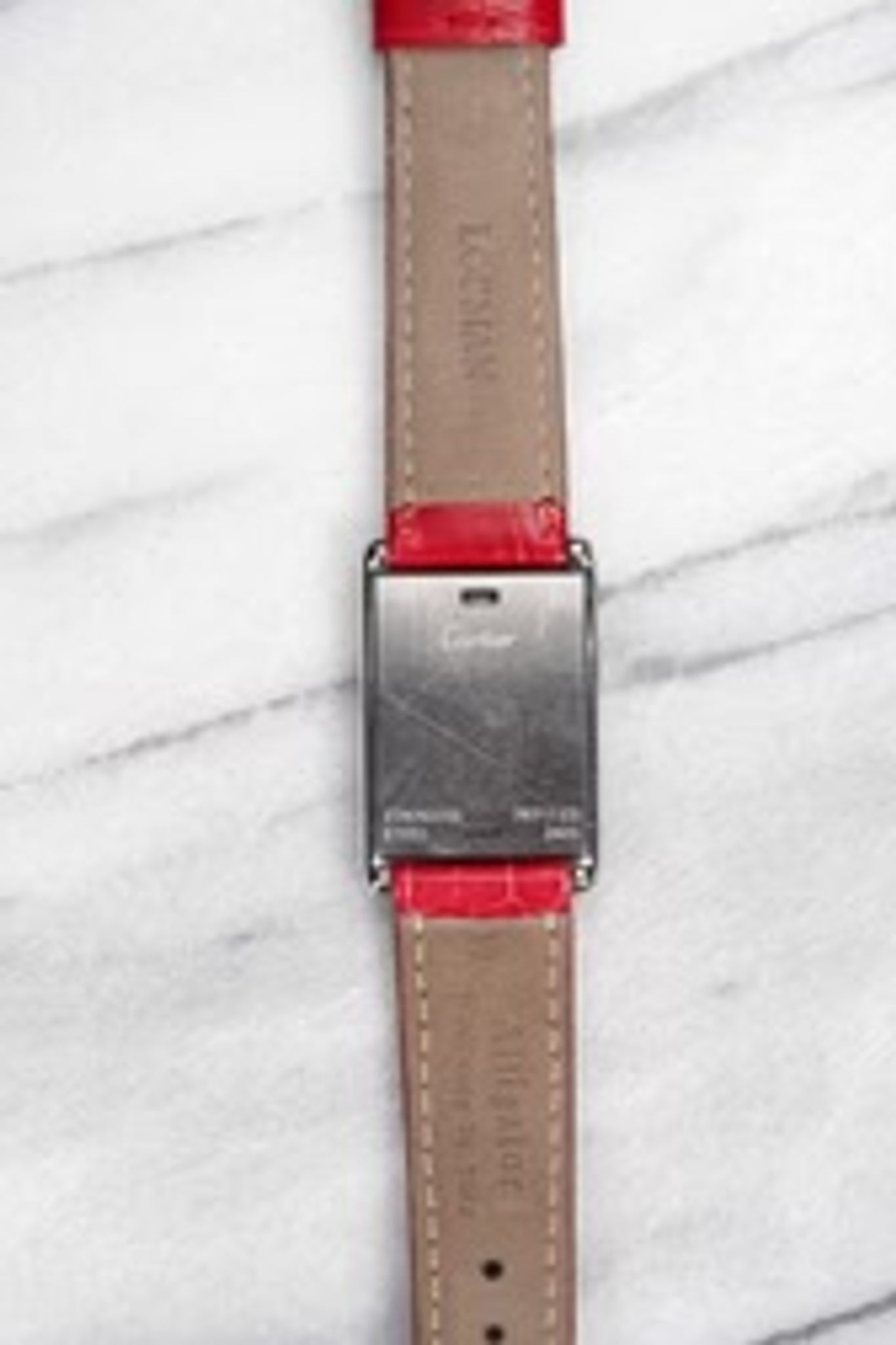 Here's a Cartier tank Basculante reference 2405 in steel quartz with a white roman numeral dial from the late 90s, early 2000s. Keeps great time and is fully functional. Measurements include a 24x35mm case and 20mm lug width. On its original pink leather strap and matching Cartier buckle. Features include the time and quickset date function at 3 a clock. Stainless steel case and caseback. White dial with matching black roman numerals and minute track. Blued hands. The case and casebacks silver color are still in tact. There is a personal engraving on the flip side. Blue cabochon crown. Both the dial and crystal are free from any scratches or marks. All parts are original including the crown, dial, and caseback. Both the dial and case are in great cosmetic, untouched condition.