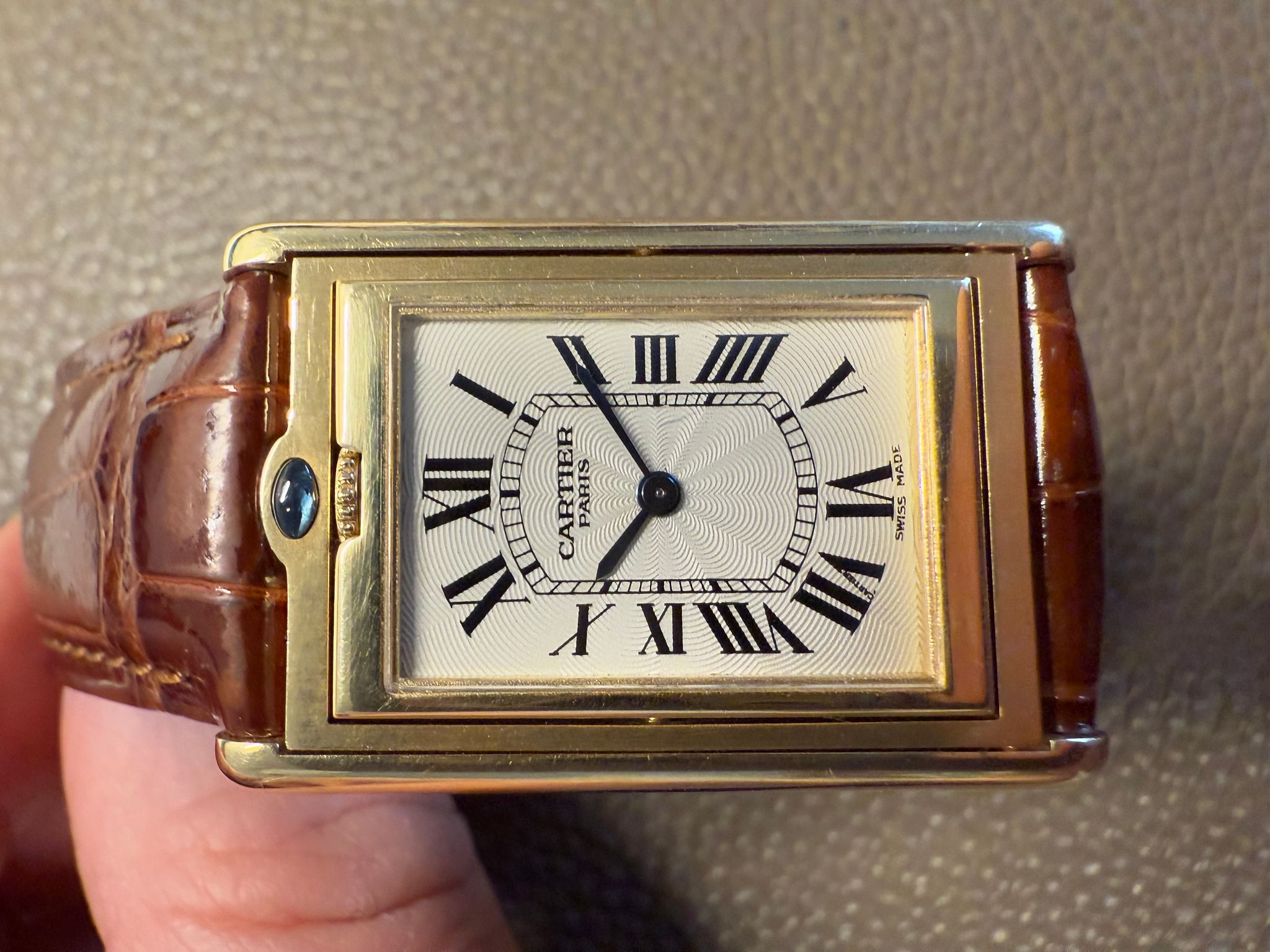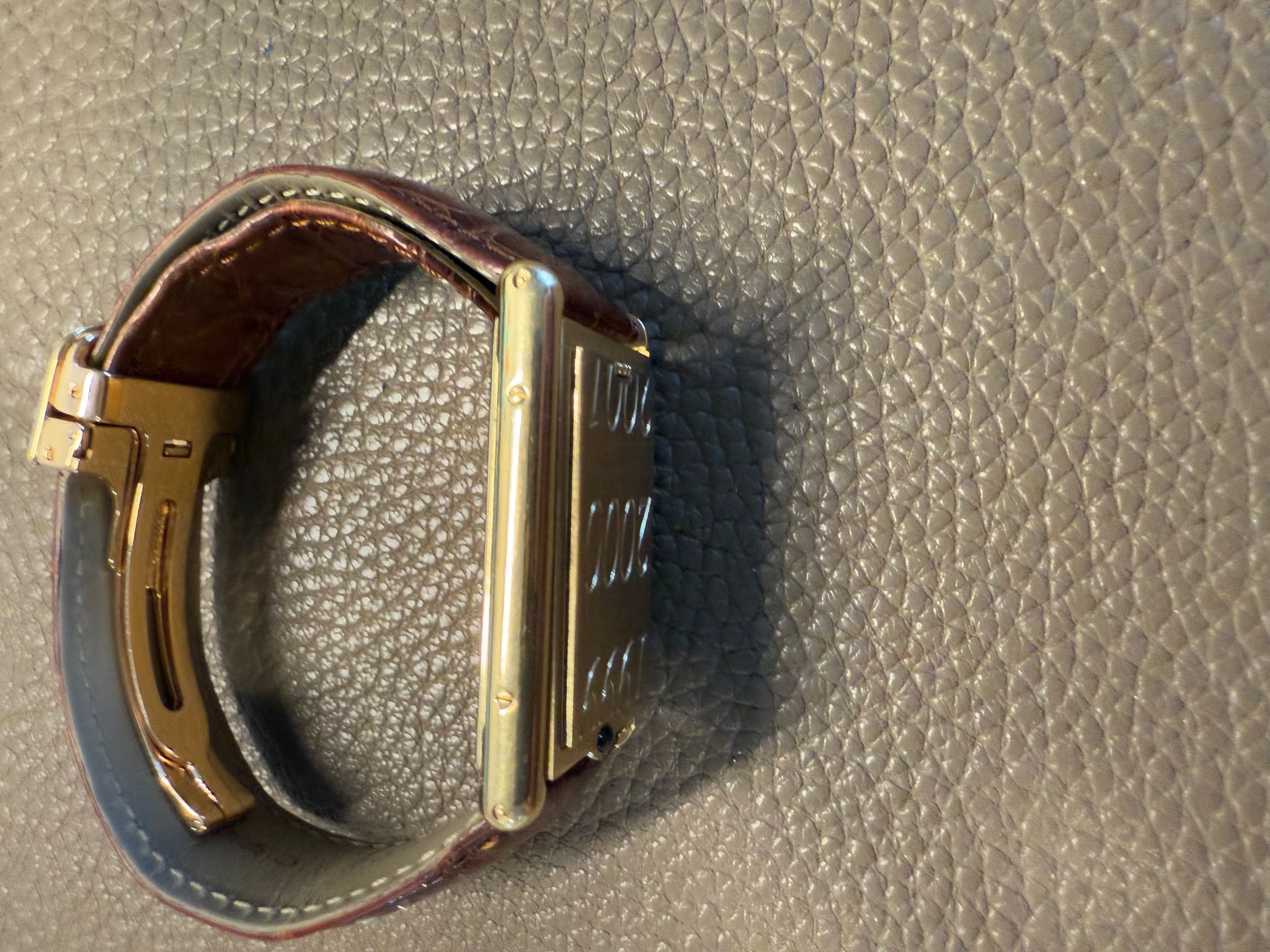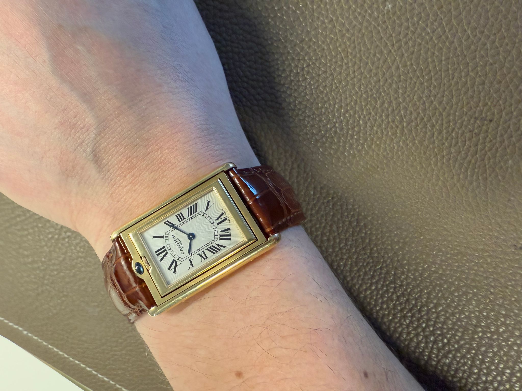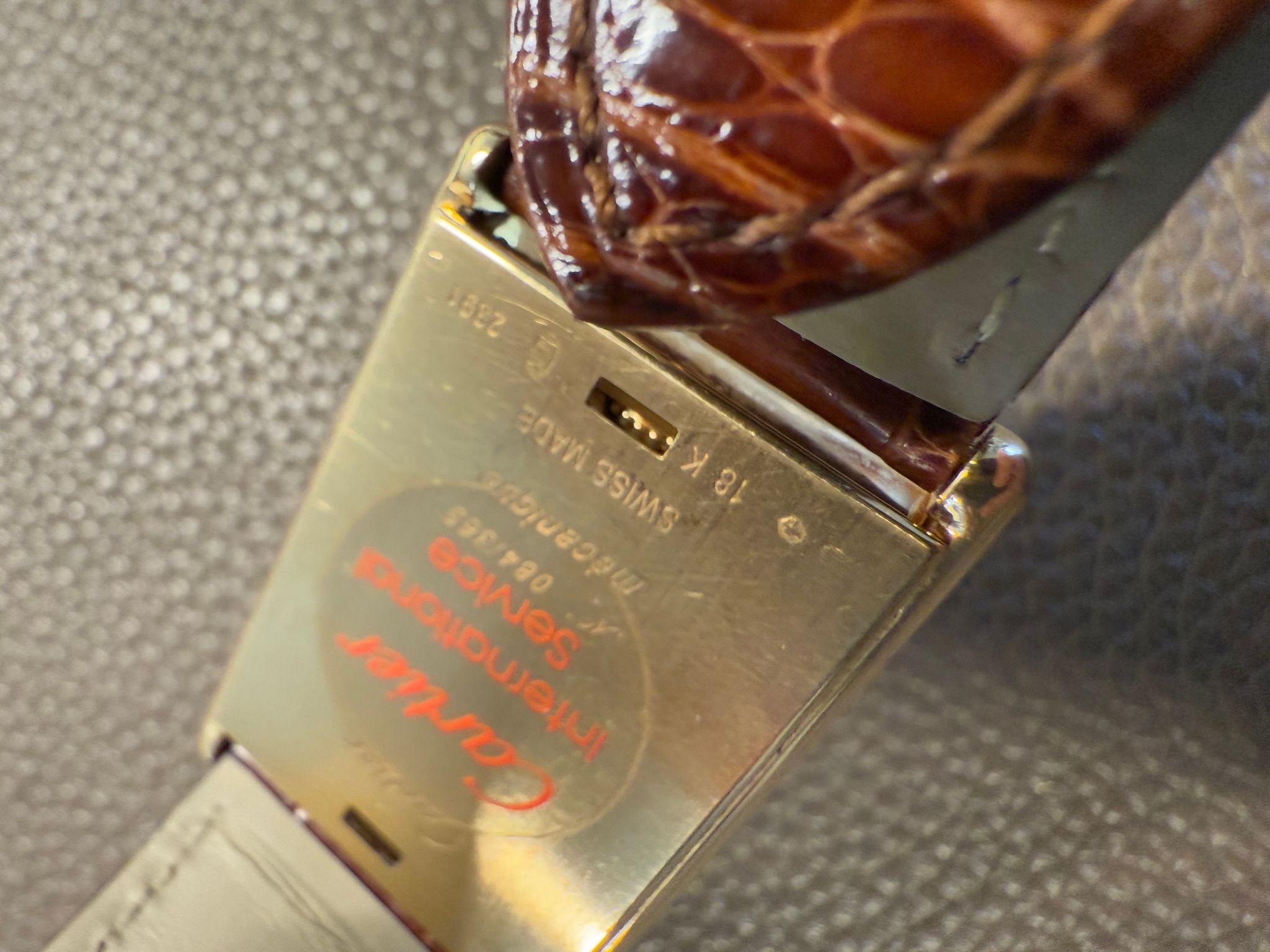 The watch is fitted on a Cartier leather strap with 18k yellow gold deployant clasp. The strap is not fixed and is adjustable.