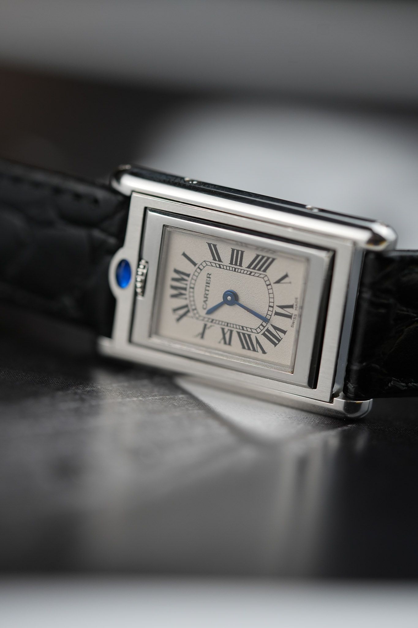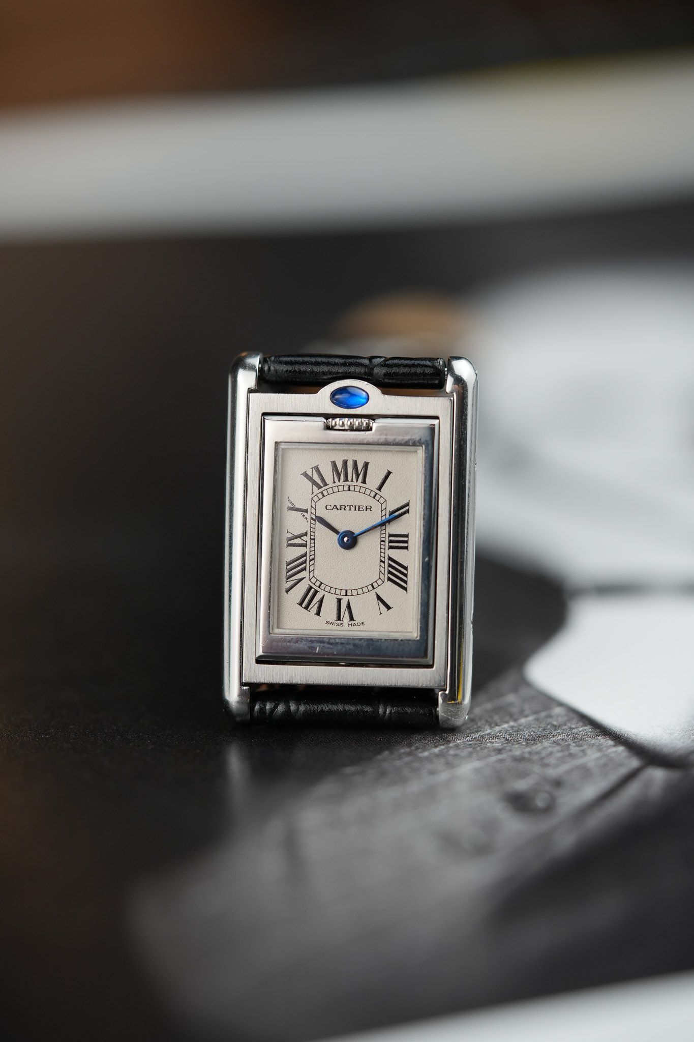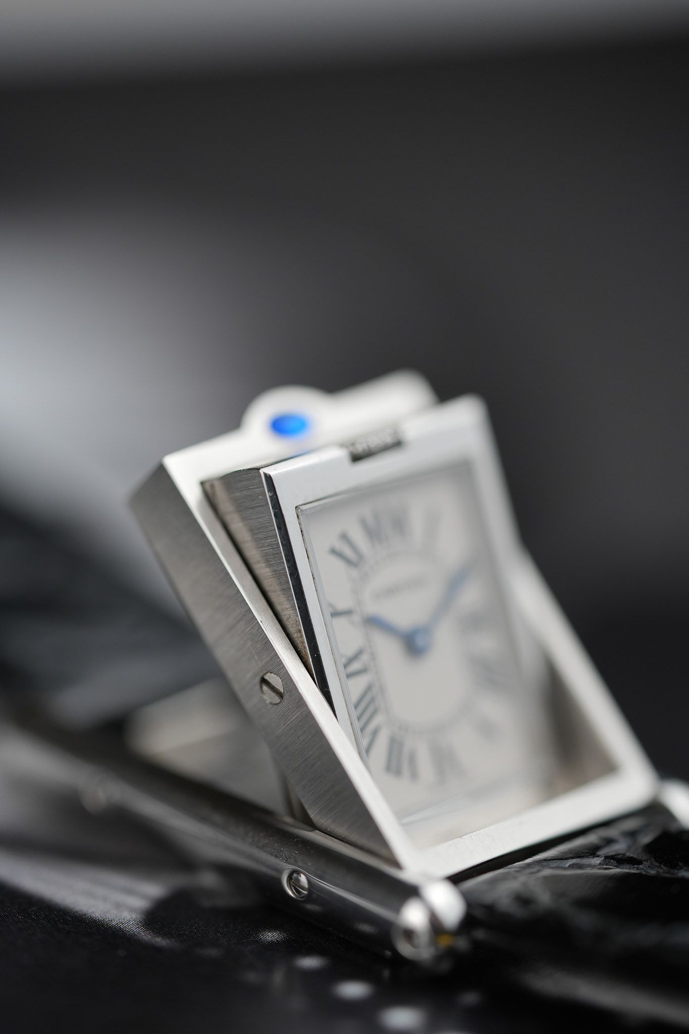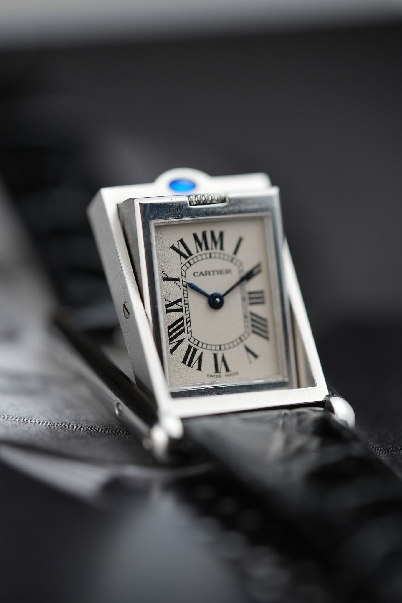 One of the most intriguing details is the placement of the signature blue cabochon. Instead of adorning the crown as in most Cartier models, it is positioned above the 12 o’clock marker, serving as a subtle guide to access the swivel system. On the inner case back, Cartier aficionados will appreciate the beautifully engraved Cartier C motif, a hidden touch for discerning collectors.