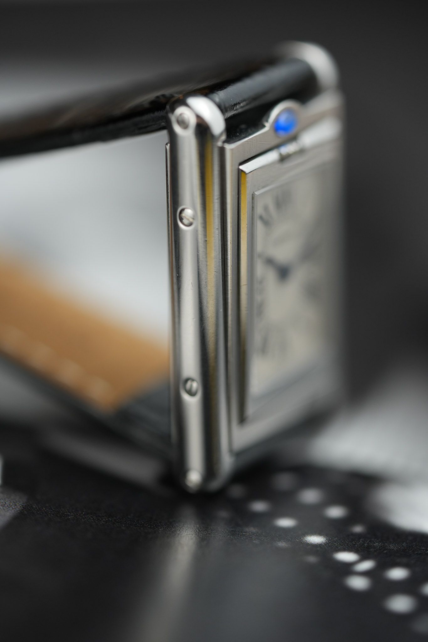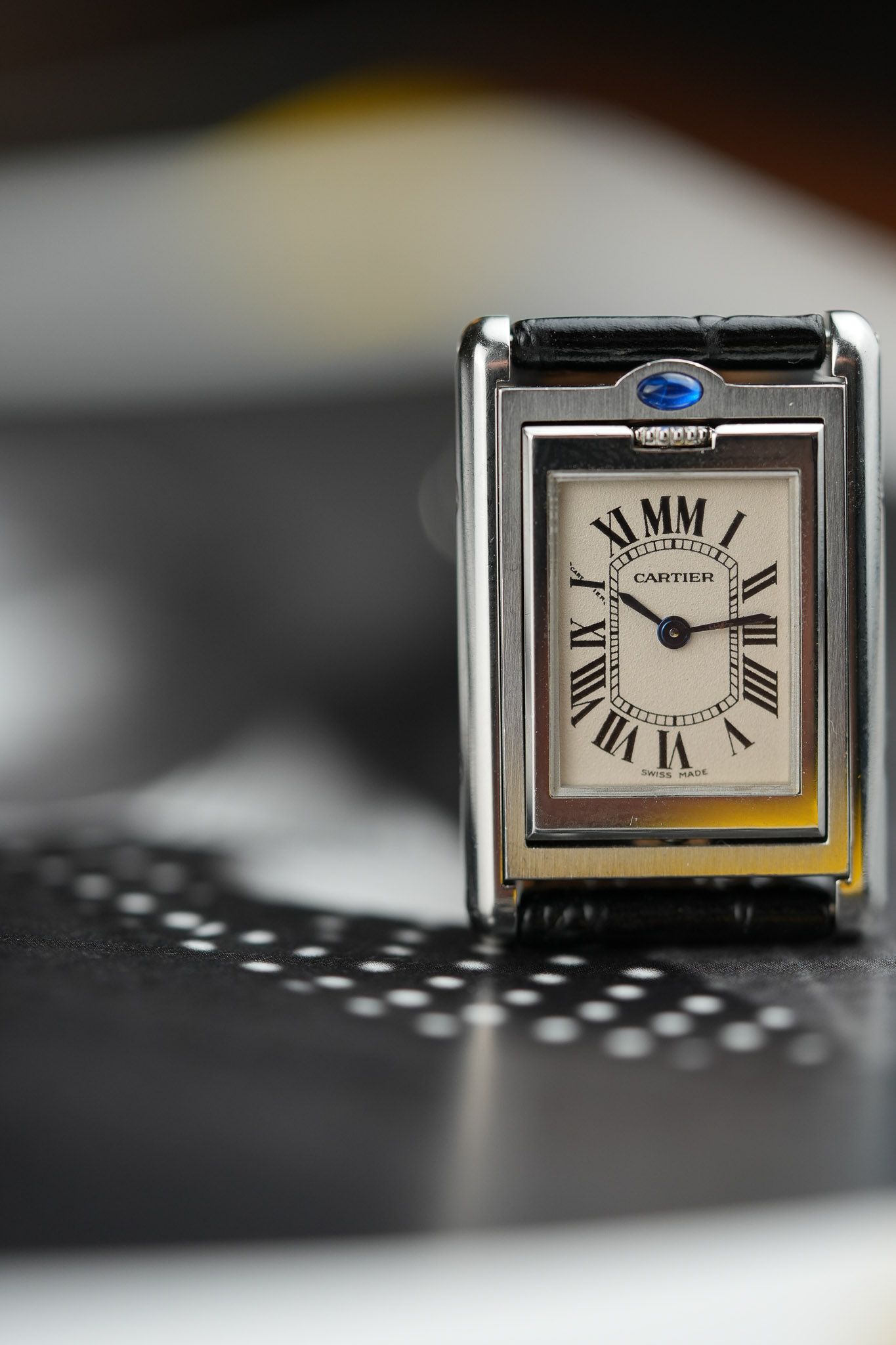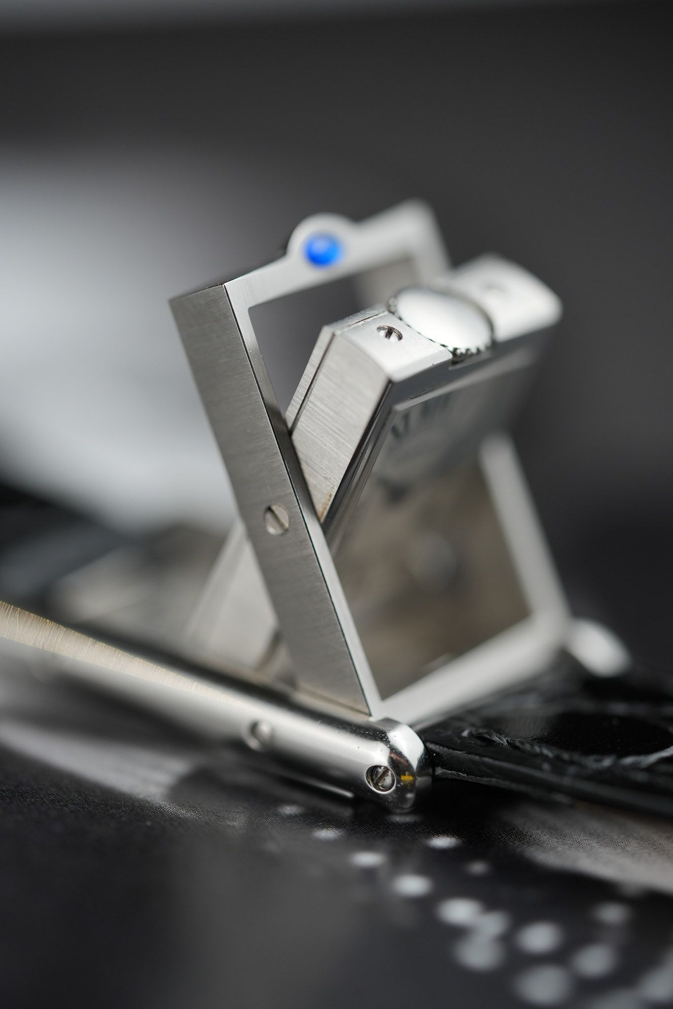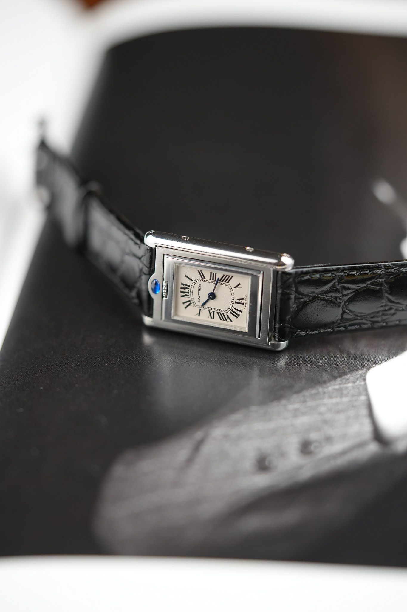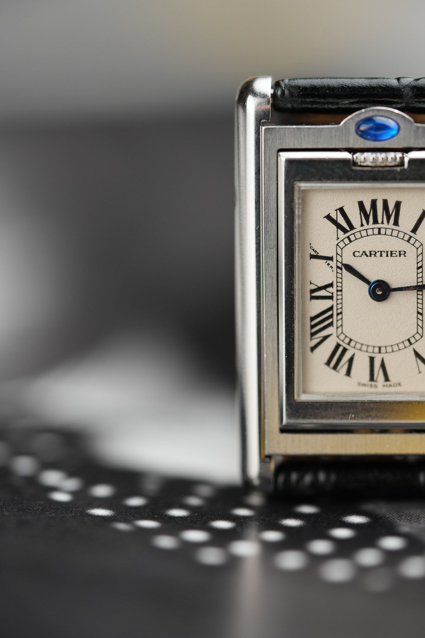 One of the most intriguing details is the placement of the signature blue cabochon. Instead of adorning the crown as in most Cartier models, it is positioned above the 12 o’clock marker, serving as a subtle guide to access the swivel system. On the inner case back, Cartier aficionados will appreciate the beautifully engraved Cartier C motif, a hidden touch for discerning collectors.