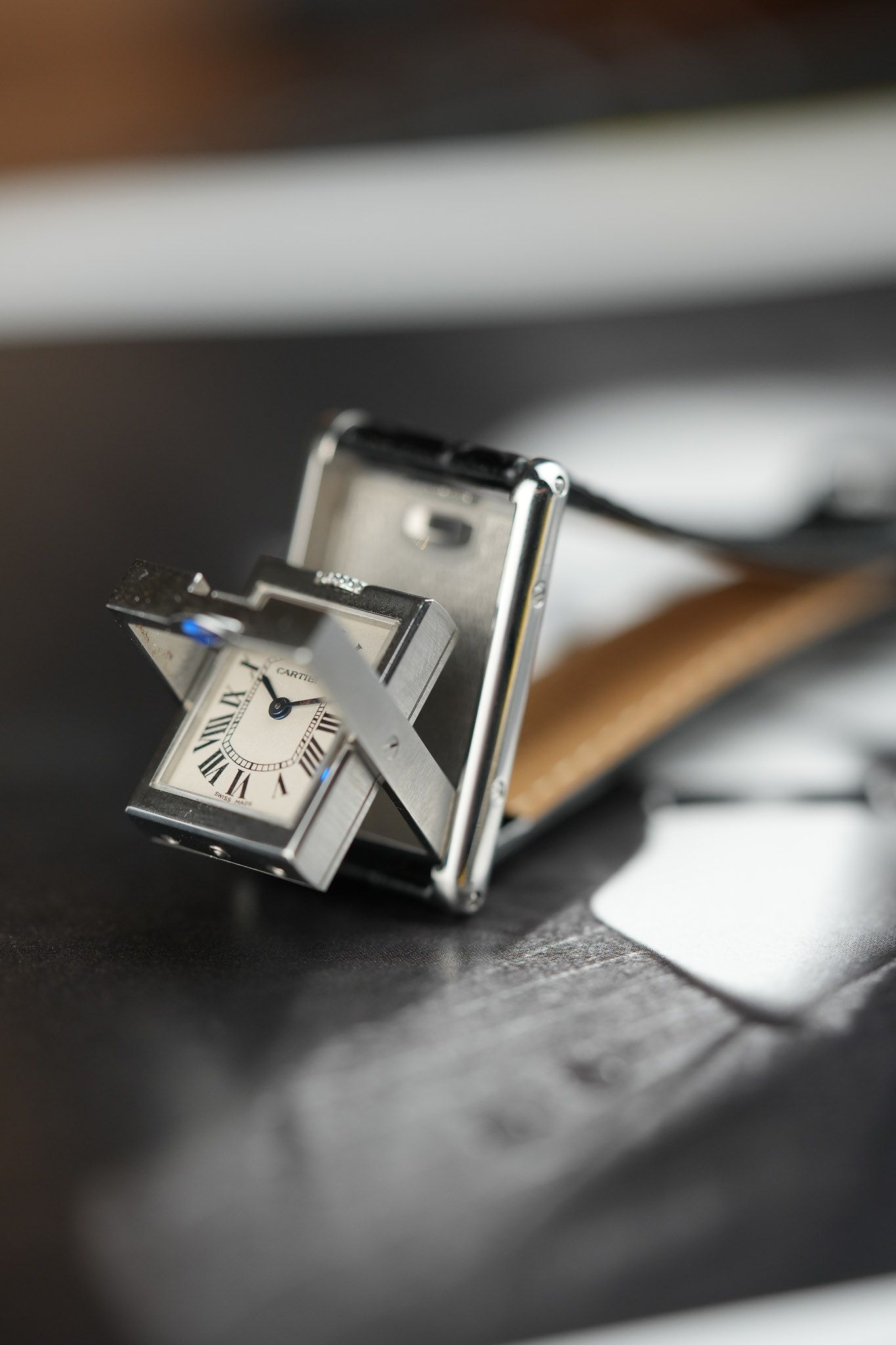 The Basculante is no ordinary Cartier. Born in 1932, it was Cartier’s answer to the innovative Jaeger-LeCoultre Reverso, which had debuted just a year earlier. Like the Reverso, the Basculante features a unique reversing mechanism designed to protect the watch face during active pursuits. But where the Reverso employs a sliding track, the Basculante uses a clever swinging inner frame—a design inspired by its namesake, the French word bascule, meaning ""seesaw."" This ingenious feature not only shields the sapphire crystal but also allows the watch to double as a miniature table clock when positioned upright.