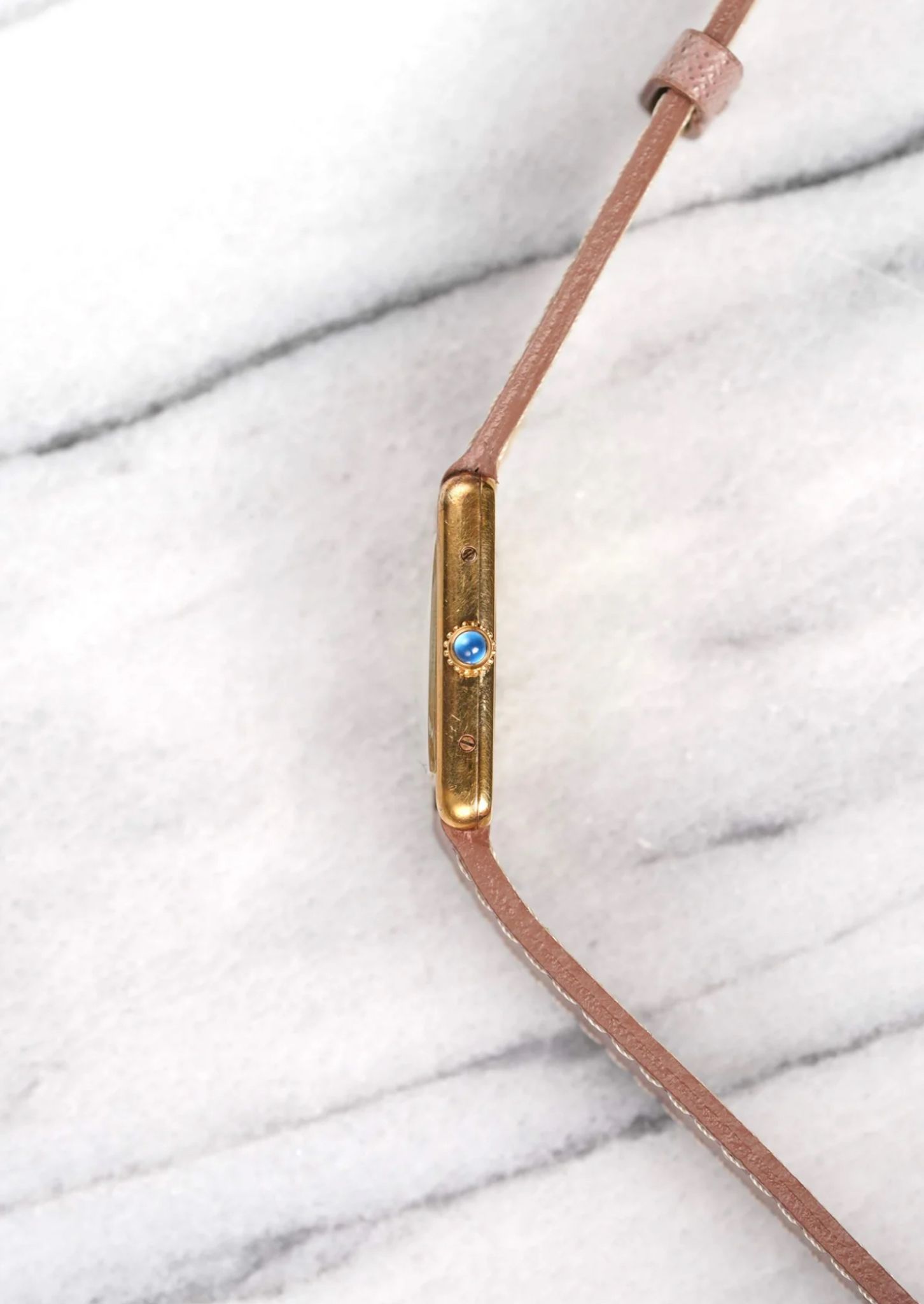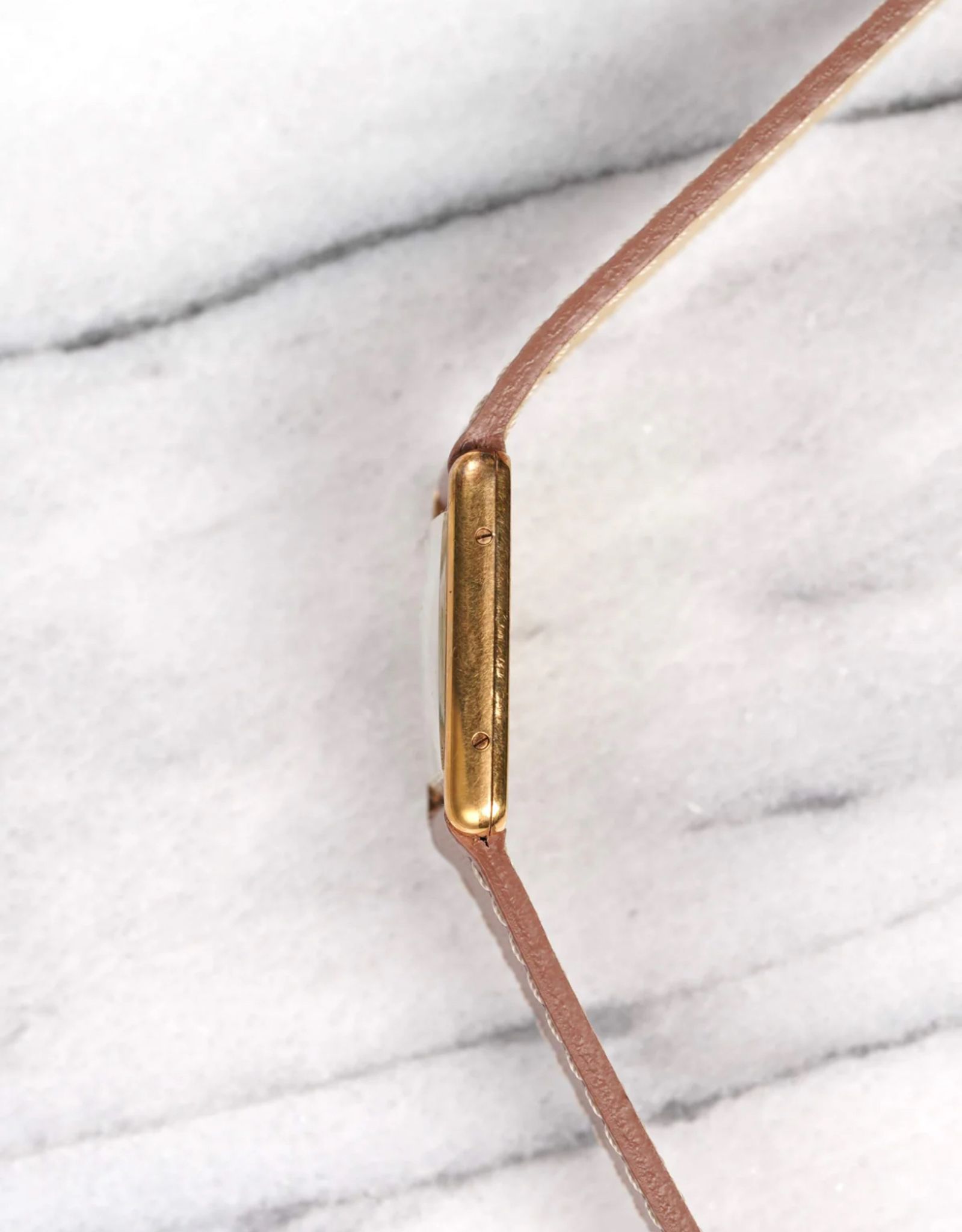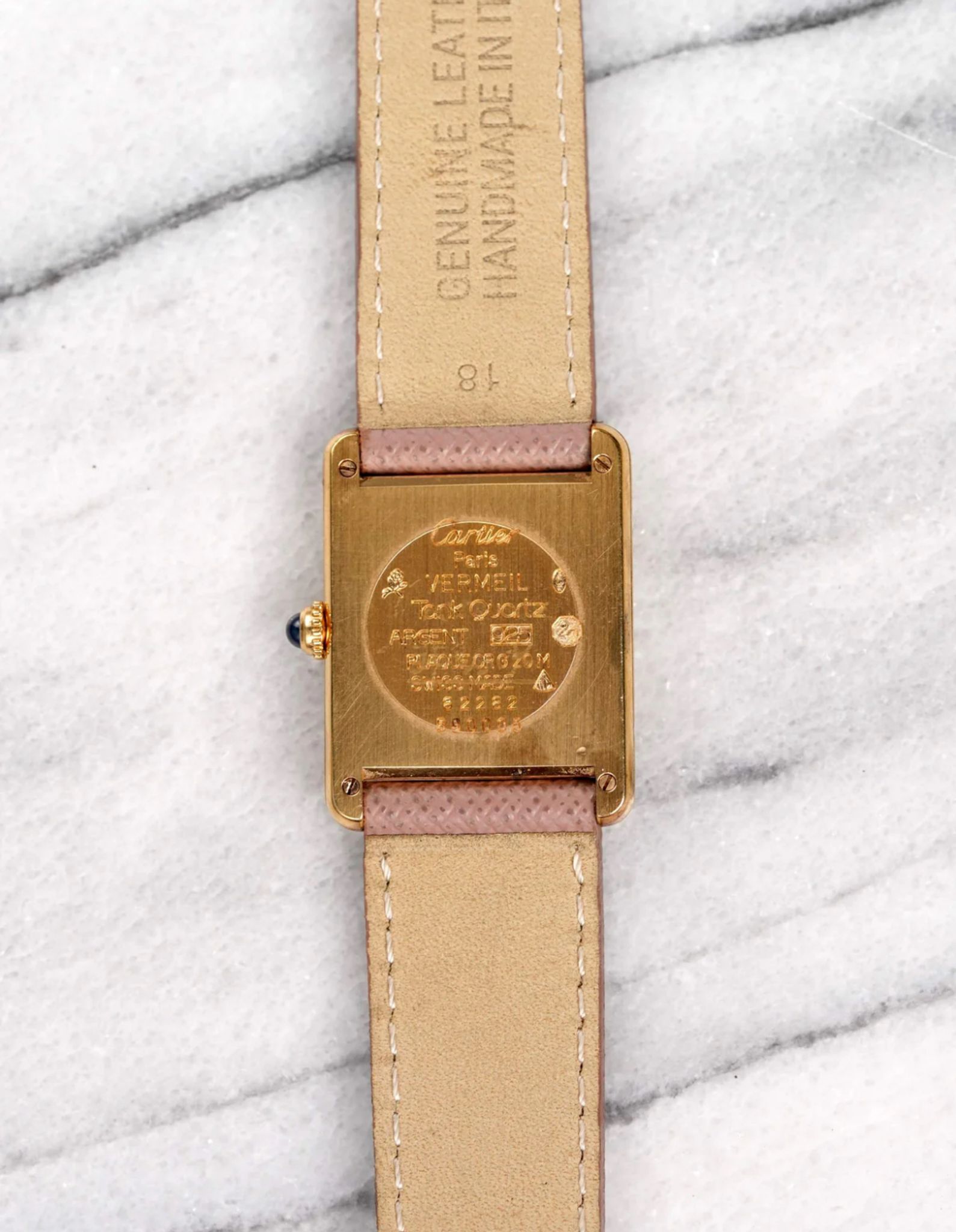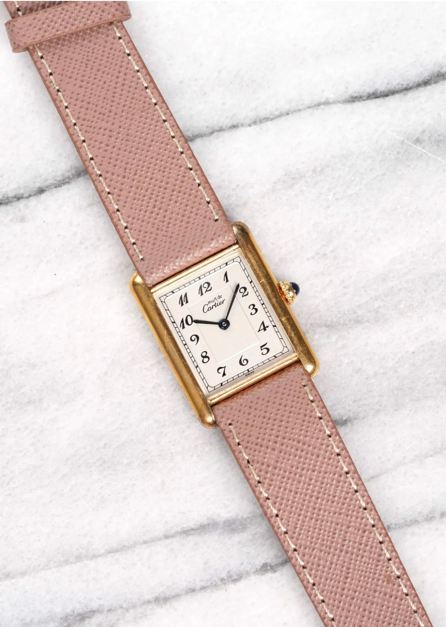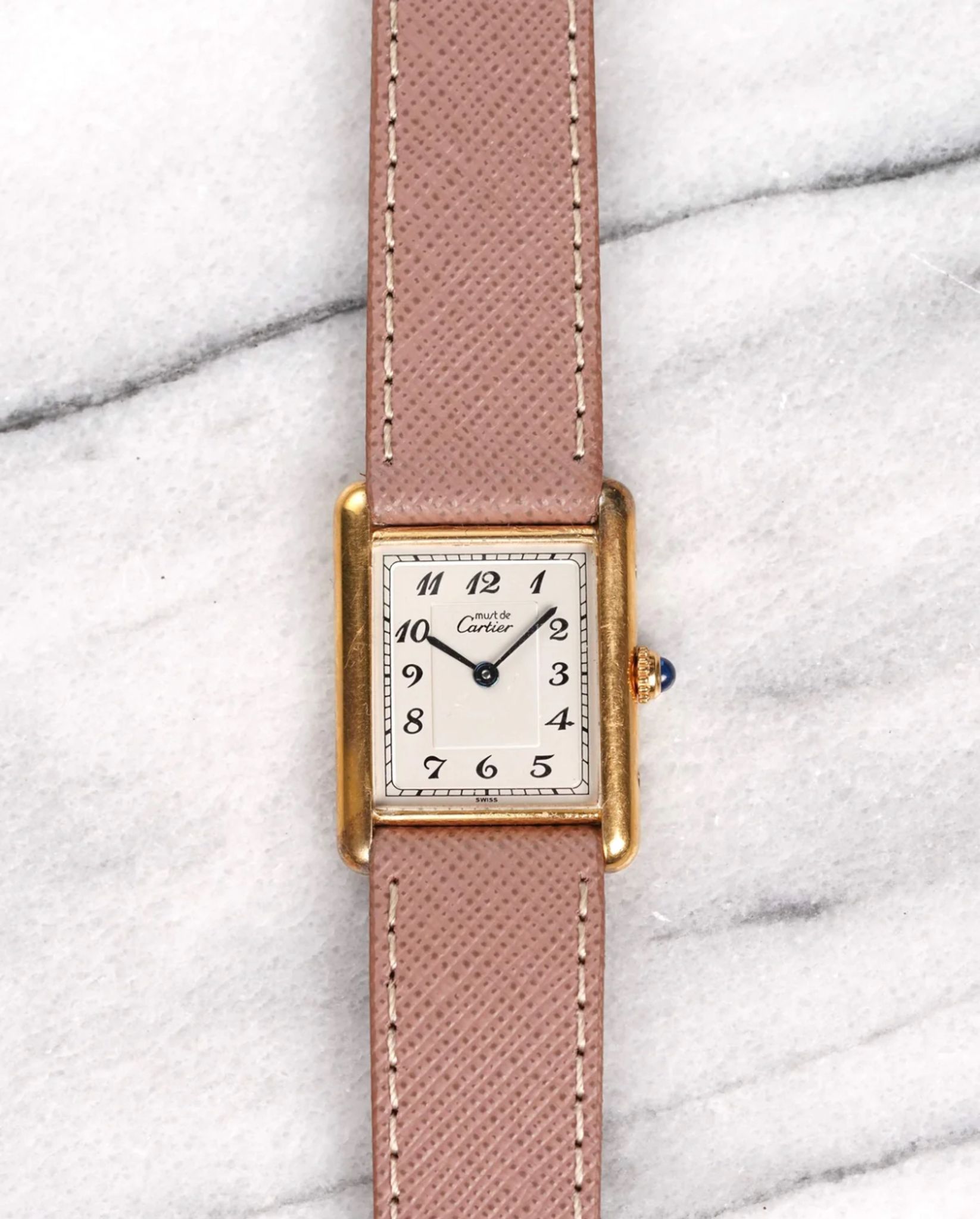 Here's a vintage Cartier tank Vermeil quartz with a beautiful white Arabic numeral dial from the late 70s, early 80s. Keeps great time and is fully functional. Measurements include a 23x30mm case size and 18mm lug width. It's on an aftermarket grey saffiano leather strap (made in Italy)with a signed Cartier buckle. Time only. 18K gold electroplated case. Matching black numbers and minute track. Blued hands. Both the dial and case are clean from any scratches or marks. The gold color on the case is still in tact. Rare to find this dial in these dials. All parts are original including the cabochon crown, dial, movement, and caseback. Both the dial and case are in great cosmetic, untouched condition.