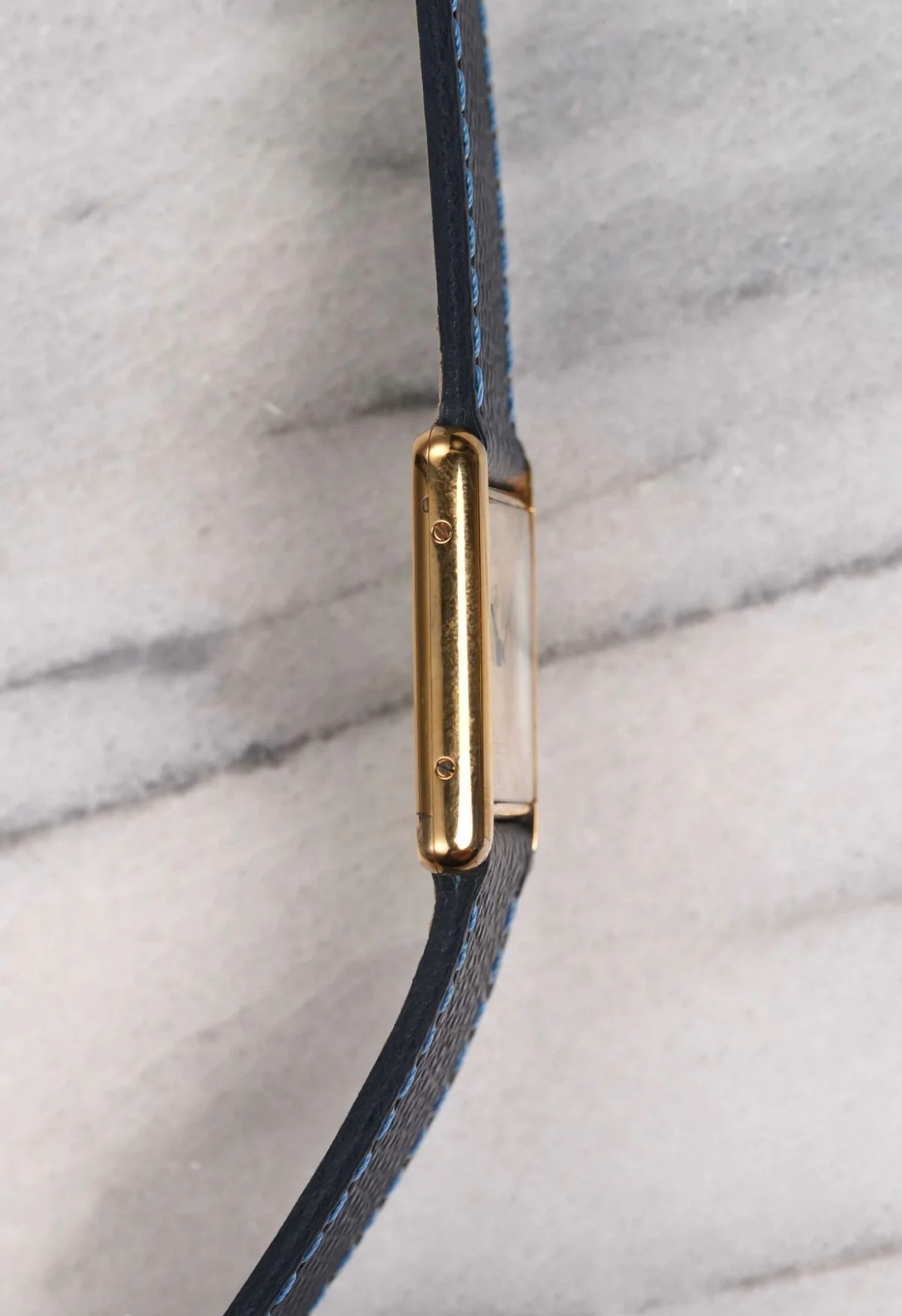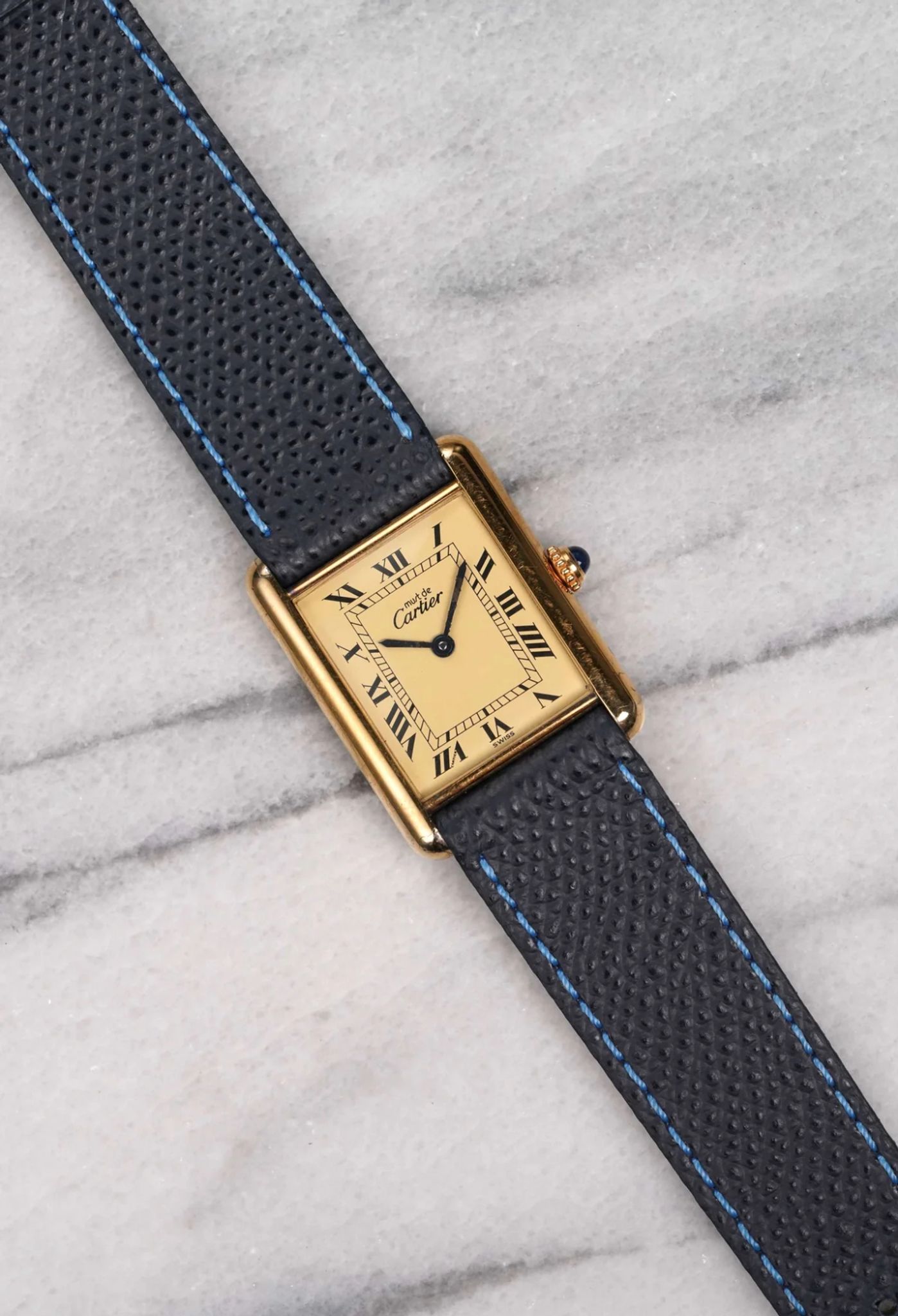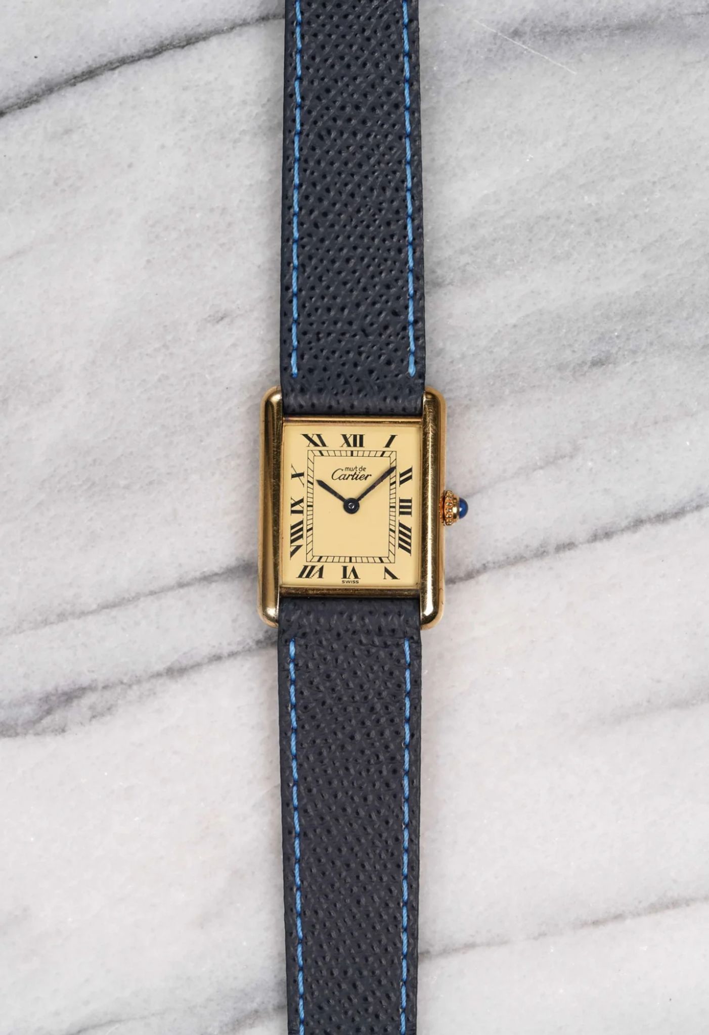 Here's a vintage must de Cartier tank manual wind with a lemon roman numeral dial from the late 70s, early 80s. Keeps great time and is fully functional. Measurements include a 23x30mm tank case size and 18mm lug width. It's on a blue pebble textured strap (Made in Italy) 18K yellow gold electroplated case. The case and caseback are in great condition. Matching black roman numerals and minute track. Blued hands. Original blue cabochon crown. The dial and crystal are free from any scratches or marks. Has an aftermarket crown (doesn’t have its sapphire cabochon crown) Both the dial and case are in great cosmetic, untouched condition.