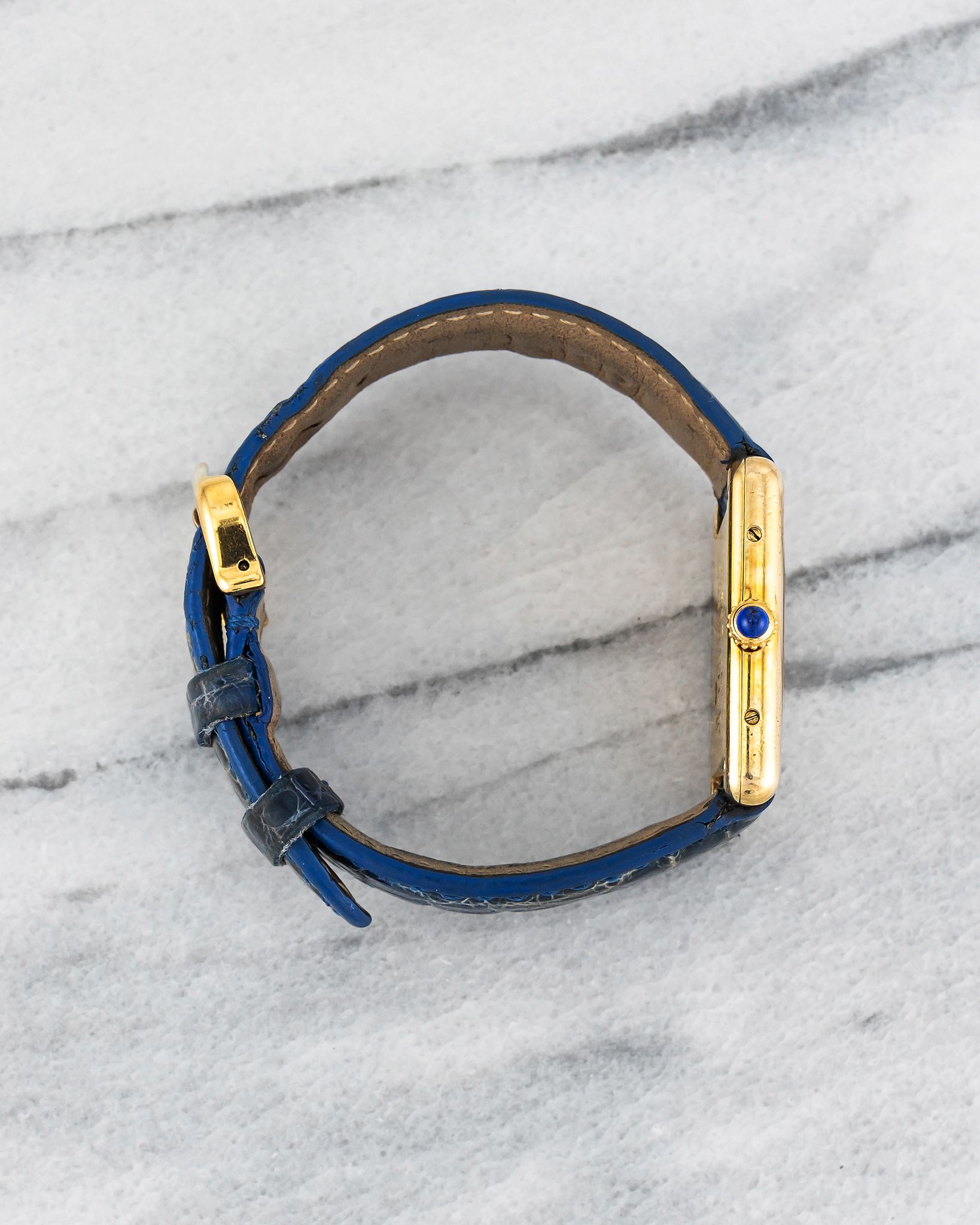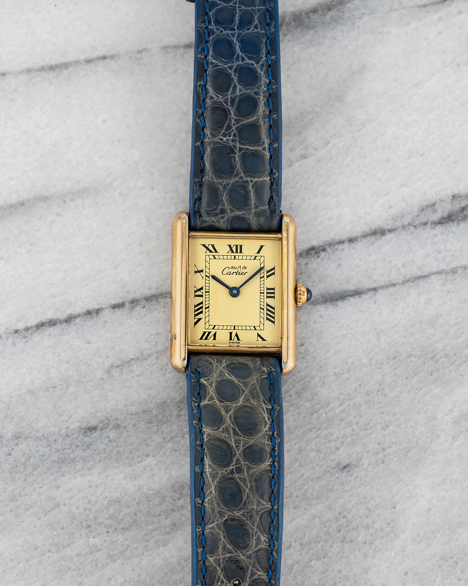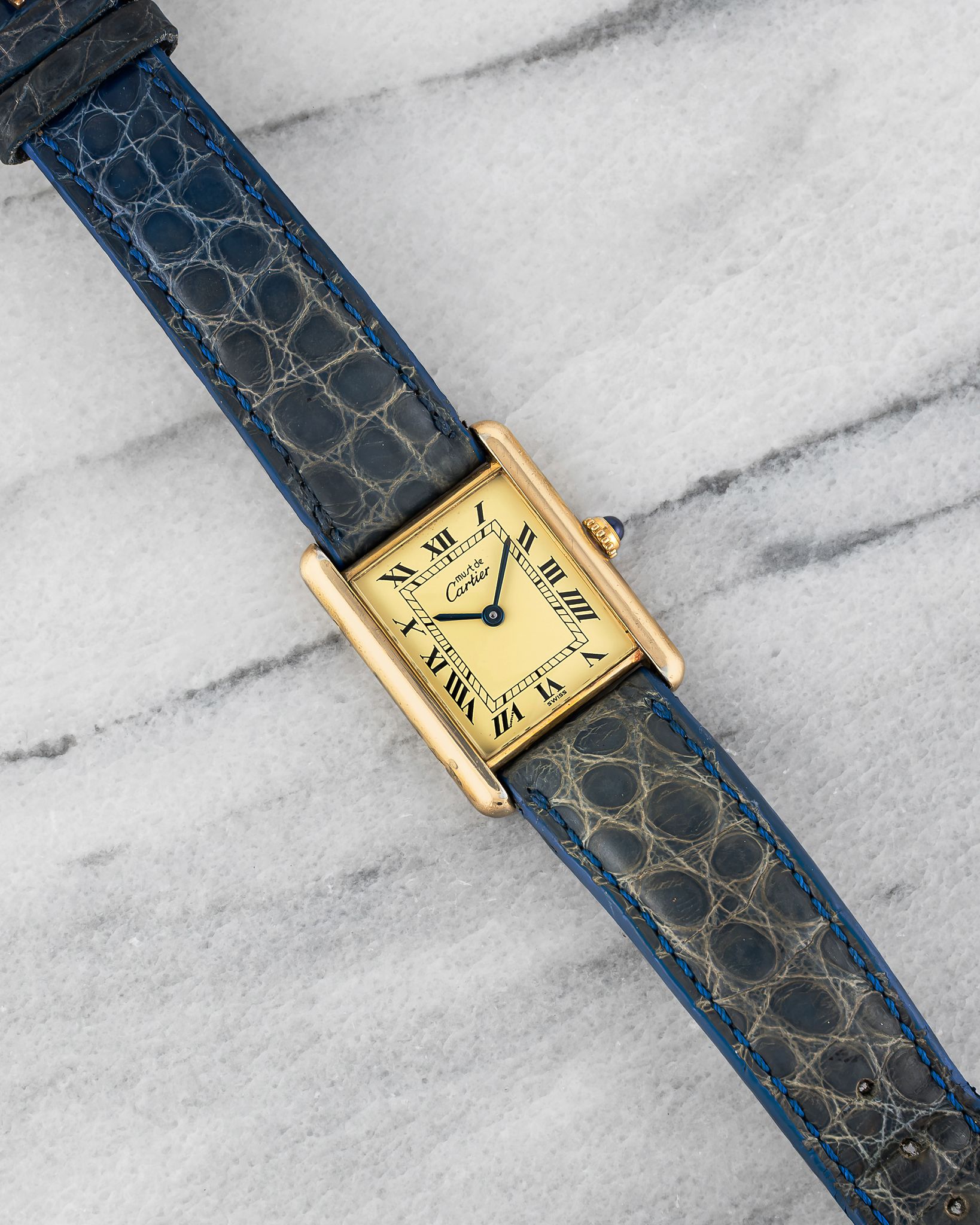 Here's a vintage must de Cartier tank manual wind with a lemon roman numeral dial from the late 70s, early 80s. Keeps great time and is fully functional. Measurements include a 23x30mm tank case size and 18mm lug width. It's on a blue leather strap with a matching Cartier buckle. 18K yellow gold electroplated case. The case and caseback are in great condition. Matching black roman numerals, and minute track. Blued hands. Original blue cabochon crown. The top and bottom of the case developed a little bit of tarnishing, due to age as seen in the photos. The dial and crystal are free from any scratches or marks. All parts are original including the dial, crown, movement, and caseback. Both the dial and case are in great cosmetic, untouched condition.