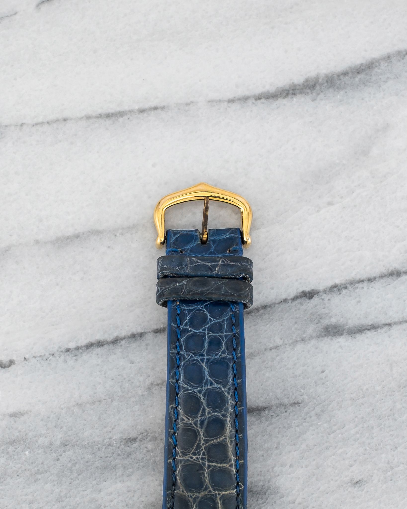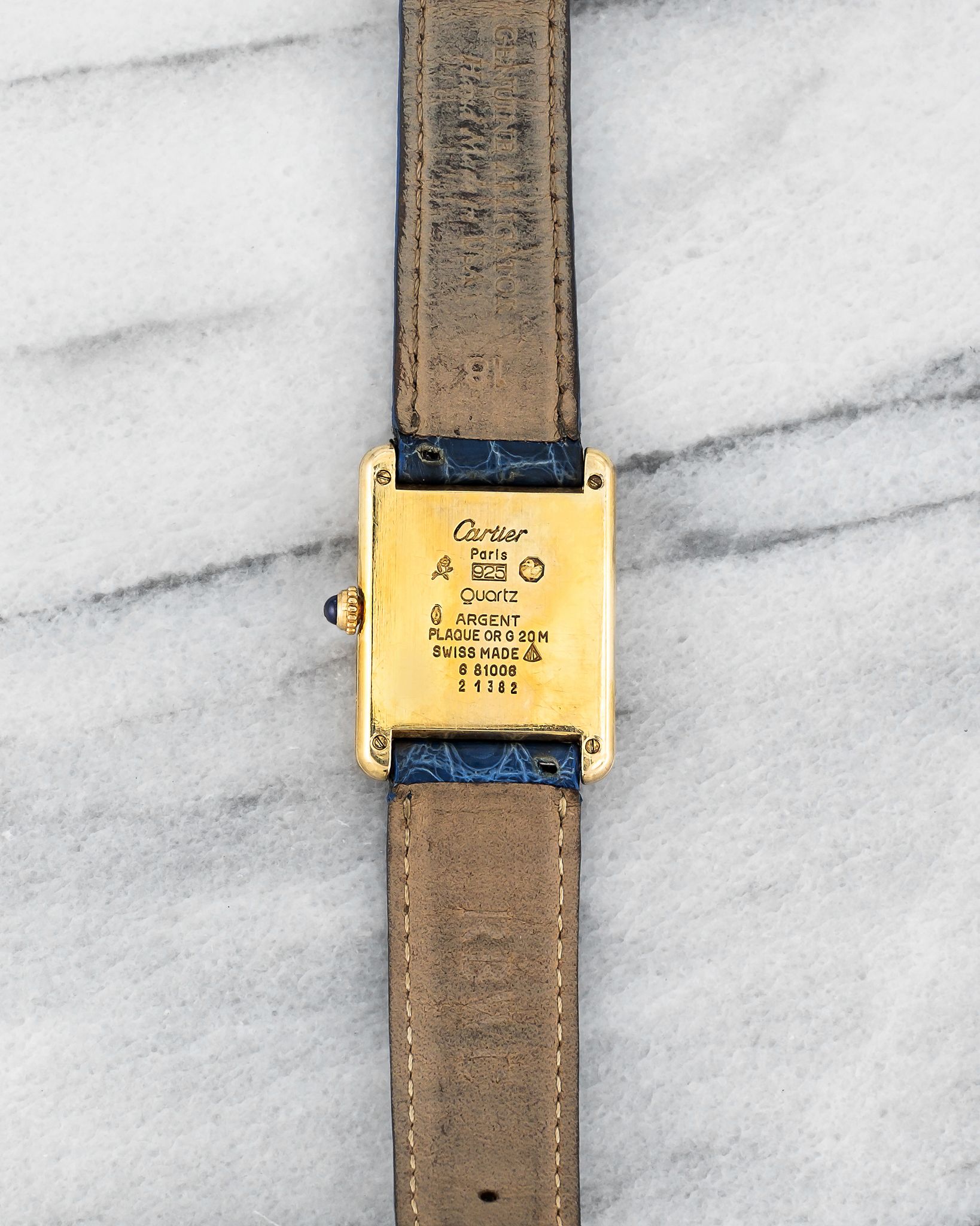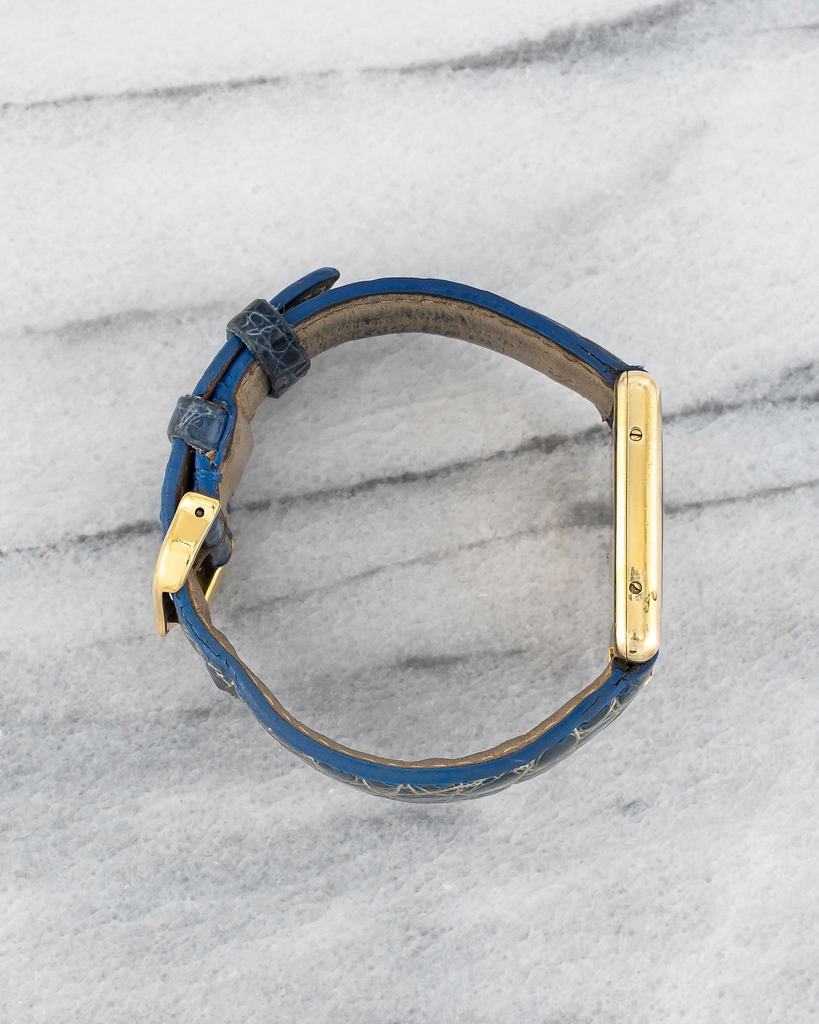Here's a vintage must de Cartier tank manual wind with a lemon roman numeral dial from the late 70s, early 80s. Keeps great time and is fully functional. Measurements include a 23x30mm tank case size and 18mm lug width. It's on a blue leather strap with a matching Cartier buckle. 18K yellow gold electroplated case. The case and caseback are in great condition. Matching black roman numerals, and minute track. Blued hands. Original blue cabochon crown. The top and bottom of the case developed a little bit of tarnishing, due to age as seen in the photos. The dial and crystal are free from any scratches or marks. All parts are original including the dial, crown, movement, and caseback. Both the dial and case are in great cosmetic, untouched condition.