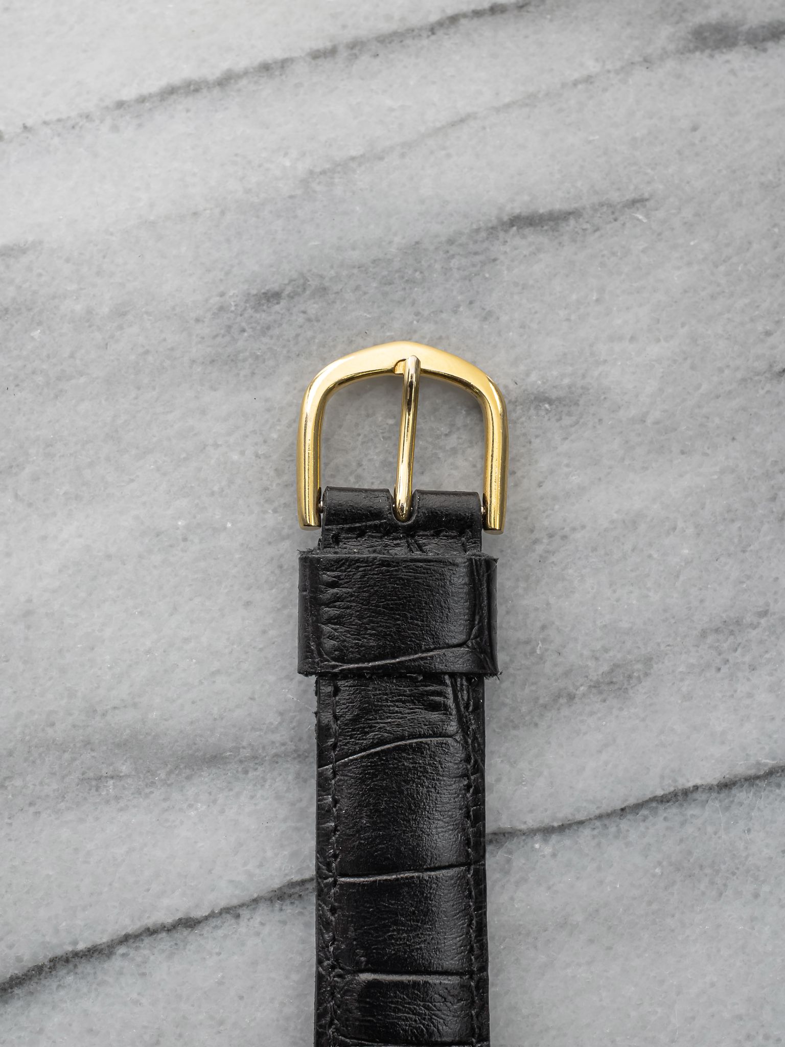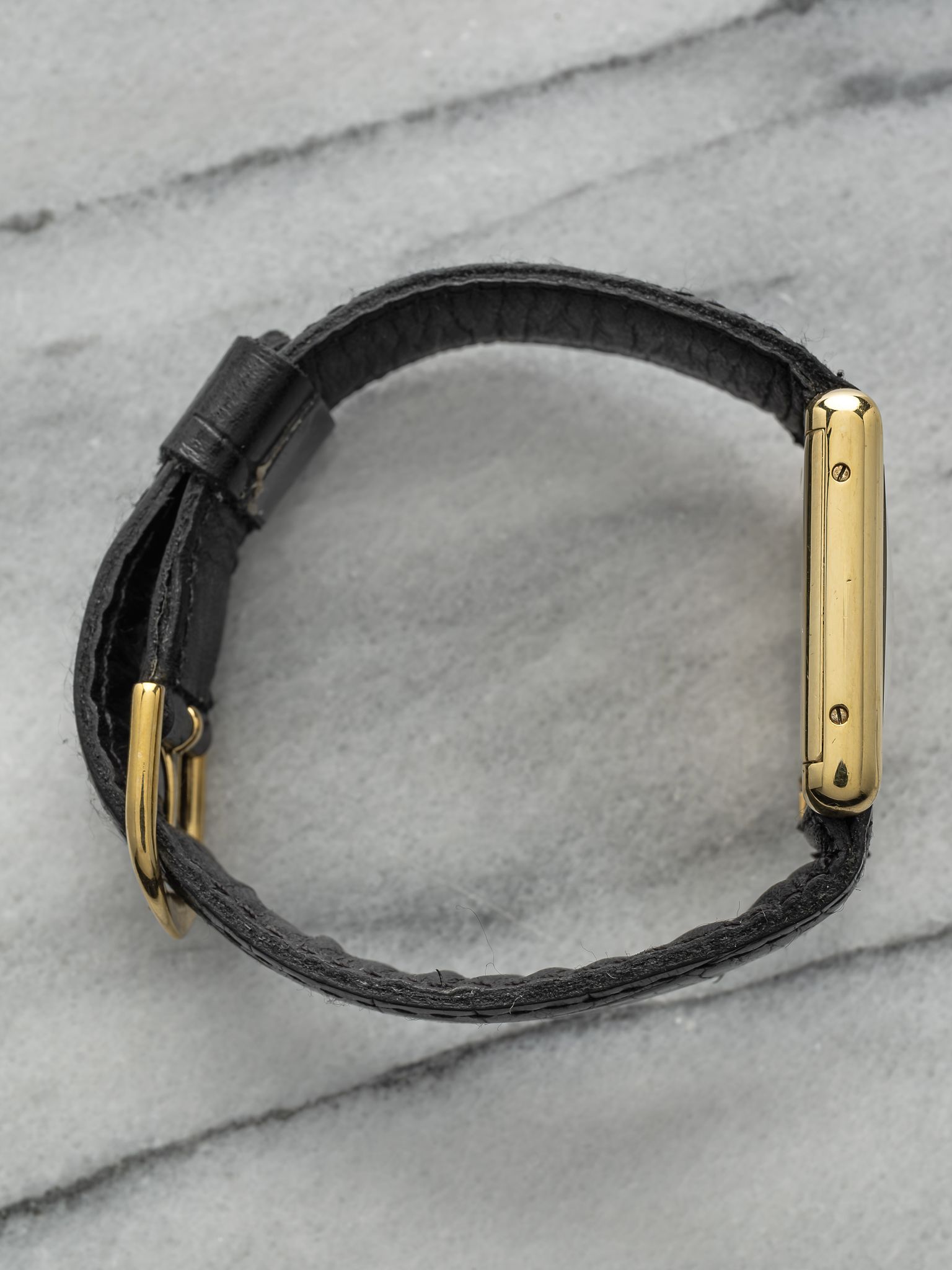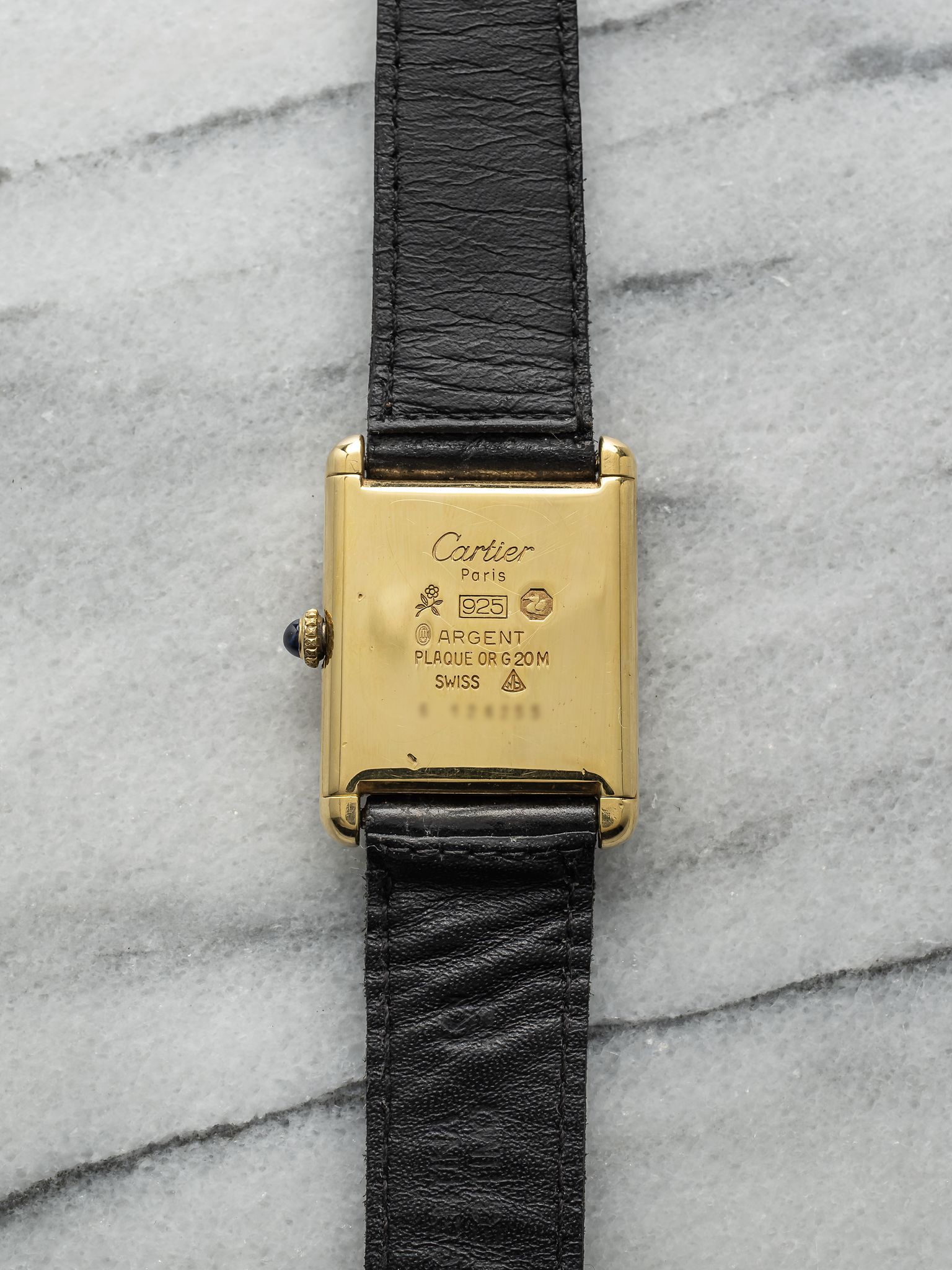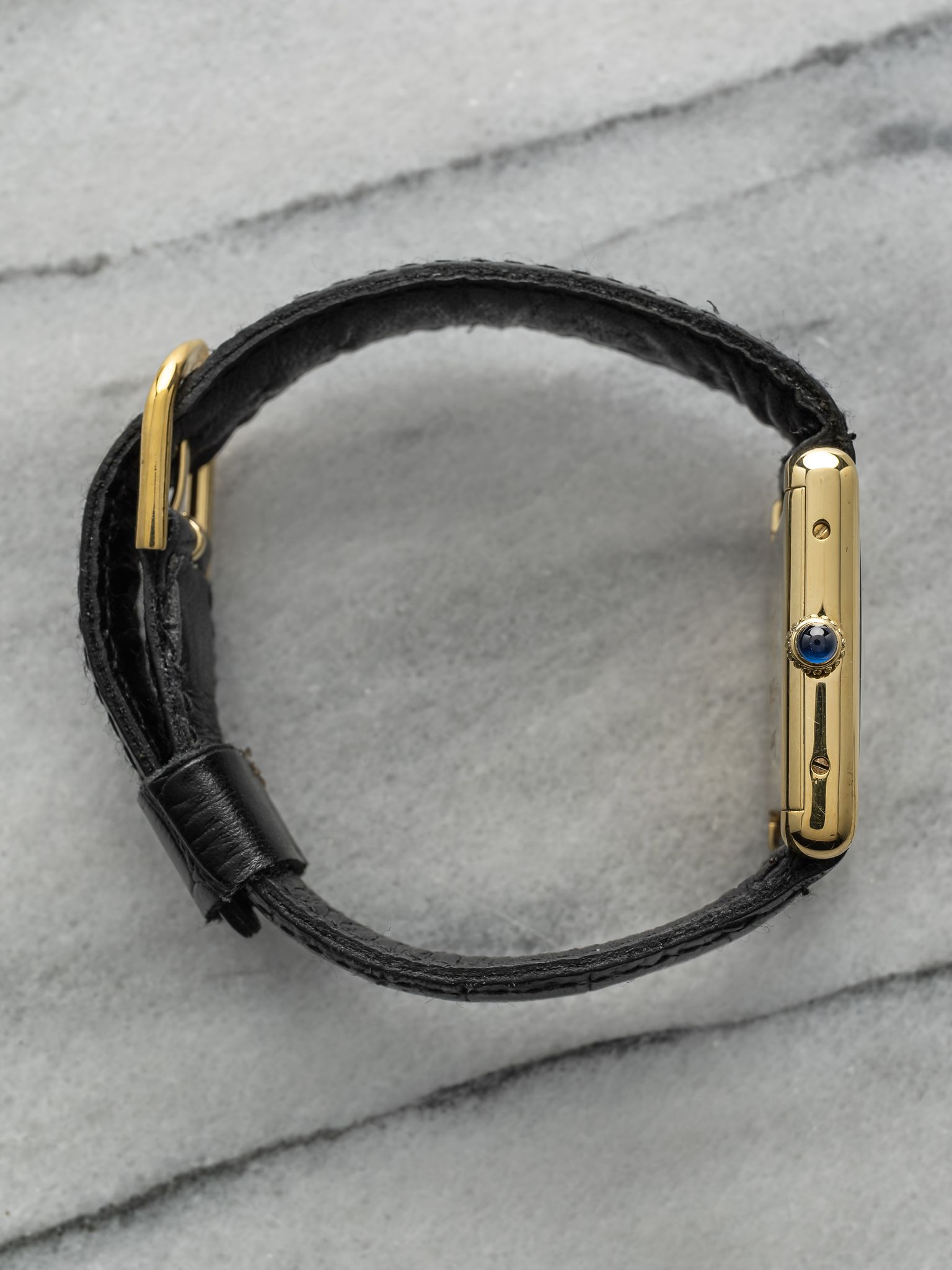 Here's a vintage Cartier Tank lemon roman numeral dial manual wind from the 1980s. Measurements include a 23x30mm electroplated case and 18mm lug width. On an aftermarket black leather strap and aftermarket buckle. Blued hands. All parts including the crown, dial, movement, and caseback are original.