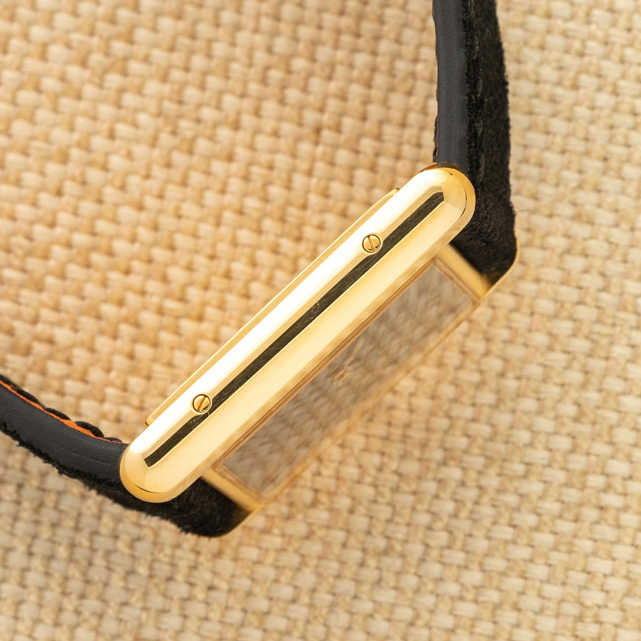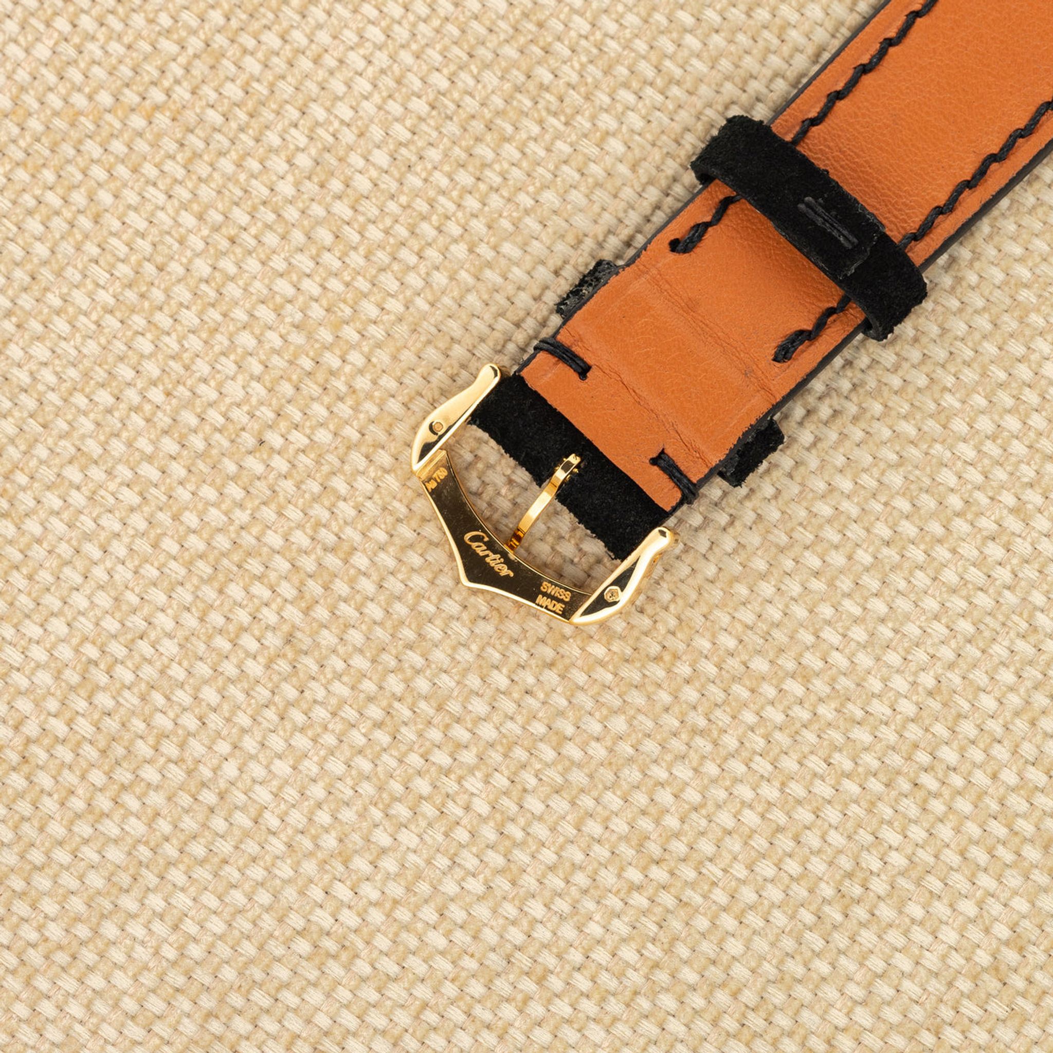 This re-adaptation of Cartier's iconic Tank Louis Cartier watch is a larger sized variant coming in at 25.5mm x 33.7mm. For some, the original Tank Louis could be viewed as potentially too small and this modern interpretation adds just the right amount of wrist presence. This particular model features a black lacquer dial with gold accents, contrasting beautifully with its solid 18k yellow case. For anyone looking for a unique and striking Cartier Tank, this minimalist black dial version is perfect for daily use. This example has remained in near mint condition and comes complete as it did from factory with the addition of a black suede strap.