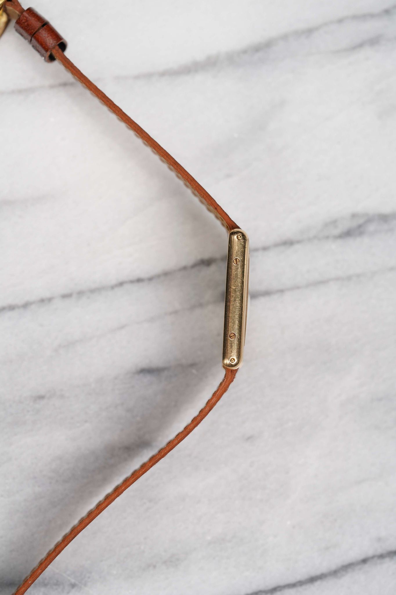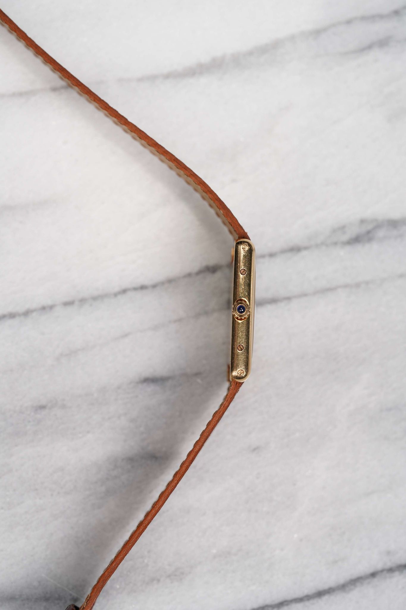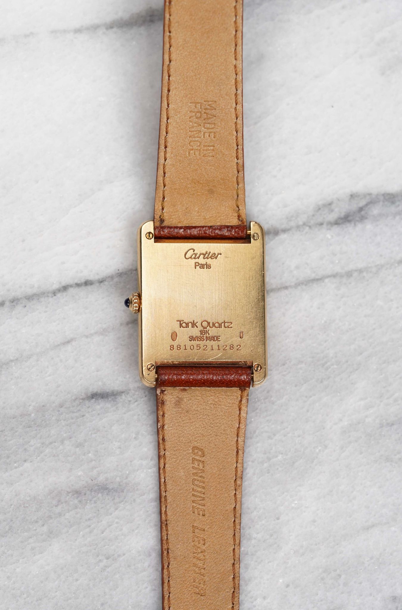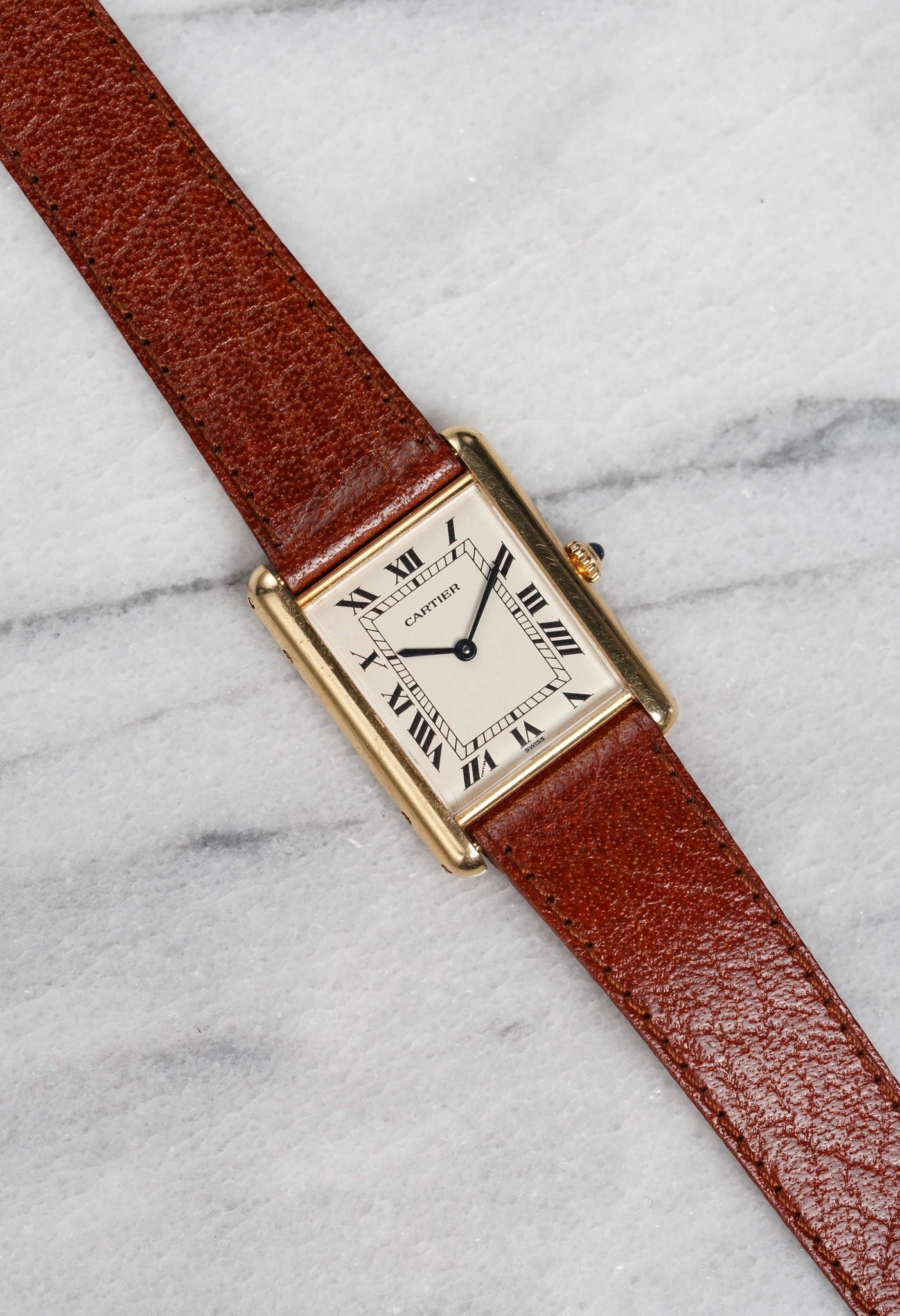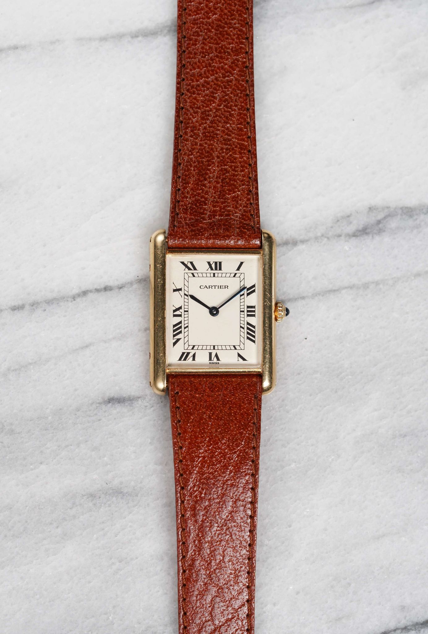 Here's a vintage Cartier Tank Louis quartz in 18K yellow gold with a white Roman numeral dial from the late 70s, early 80s. Recently serviced! Keeps great time and is fully functional. Measurements include a 23x30mm case size and 18mm lug width. It’s on an aftermarket brown leather strap and matching plated Cartier buckle. Time only. 18K yellow gold case and caseback. Matching black Roman numerals and minute track. Blued hands. Blue cabochon crown. Both the dial and case are clean from any scratches or marks. Swiss made dial. Swiss Made Dial. All parts are original including the cabochon crown, dial, movement, and caseback. Both the dial and case are in great cosmetic, untouched condition.