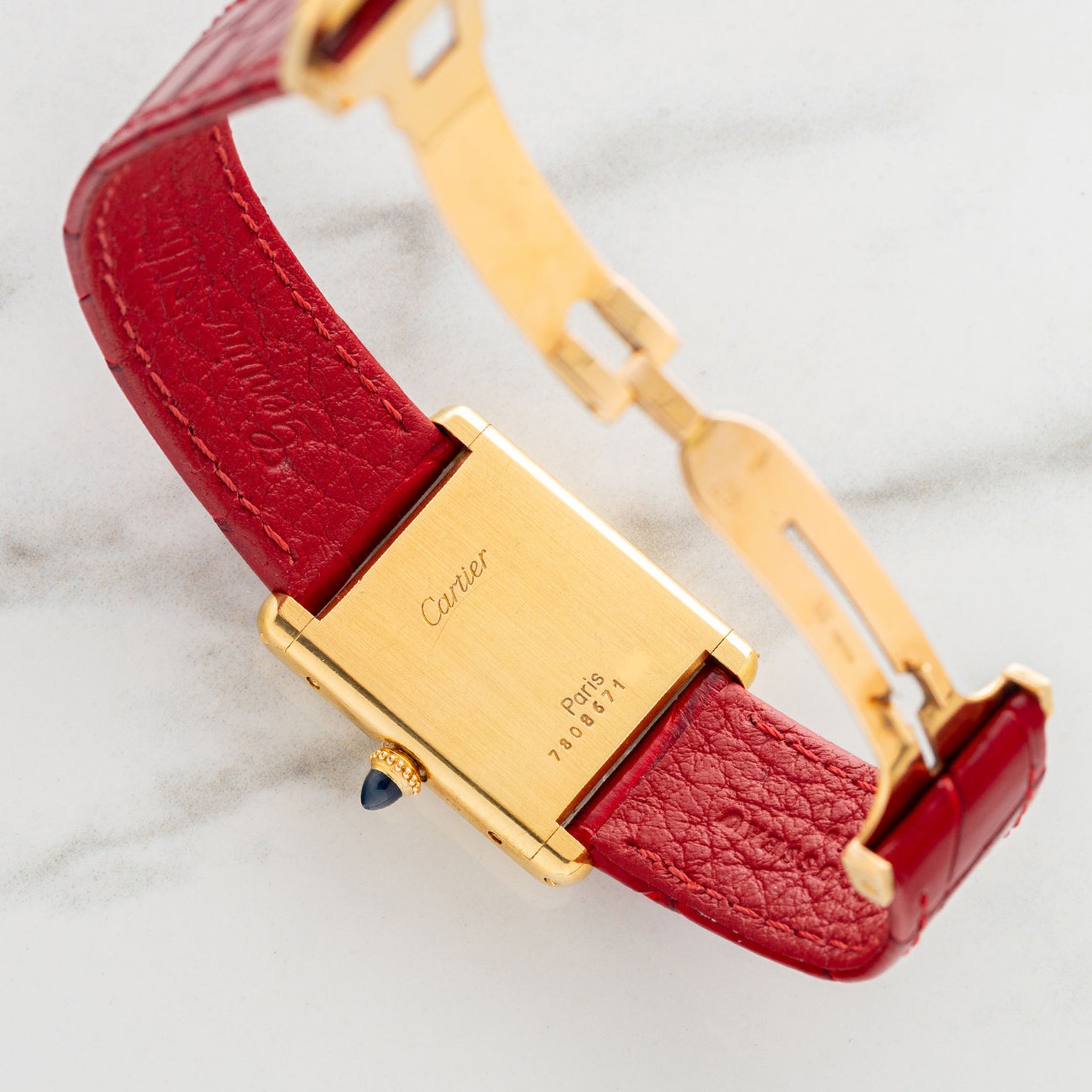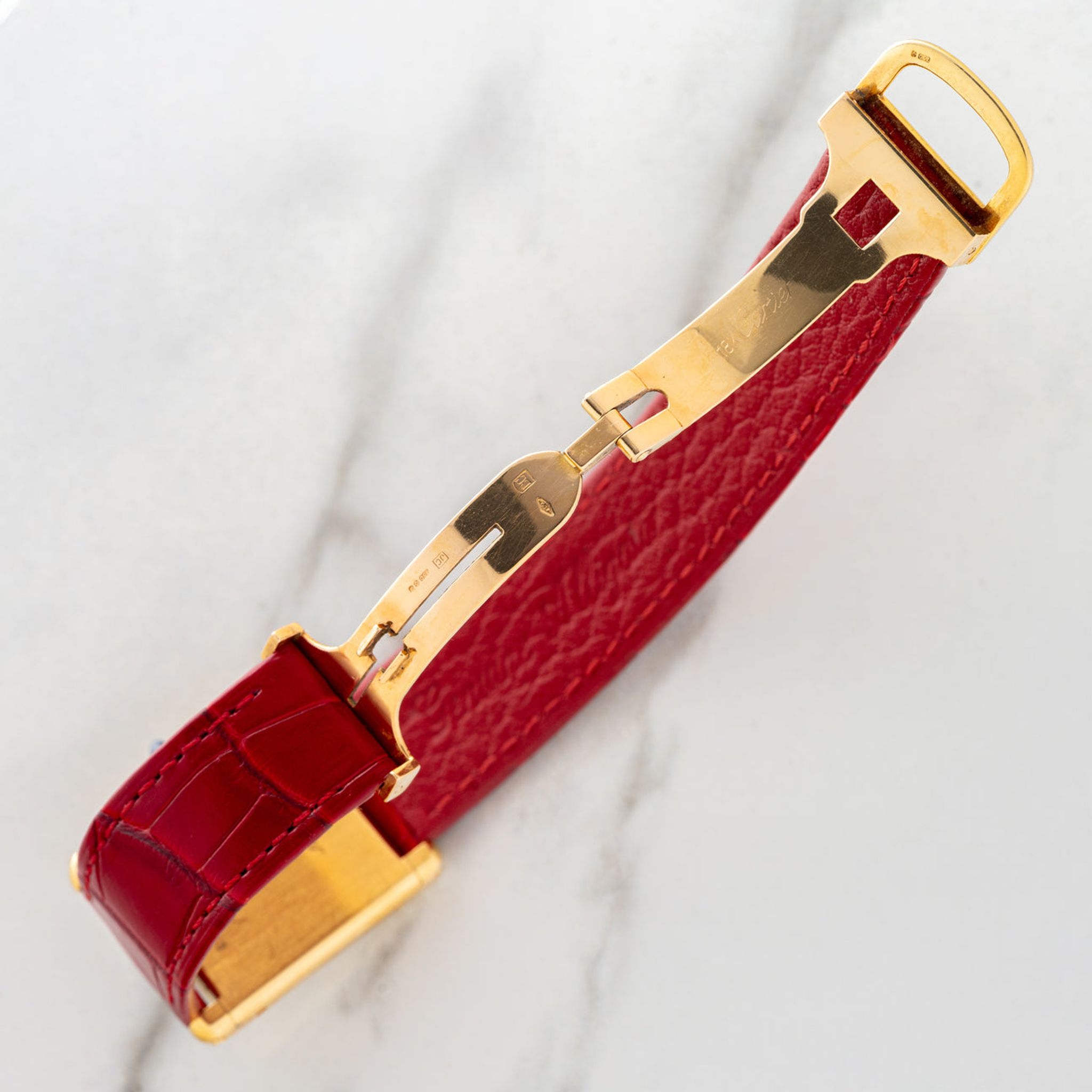 Bracelet: 18k Cartier deployant buckle. Two piece gator strap in red from Jean Rousseau. Will fit an approximate 6.75 inch wrist.