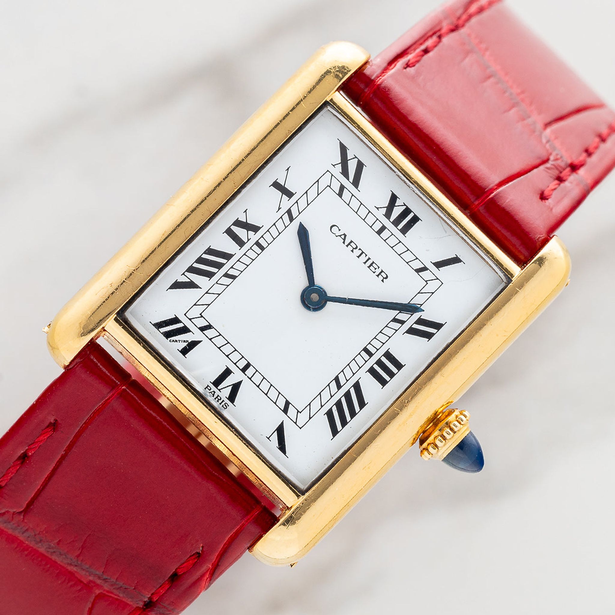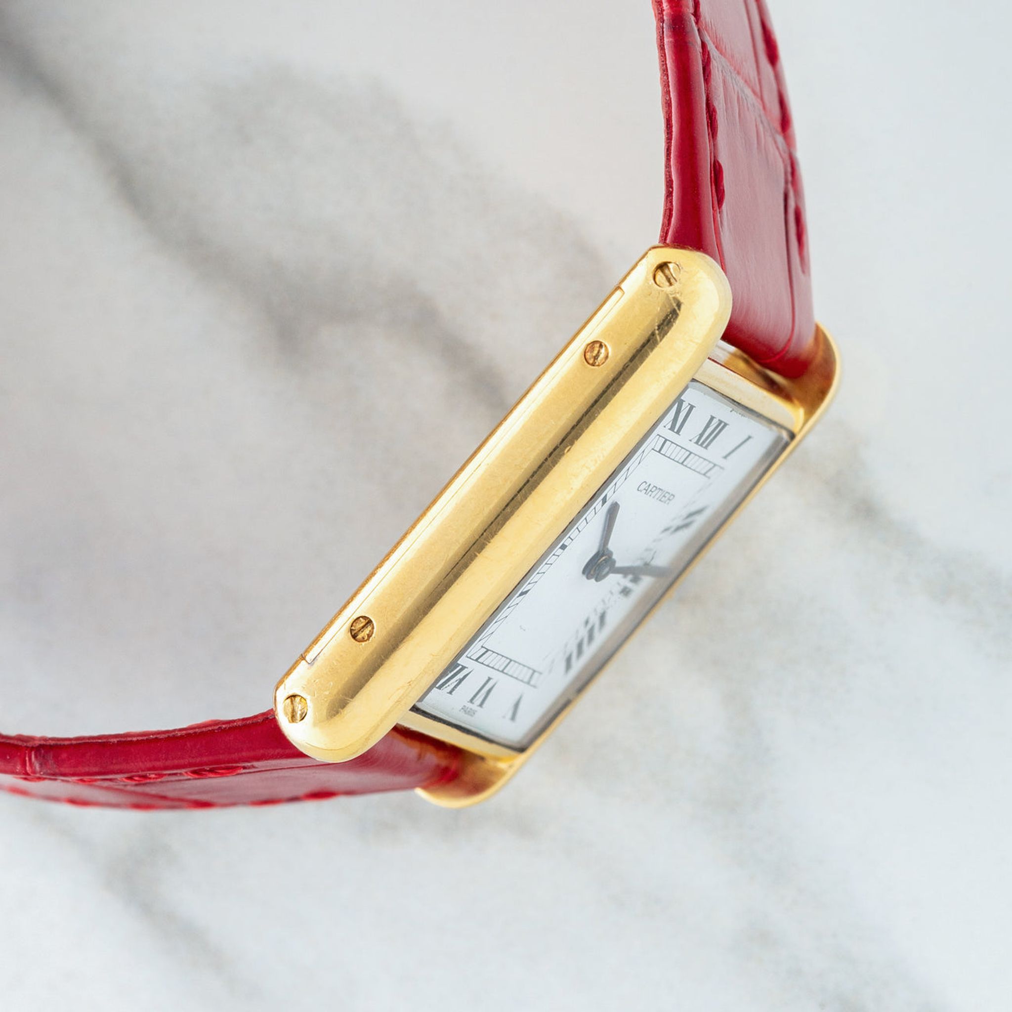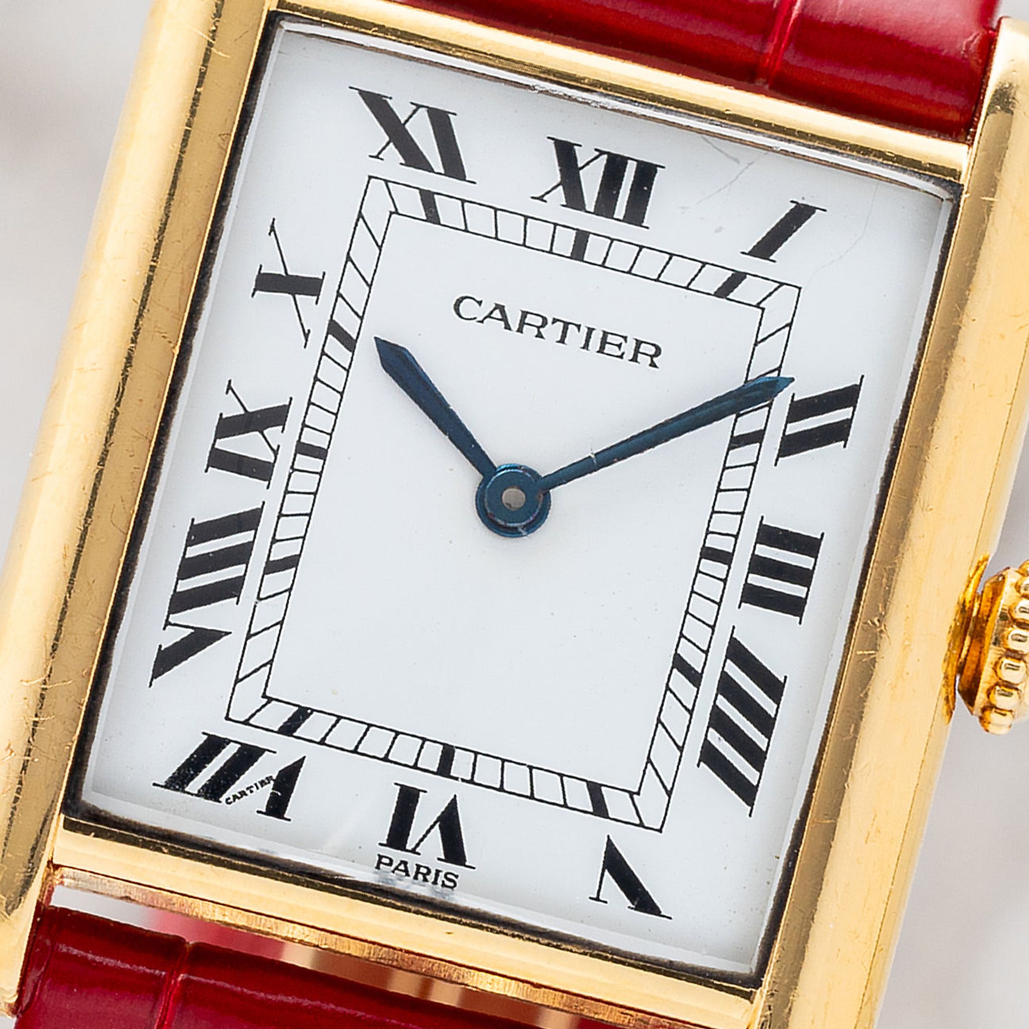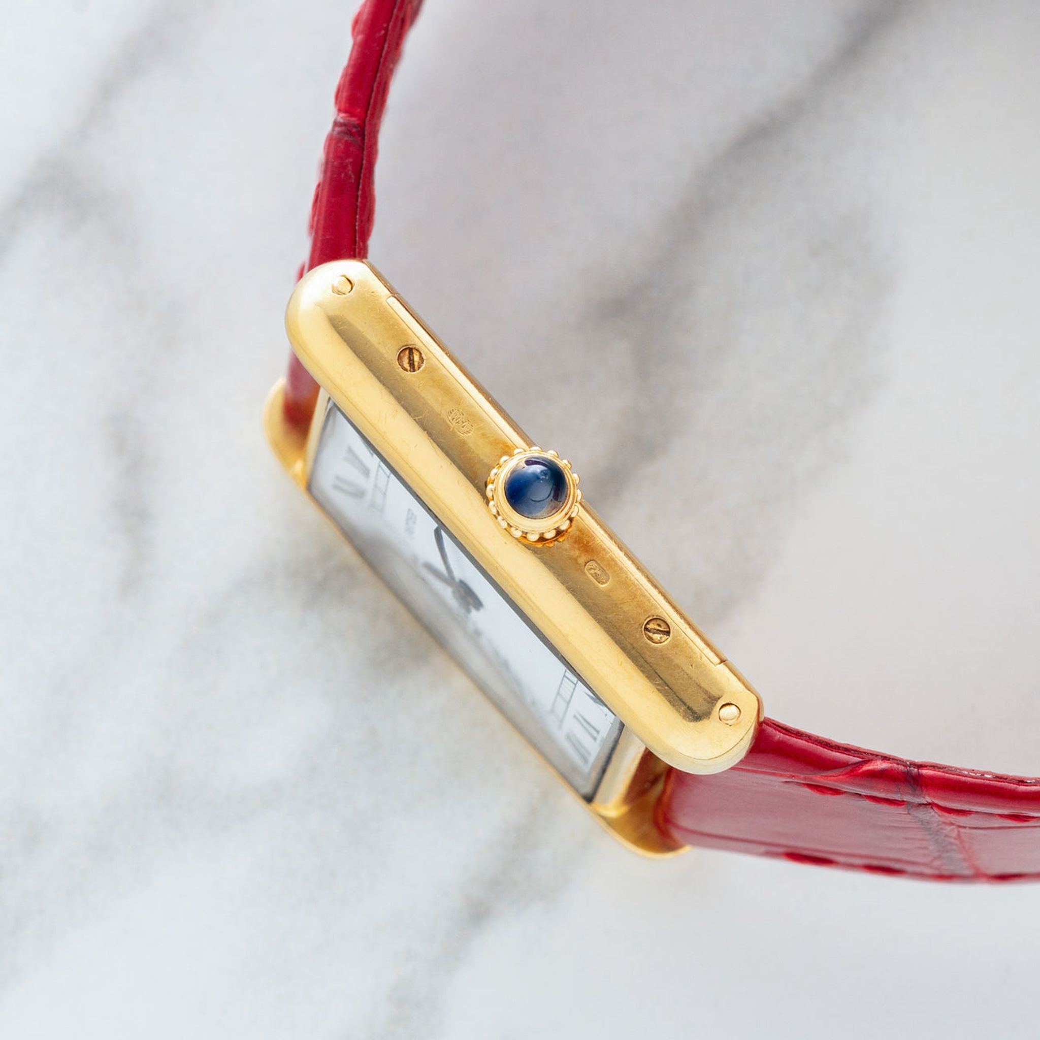 This Tank Louis, circa 1980s features a "Paris" signed dial with hidden signature at 7 o-clock. It also has the "elongated" cabochon which some might argue is more attractive. This piece has remained in stunning vintage condition for a Cartier of this era with a sharp unpolished case and nice looking dial. It comes accompanied with an 18k Cartier deployant buckle and Jean Rousseau gator strap in a glossy red which pairs up perfectly with the yellow gold case. It’s difficult to outdo the charm of a Tank Louis and this piece is a true show stopper, fit for a collector of any level.