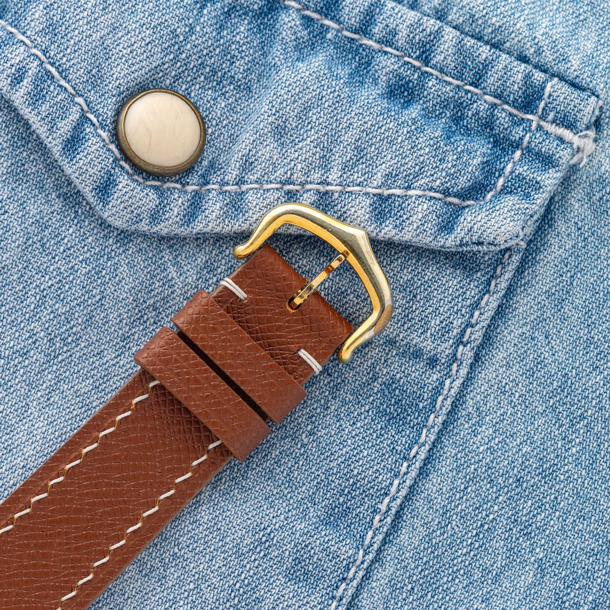 Bracelet: Two piece leather strap with generic plated buckle.