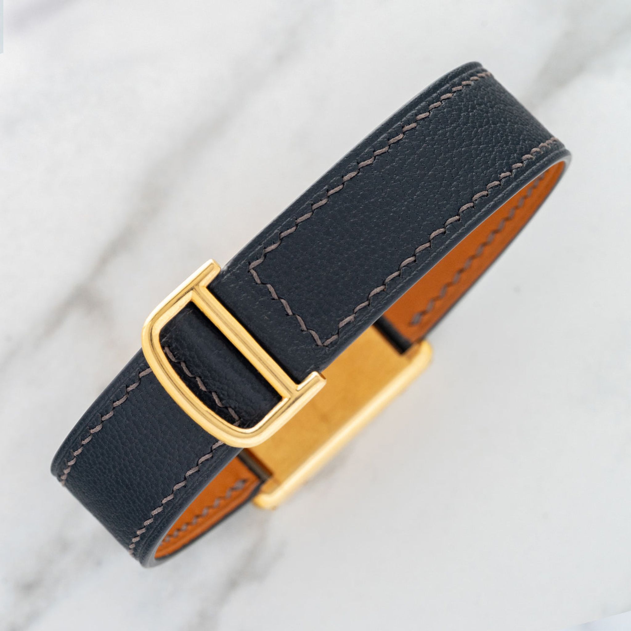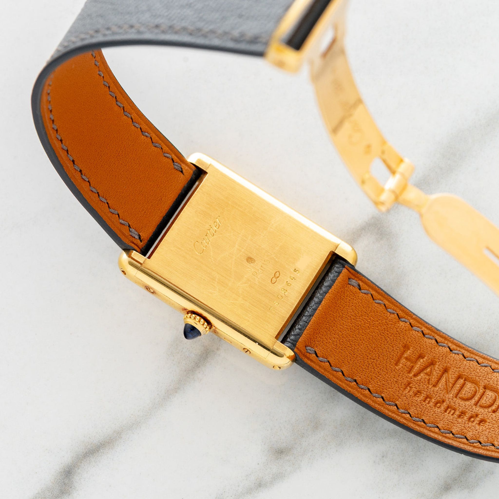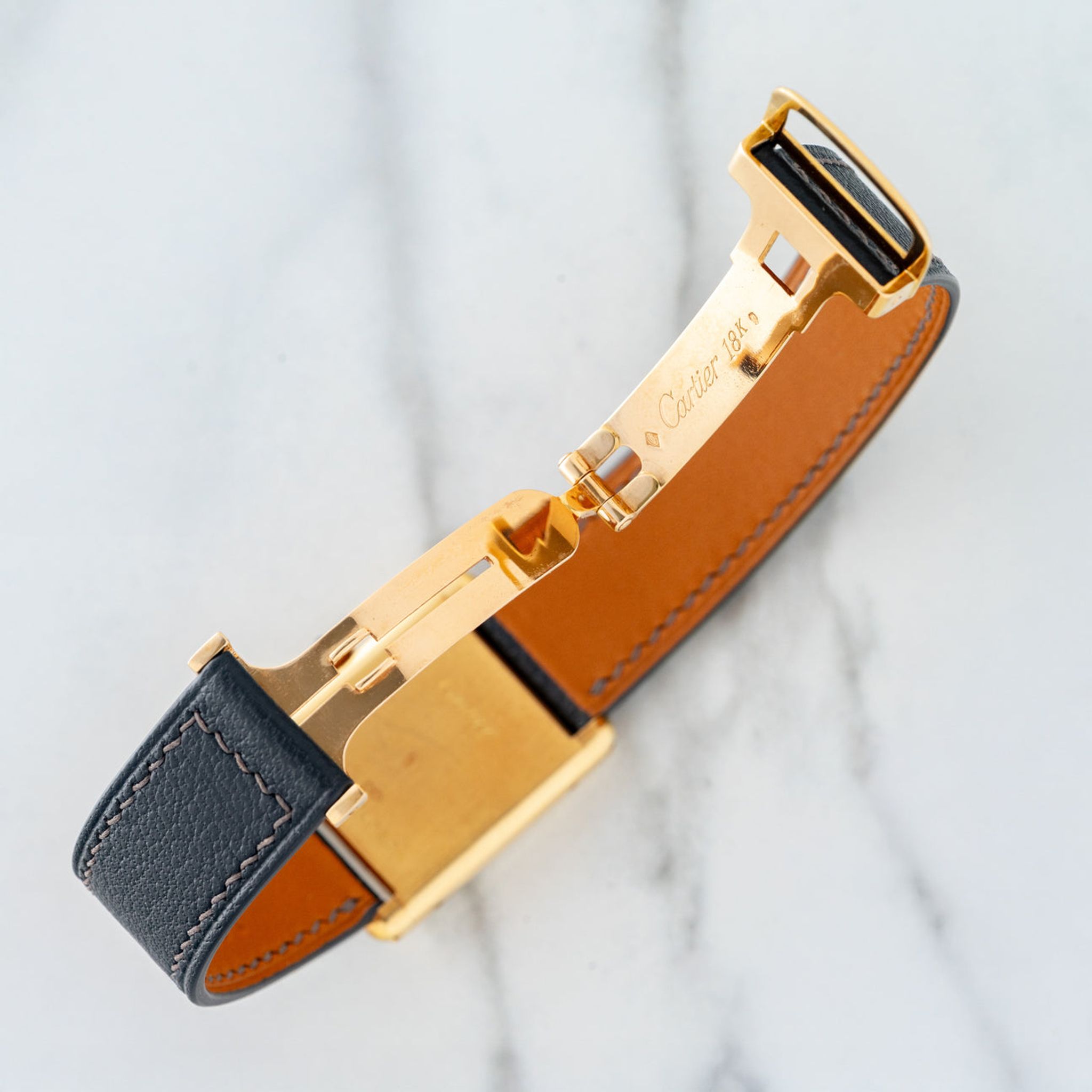 Bracelet: 18k Cartier deployant buckle. Two piece grained leather strap in grey.