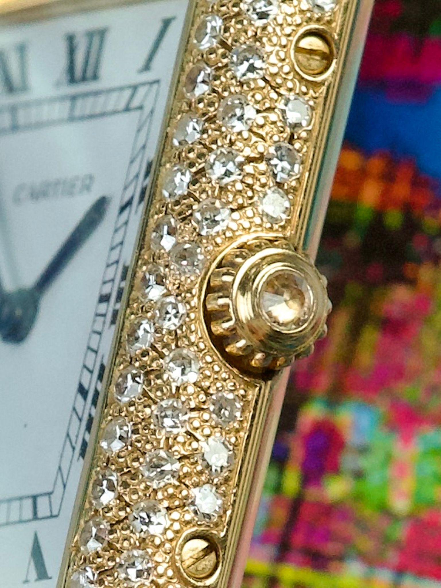 It features an 18k gold case measuring 30mm x 23mm, encrusted with Cartier factory diamonds!