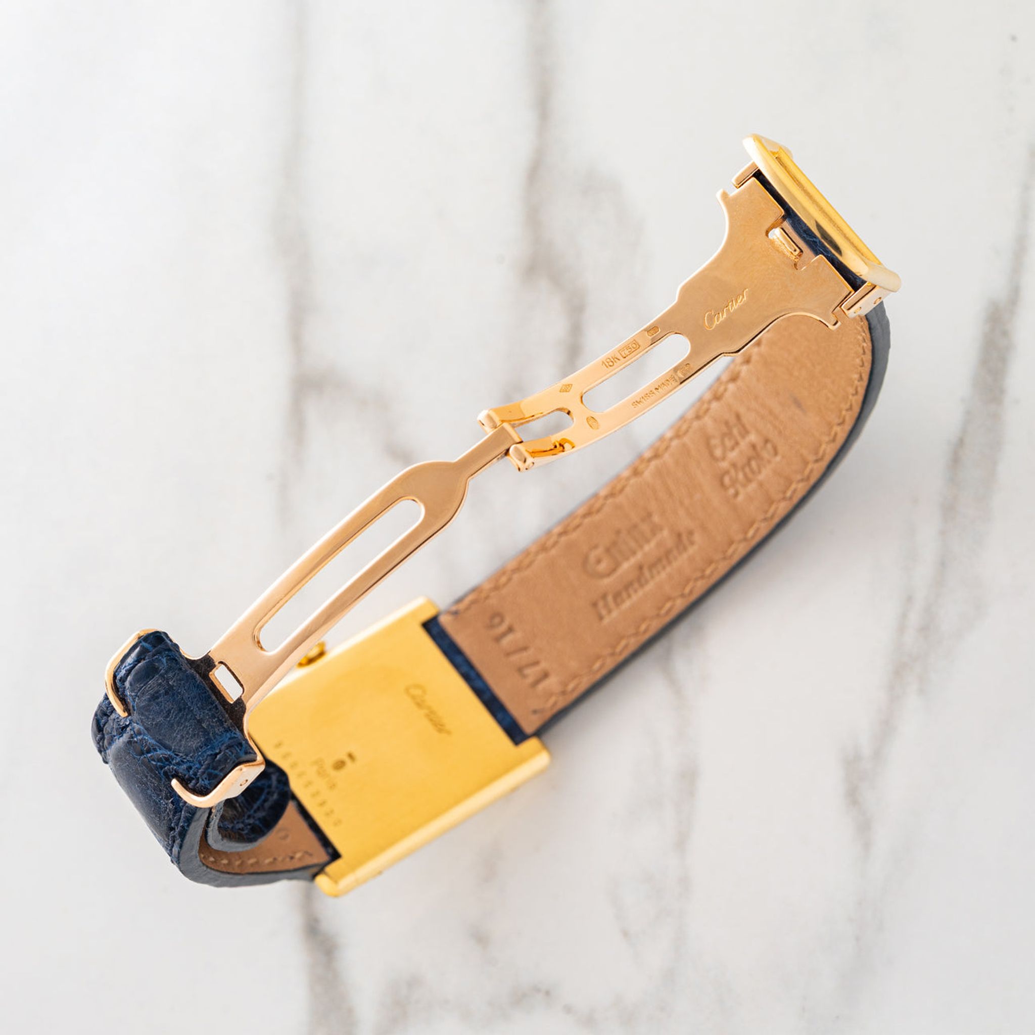 Accessories: Box, warranty papers, booklet and folder, deployant clasp. Genuine Cartier service pouch for storage and travel.