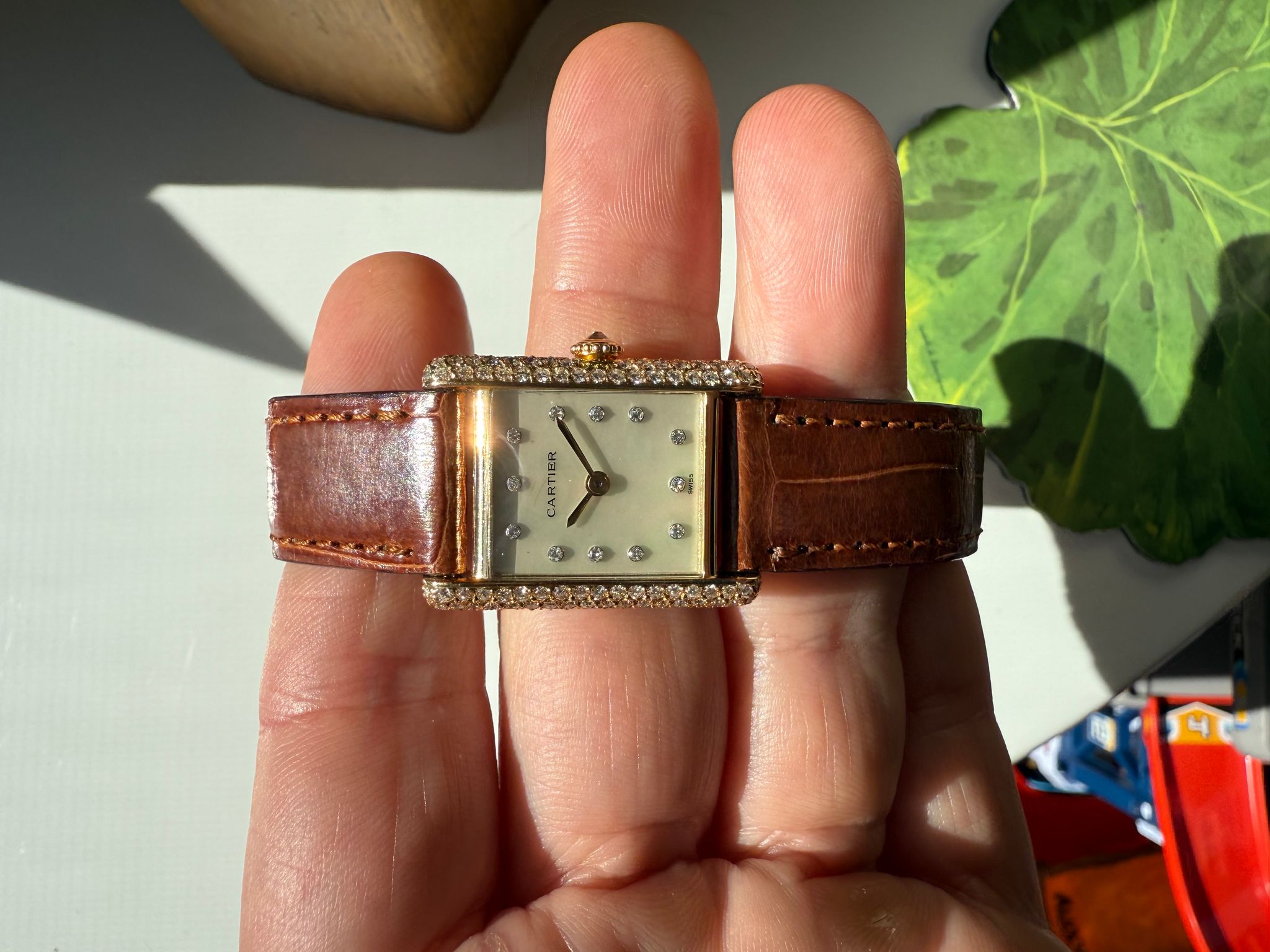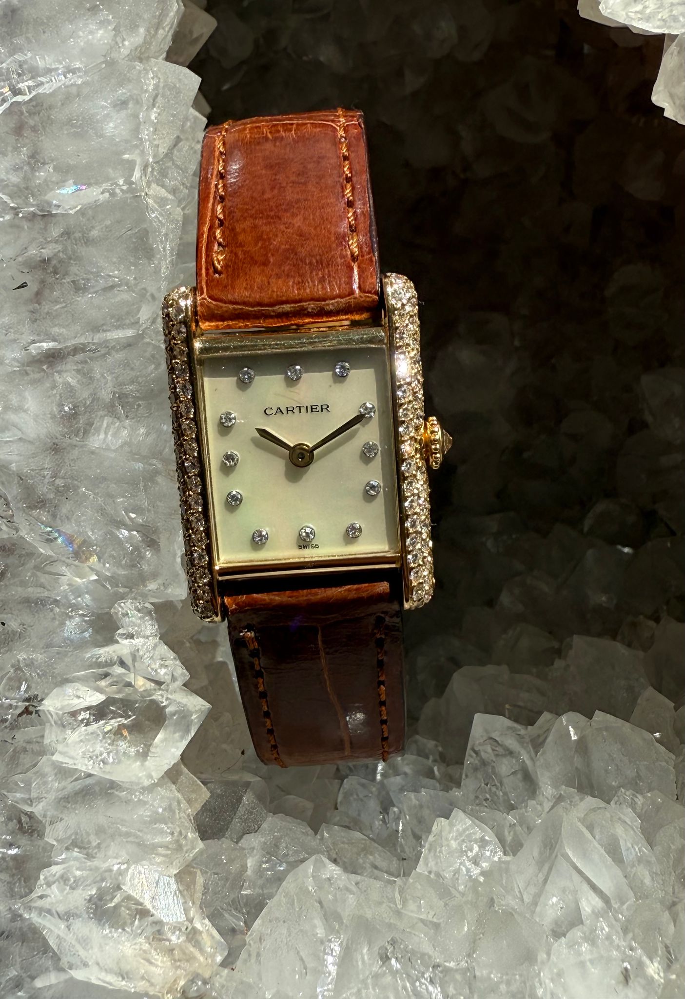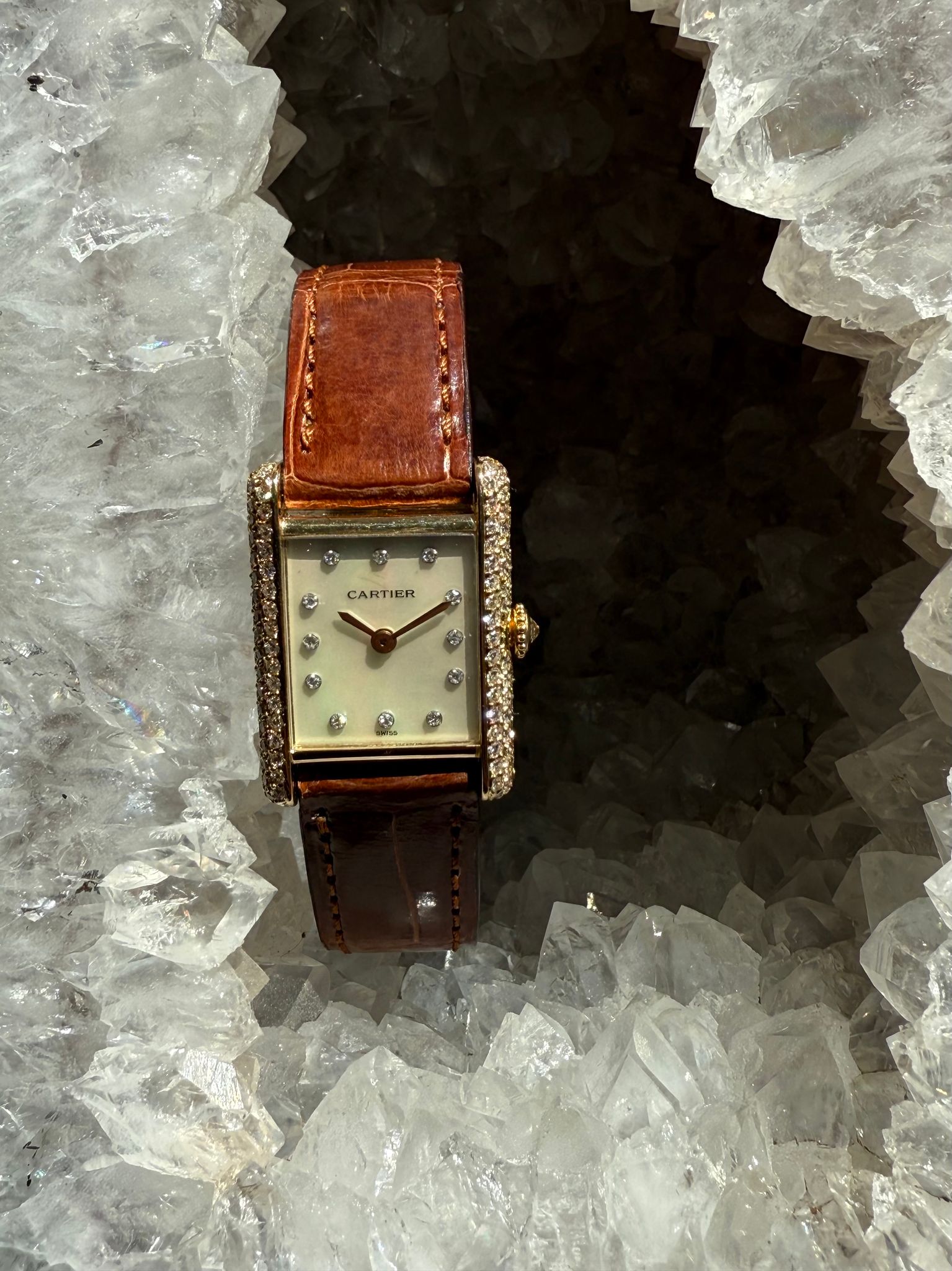 This unusual and rare Cartier Tank Louis features an 18K yellow gold case with a manual wind movement movement. This striking watch features a beautiful mother of pearl and diamond dial with diamond hour markers. The stunning dial accented to perfection with a factory set diamond case and matching diamond crown. The watch measures 20mm x 27mm and is fitted on a new Cartier