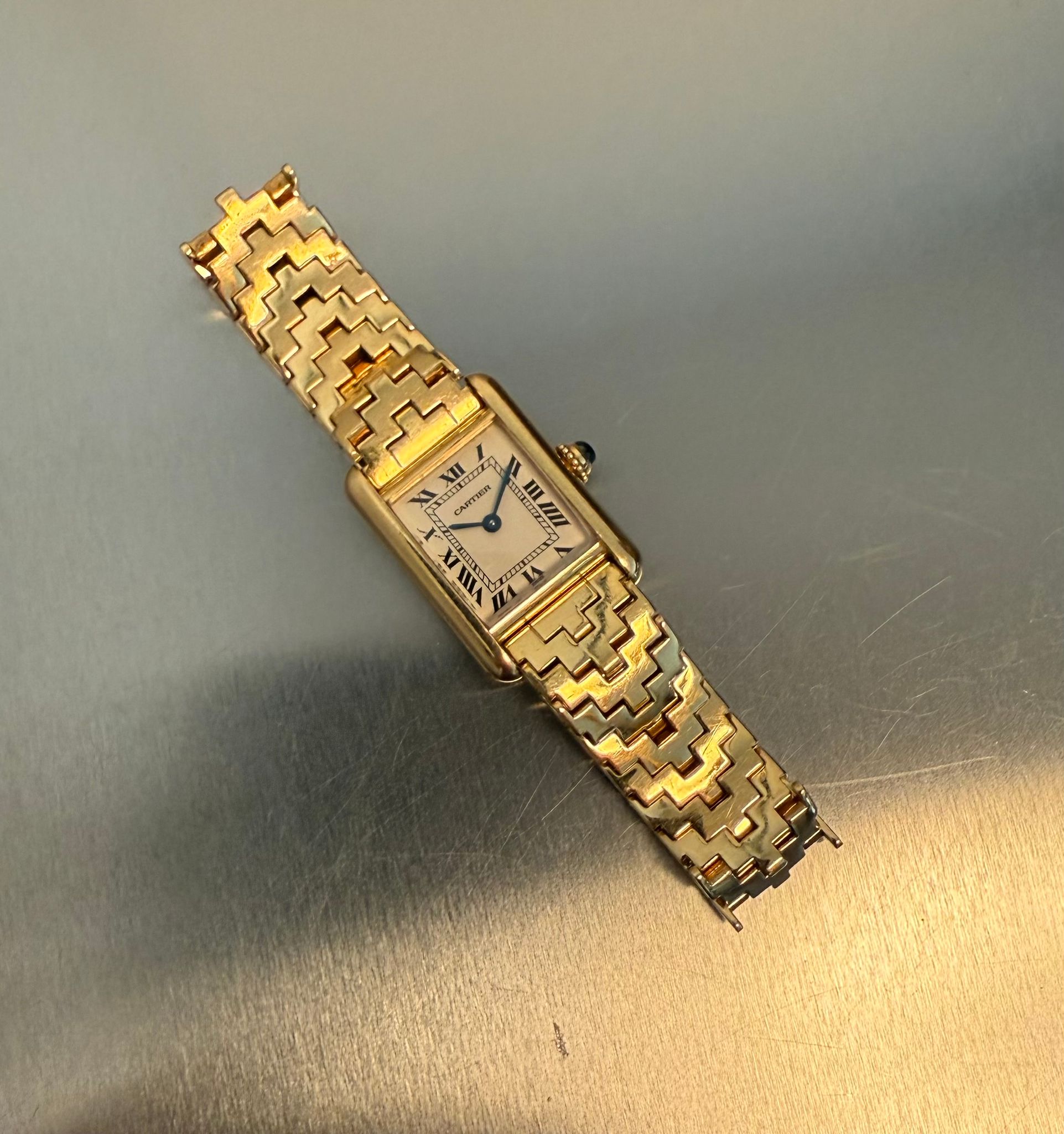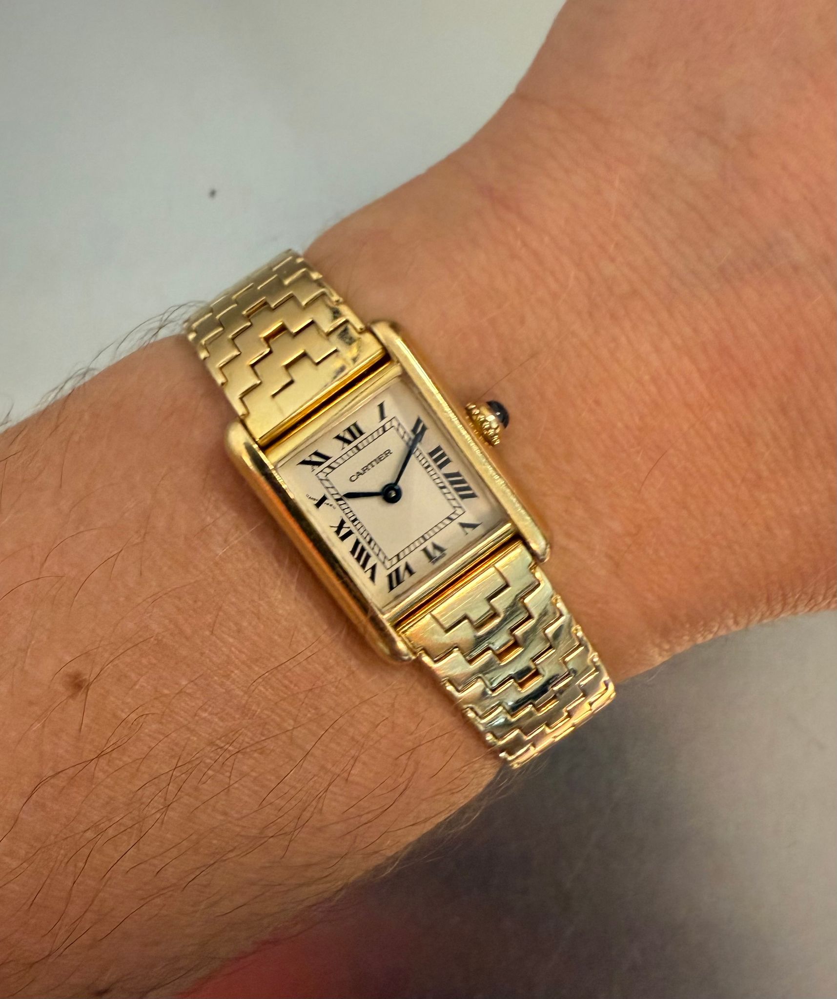 The Cartier Tank is an icon. It has graced the wrists of celebrities, dignitaries, and world leaders and has marked important milestones. The Cartier Tank is timeless. This Cartier Tank Louis (features a stunning shape measuring 16mm across and 24mm in length), a quartz movement, and a classic cream dial with black roman numerals. From the 1980s, this special example is truly a thing of beauty and it features a stunning look. The iconic Cartier Tank is accented by a stunning and rarely seen configuration in this size with a extremely rare pyramid Cartier bracelet.